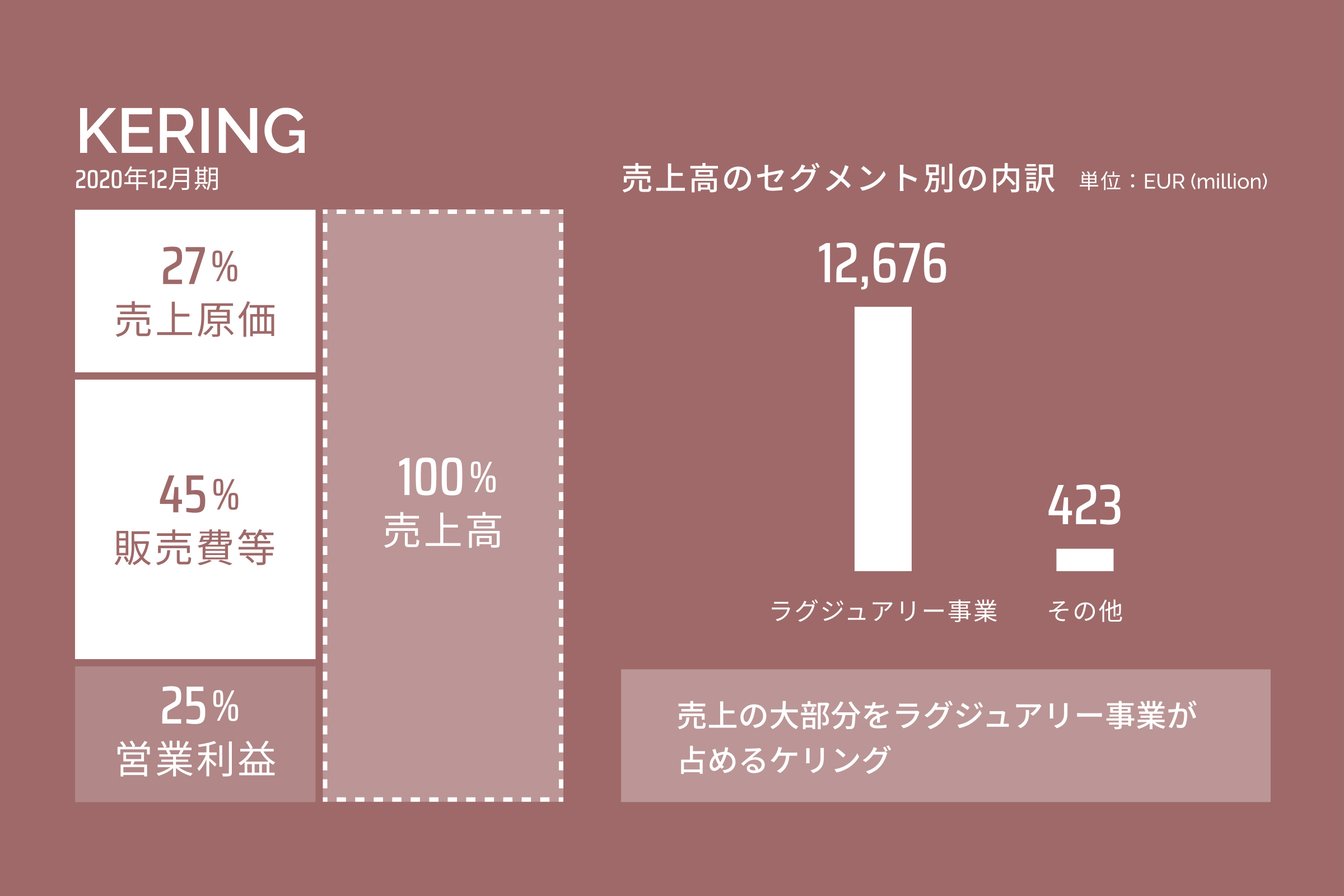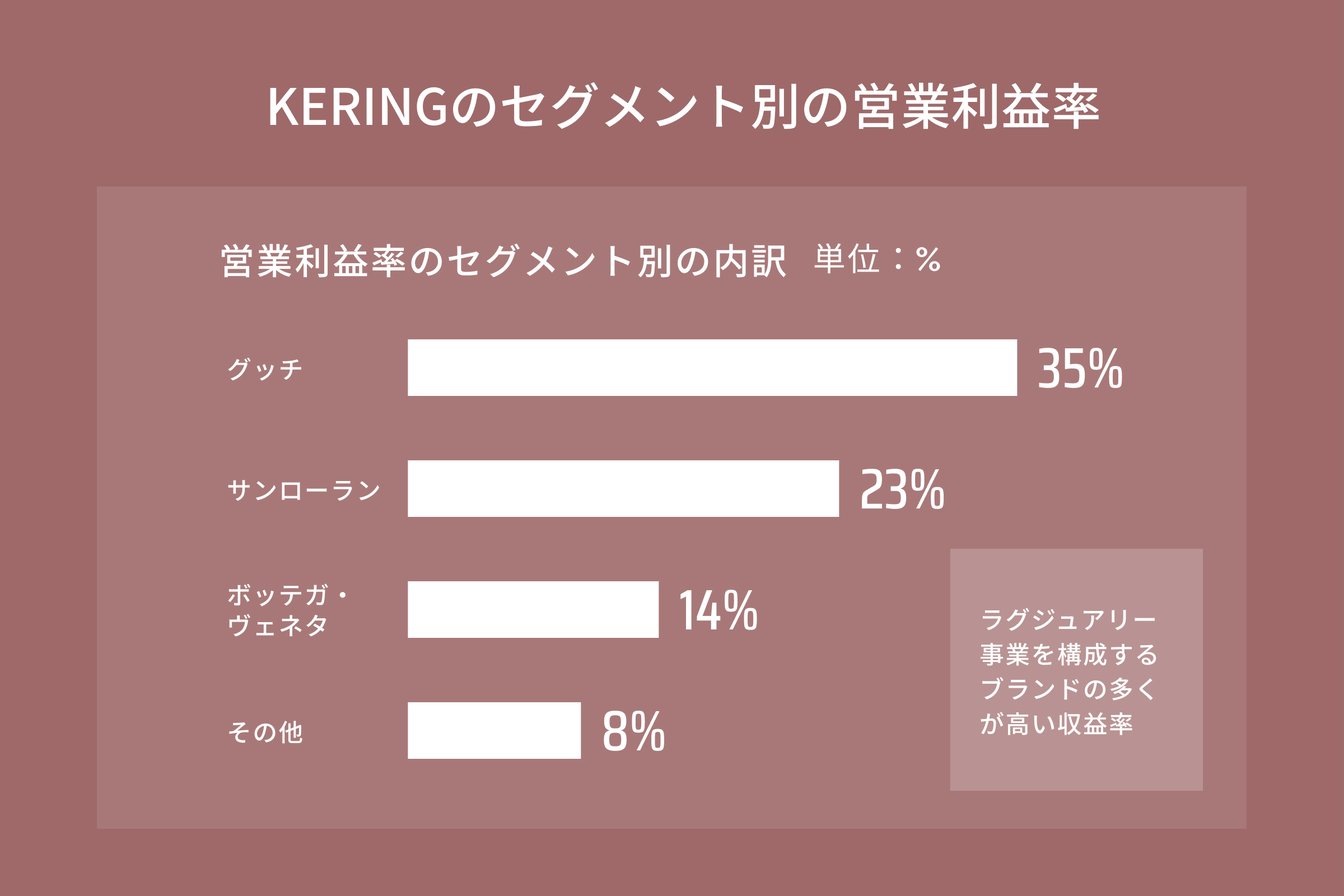 全体で見るとケリングの方が営業利益率が7%高いので高収益のように見えますが、その差は両社の展開している事業内容の違いが原因となっており、全体の数値のみでは優劣を正確に判断することはできません。