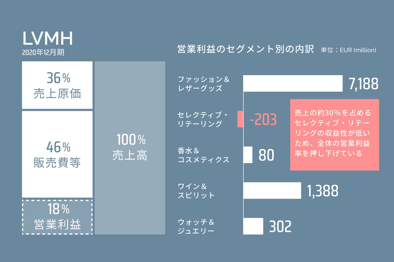営業利益率を見ると、利益率の高い部門と低い部門の差が大きく離れています。コロナの影響をそこまで大きく受けていない「ルイ・ヴィトン(LOUIS VUITTON)」や「ディオール(DIOR)」を扱うファッション&レザーグッズ部門と、ドンペリを扱うワイン&スピリット部門は高収益率を維持しています。