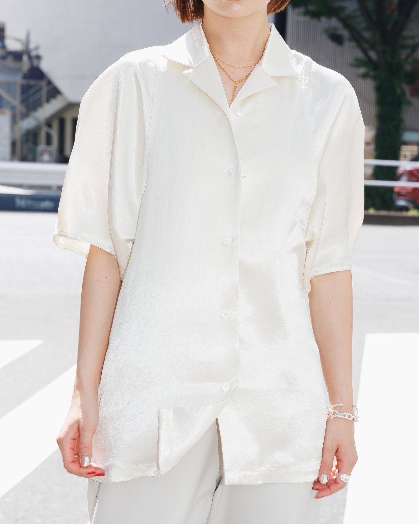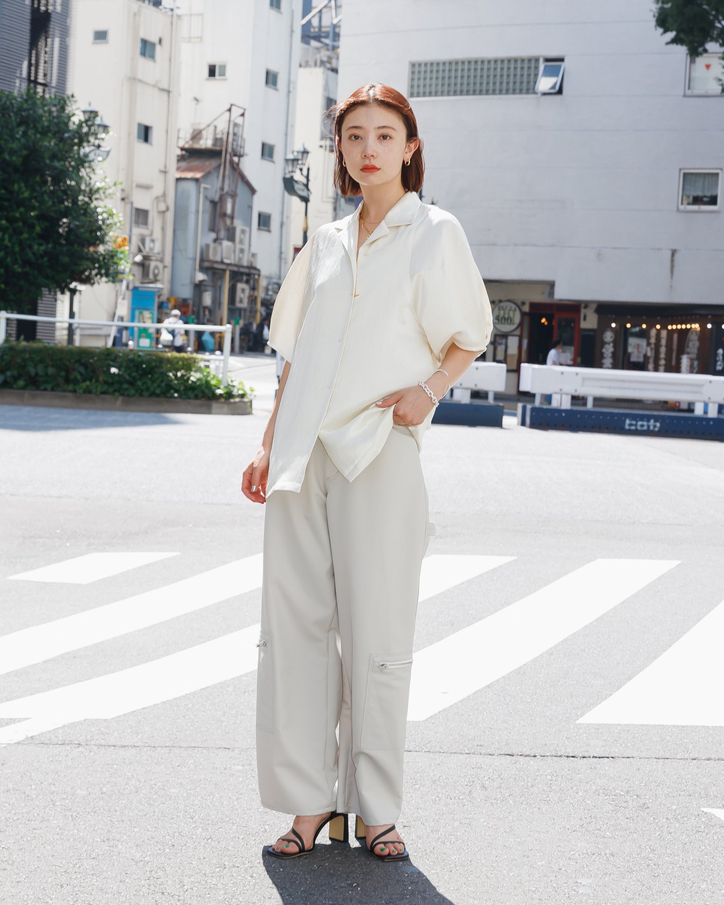 光沢感のあるサテンシャツ×ワークパンツのミックスコーデ。シャツにはヴィンテージ加工が施されており、程よいこなれ感を与えてくれる1枚です。