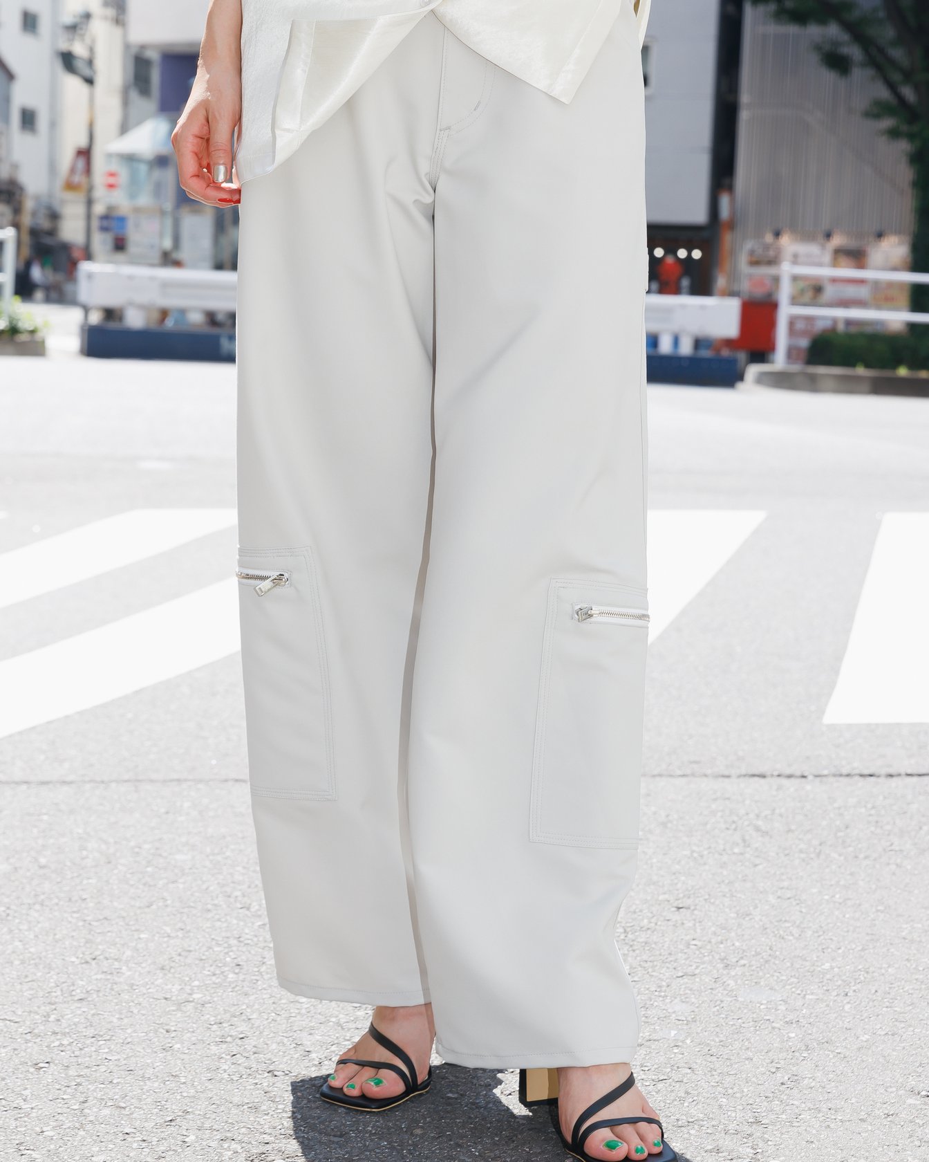 ジップ付きのシャツは首元を開けて抜け感を演出。ボトムスは刺繍パターンが施された陰影のある生地を使っており、ブラックカラーでも重くなりすぎずに着用できる1本です。