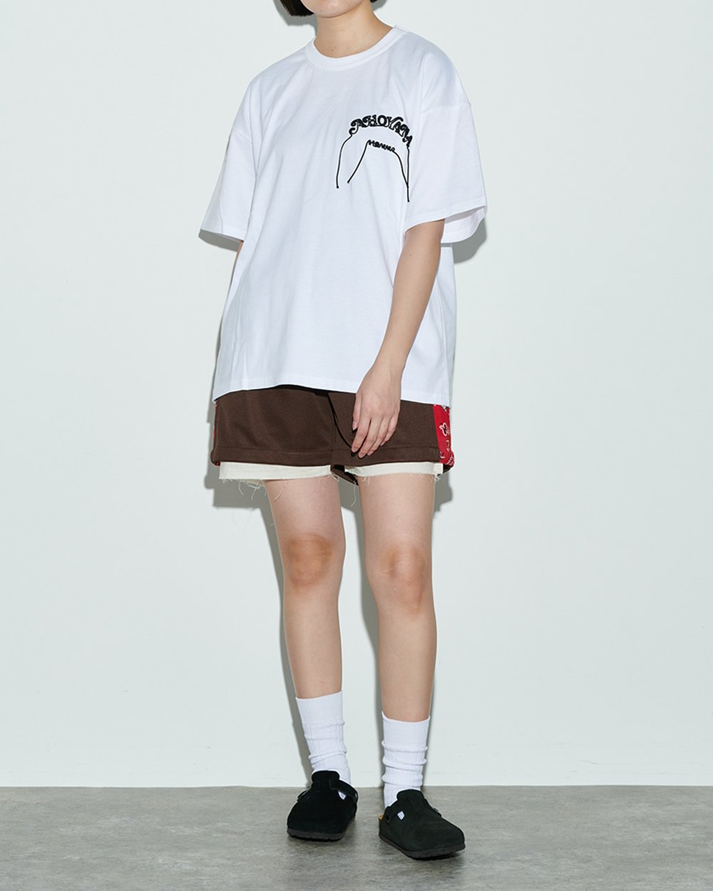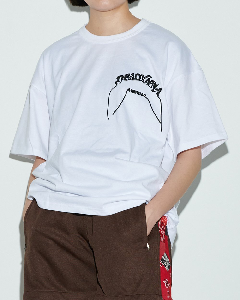 アルファベットのコード刺繍が目を惹くTシャツは「ヨシオクボ(yoshiokubo)」から。デザイナーのよく使うフレーズ「AHOYANA HONMA(ほんまアホやな)」と「SHIRANGANA(知らんがな)」を刺繍で落とし込んだシリーズは、ブランドらしいユニークな魅力を感じさせながらも、長めのスリーブなどゆったりとしたシルエットがスタイリングに取り入れやすい1枚です。コンパクトなショーツをあわせて、シルエットでメリハリを出すスタイリングが◎。