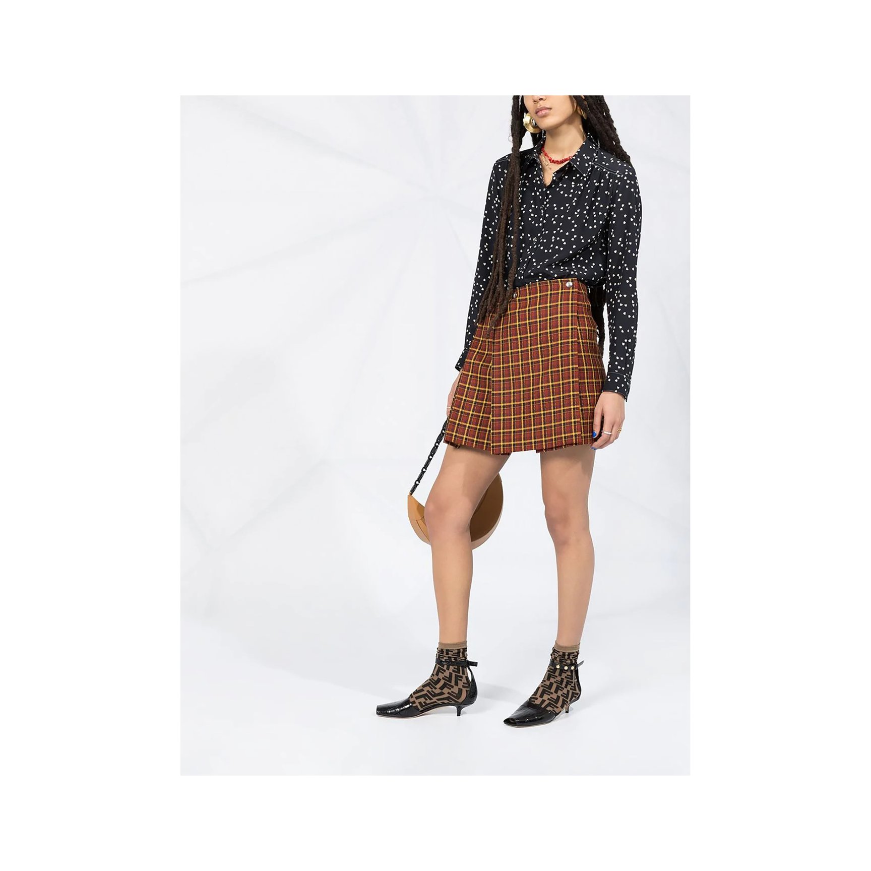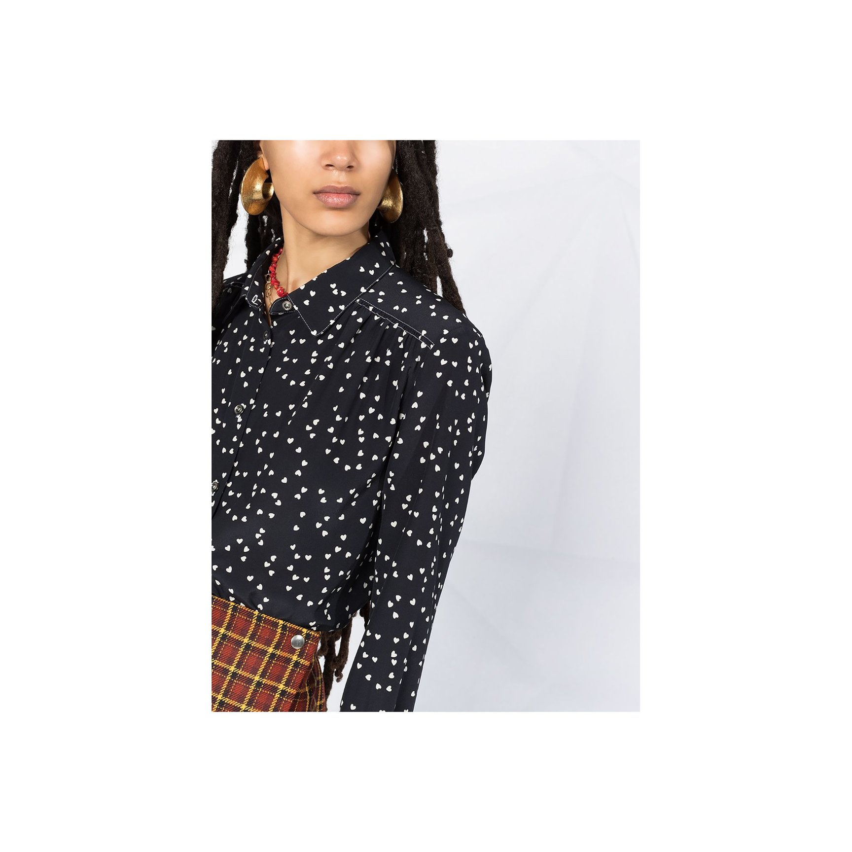 小さなハートモチーフが無数に散りばめられたスイートになりすぎない「アー・ペー・セー(A.P.C.)」のボタンシャツ。フレンチシックな着こなしが完成します。
