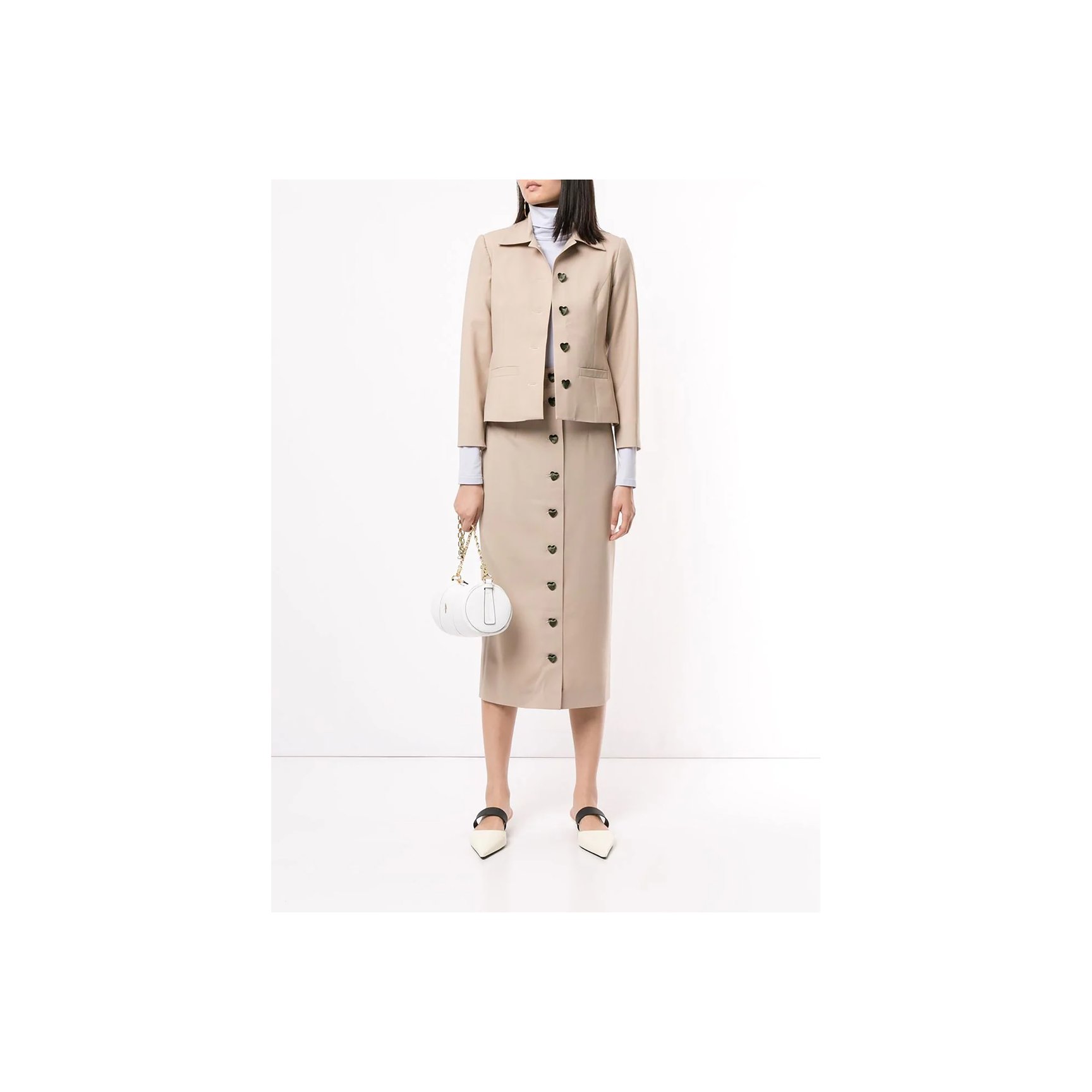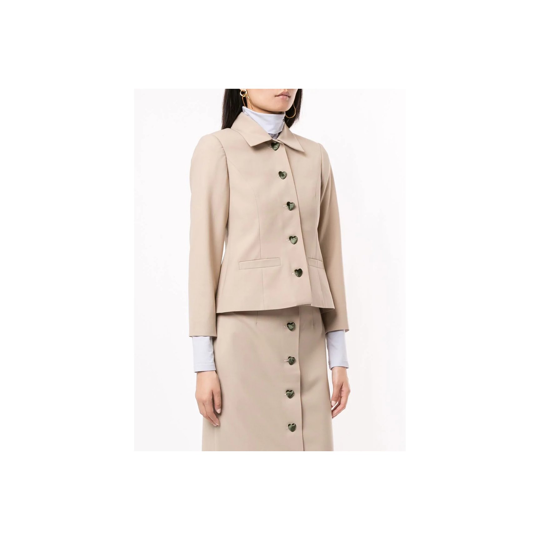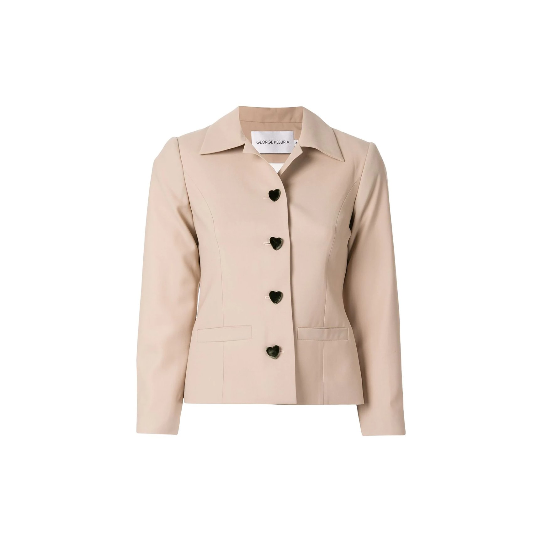 ジョージア出身デザイナーが手掛ける「ジョージ・ケブリア(George Keburia)」のジャケットは、ベロアのハートボタンがアクセントに。上品なベージュカラーもグッドガールなイメージを醸し出しています。