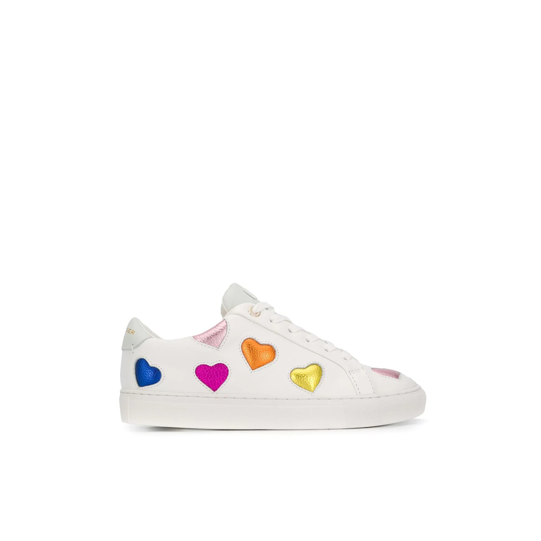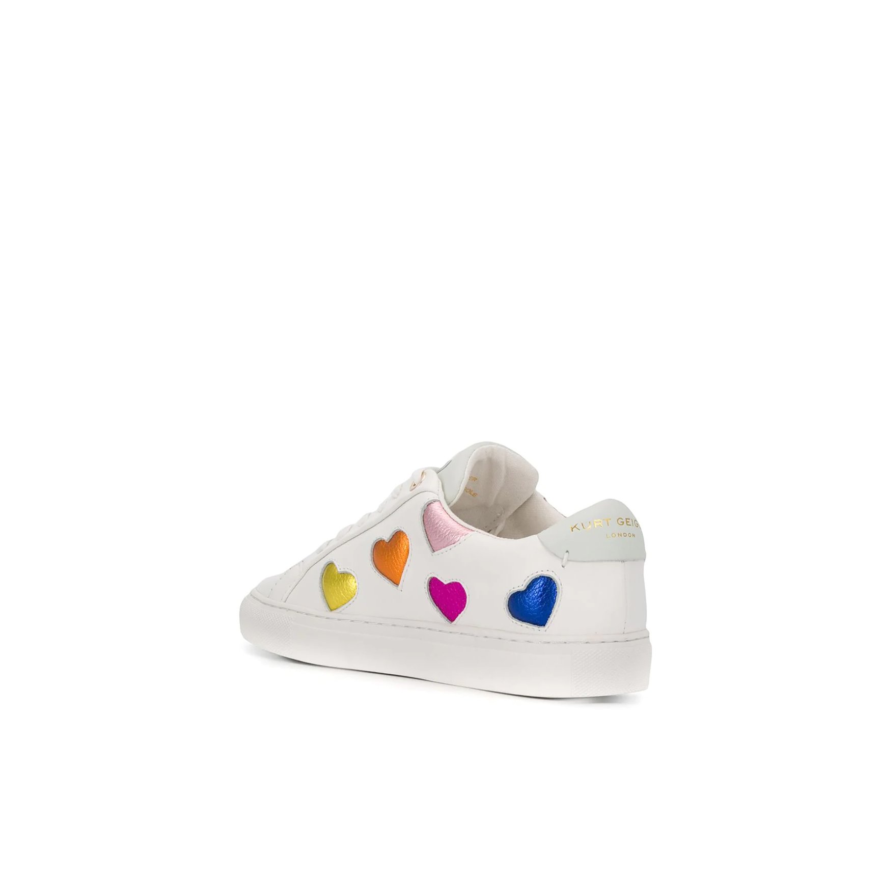 「カート ジェイガー ロンドン(Kurt Geiger London)」のスニーカーは、80sのティーンが履いていそうなレトロなムードがたまりません。ホワイトレザーのスニーカーに、メタリックハートモチーフがカラフルな彩りを添えています。デニムに合わせたい一足。
