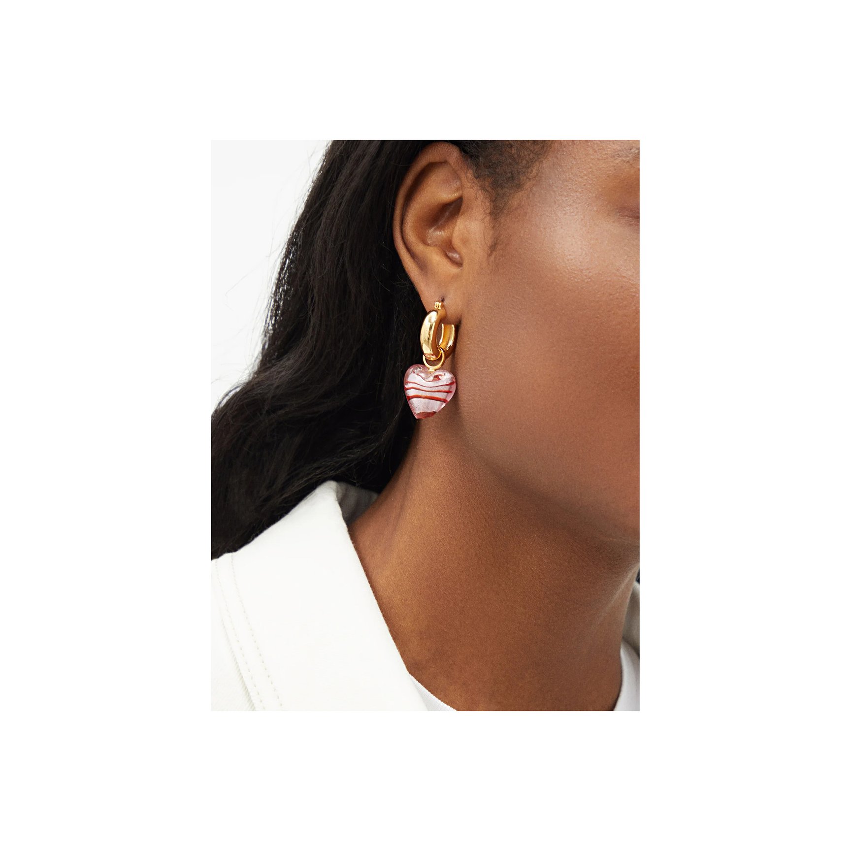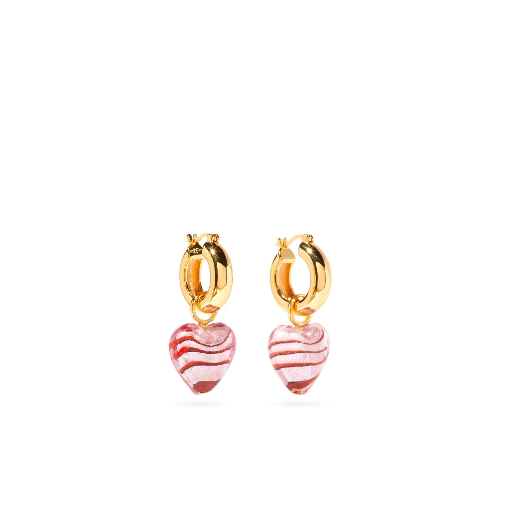 まるでキャンディーのようなフォルムと透明感が際立つ「リジー フォルトゥナート(Lizzie Fortunato)」のガラス製ハートモチーフのピアスです。ピンクとレッドのボーダーパターンのハートは、職人のハンドメイド。ころんとしたチャンキーなフープとの相性も抜群です。