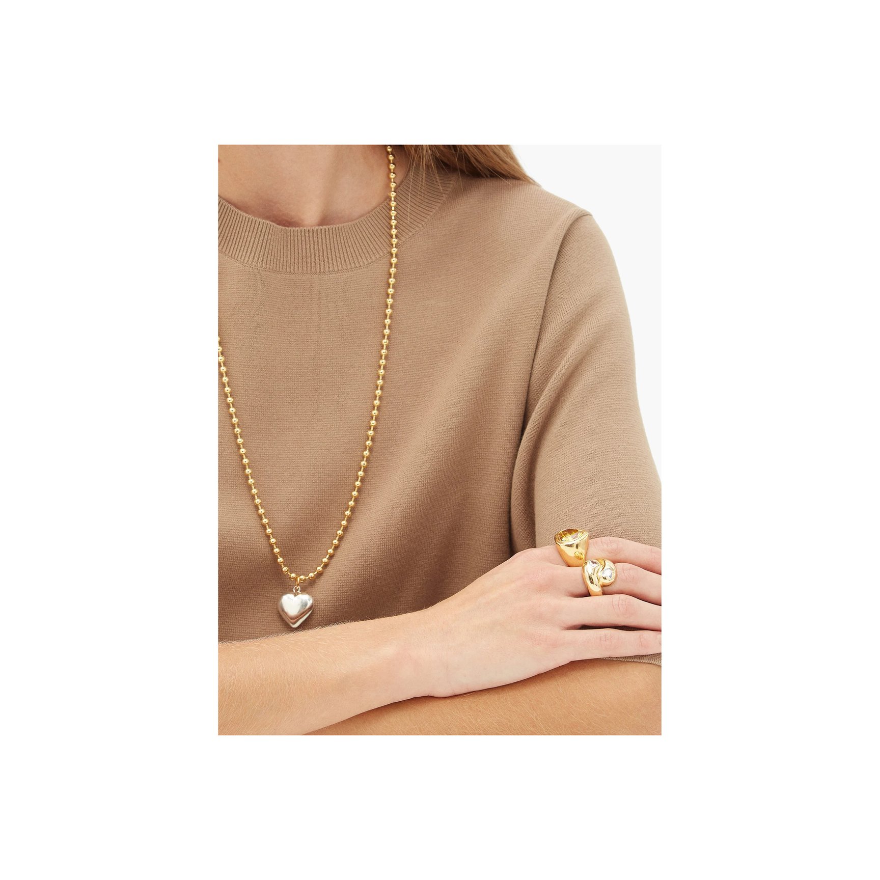 たっぷりのクリスタルがあしらわれた大ぶりのハートモチーフが目を引く「ヴェトモン(VETEMENTS)」のネックレス。主役級アクセをストリートスタイルに一点投入してみては?