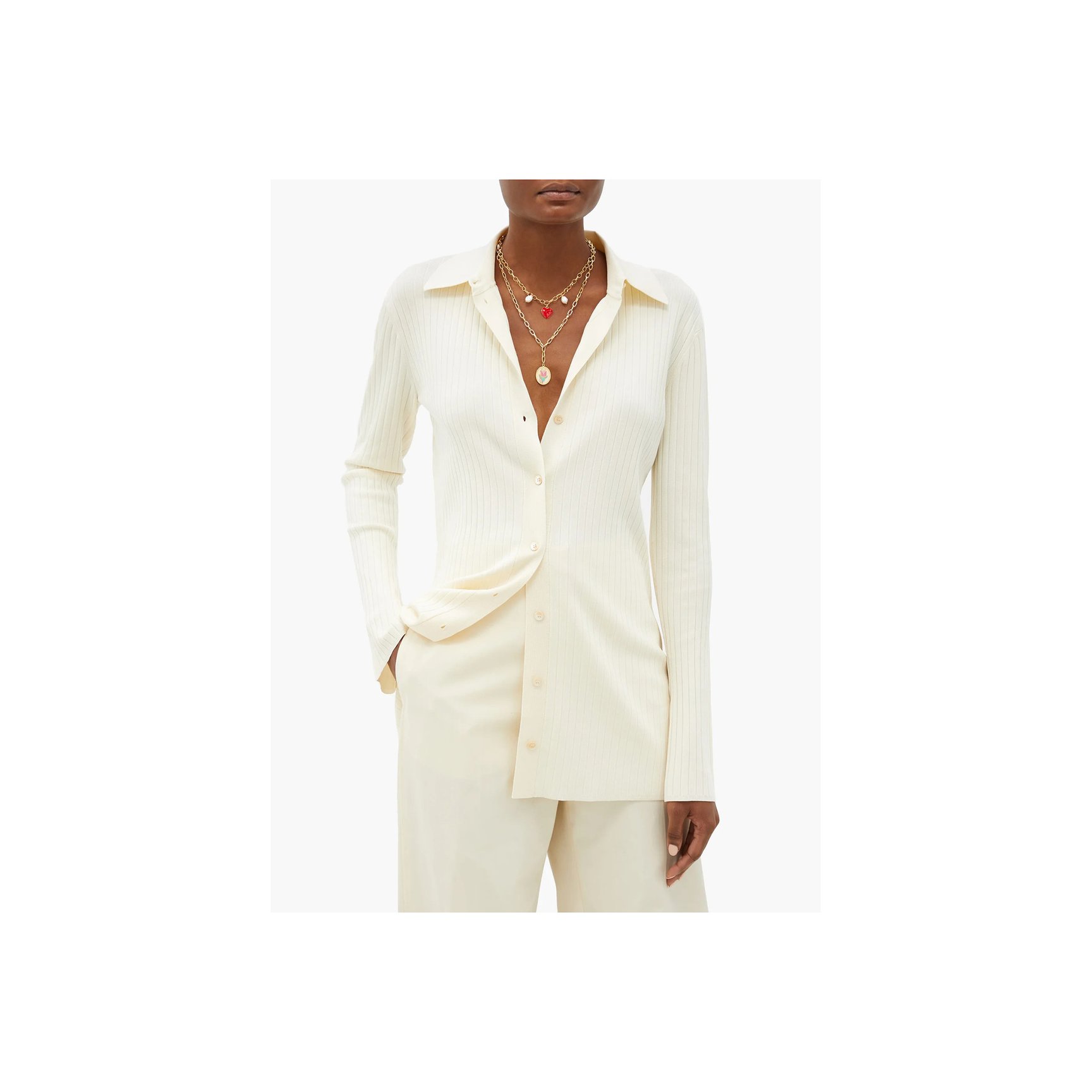 「チンティ&パーカー(CHINTI & PARKER)」のスカートは、シルクの光沢感を活かしたドレープがフェミニンな雰囲気。