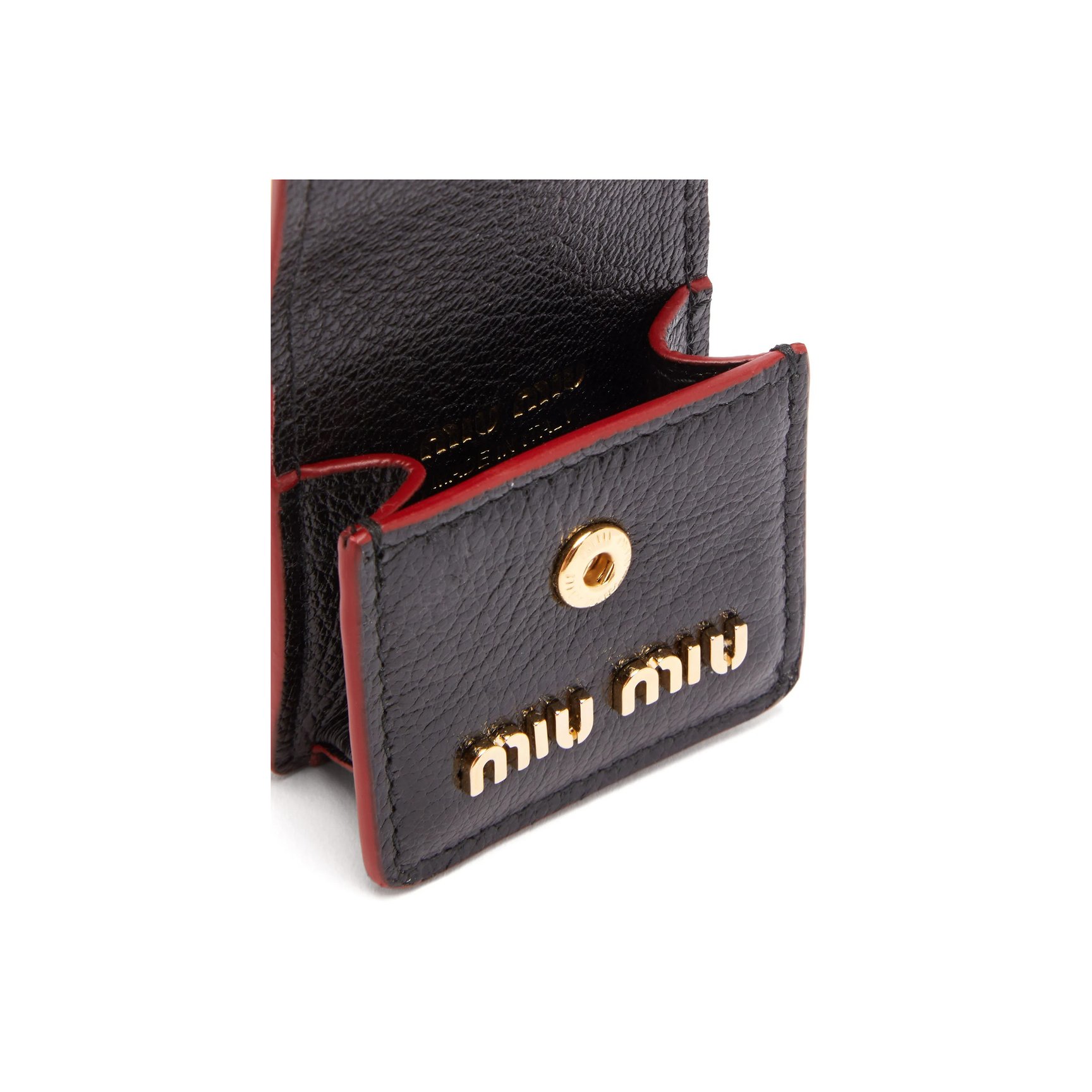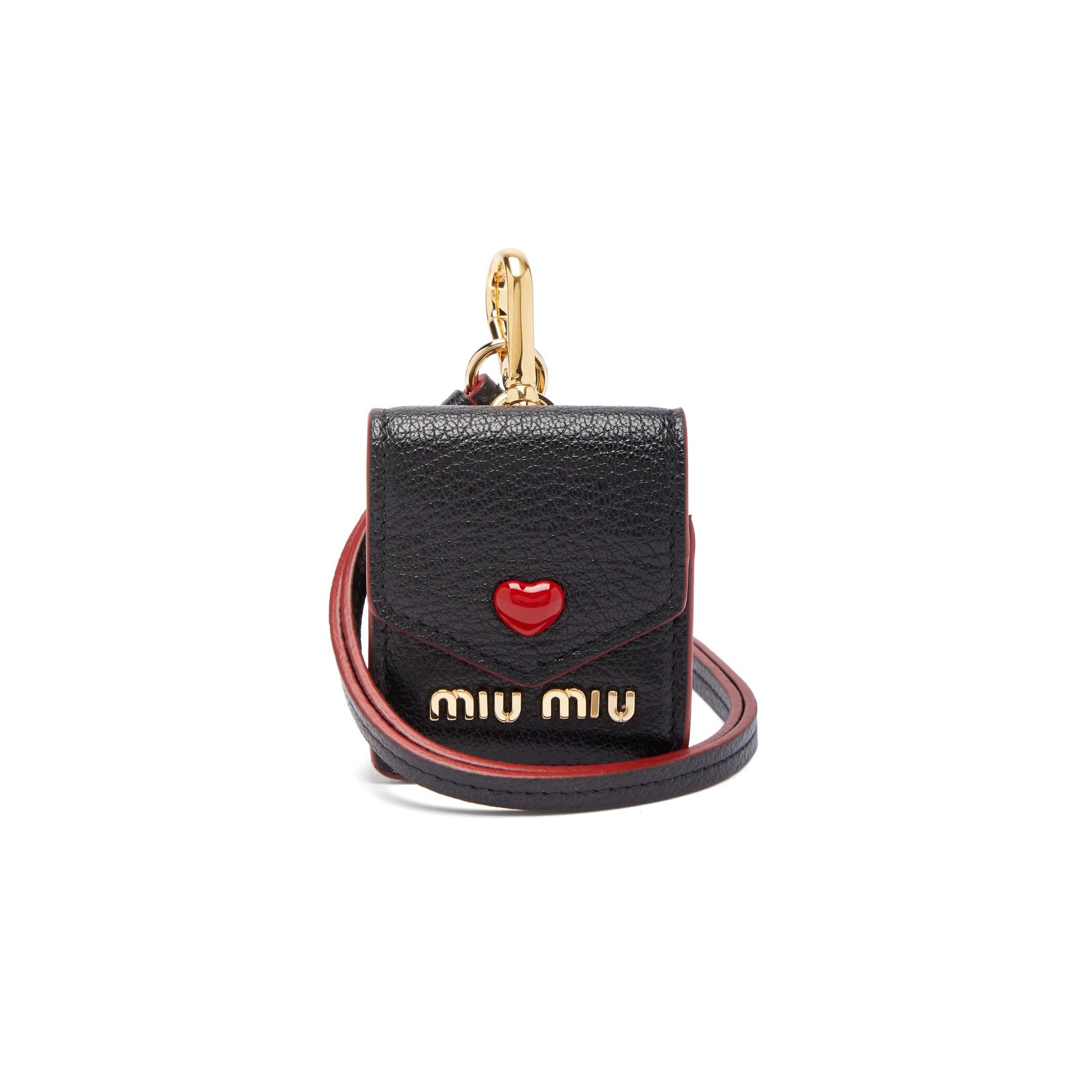 「ミュウミュウ(MIU MIU)」のネックストラップ付きのAirPodsケースは、エンベロープスタイルのフロントとハートのスタッズがポイント。付属のネックストラップのアレンジも楽しめます。