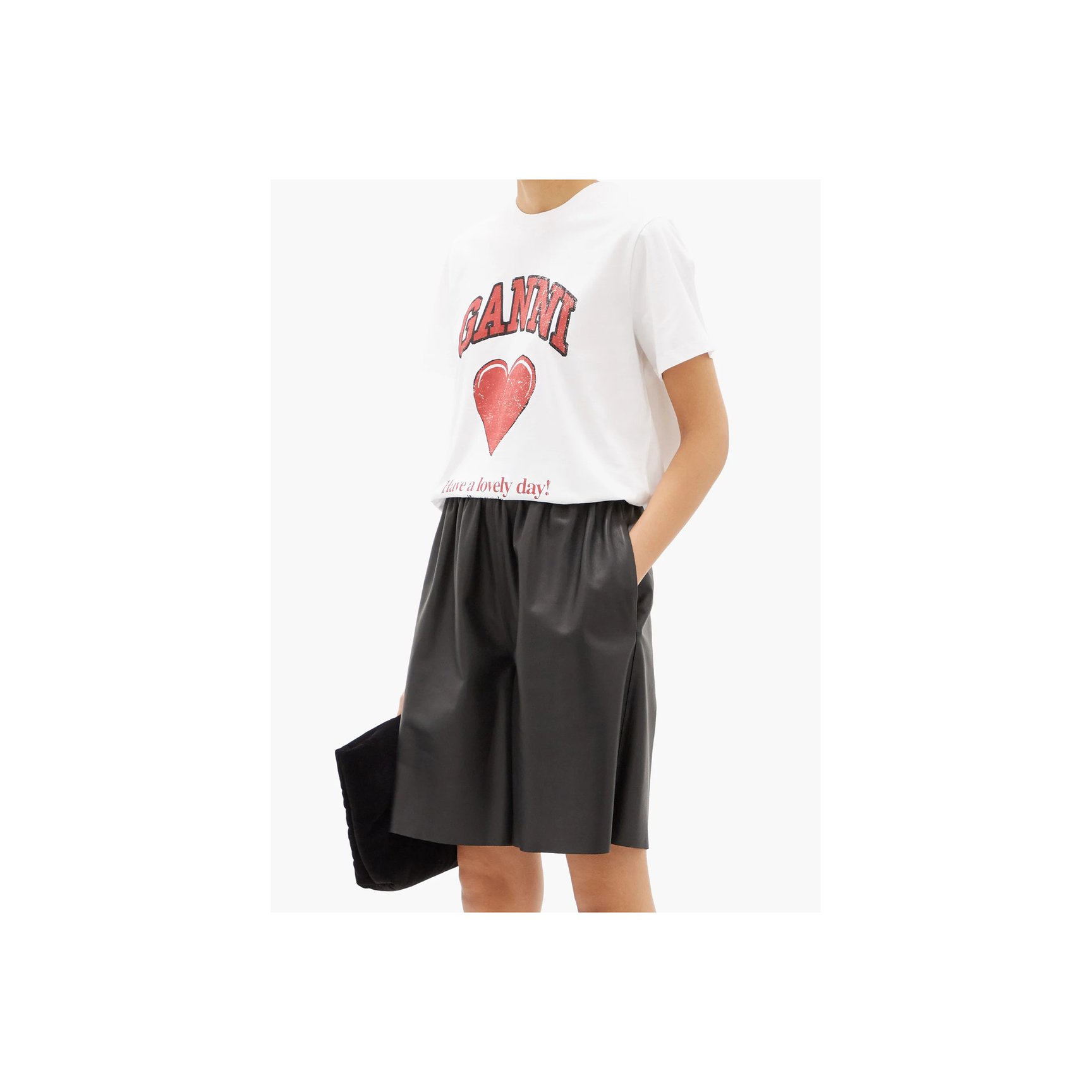 チアフルなスローガンとハートを組み合わせたカレッジTシャツを彷彿とさせるデザインは、「ガニー(GANNI)」のもの。オーガニックコットンを使用したさらりとした肌触りです。