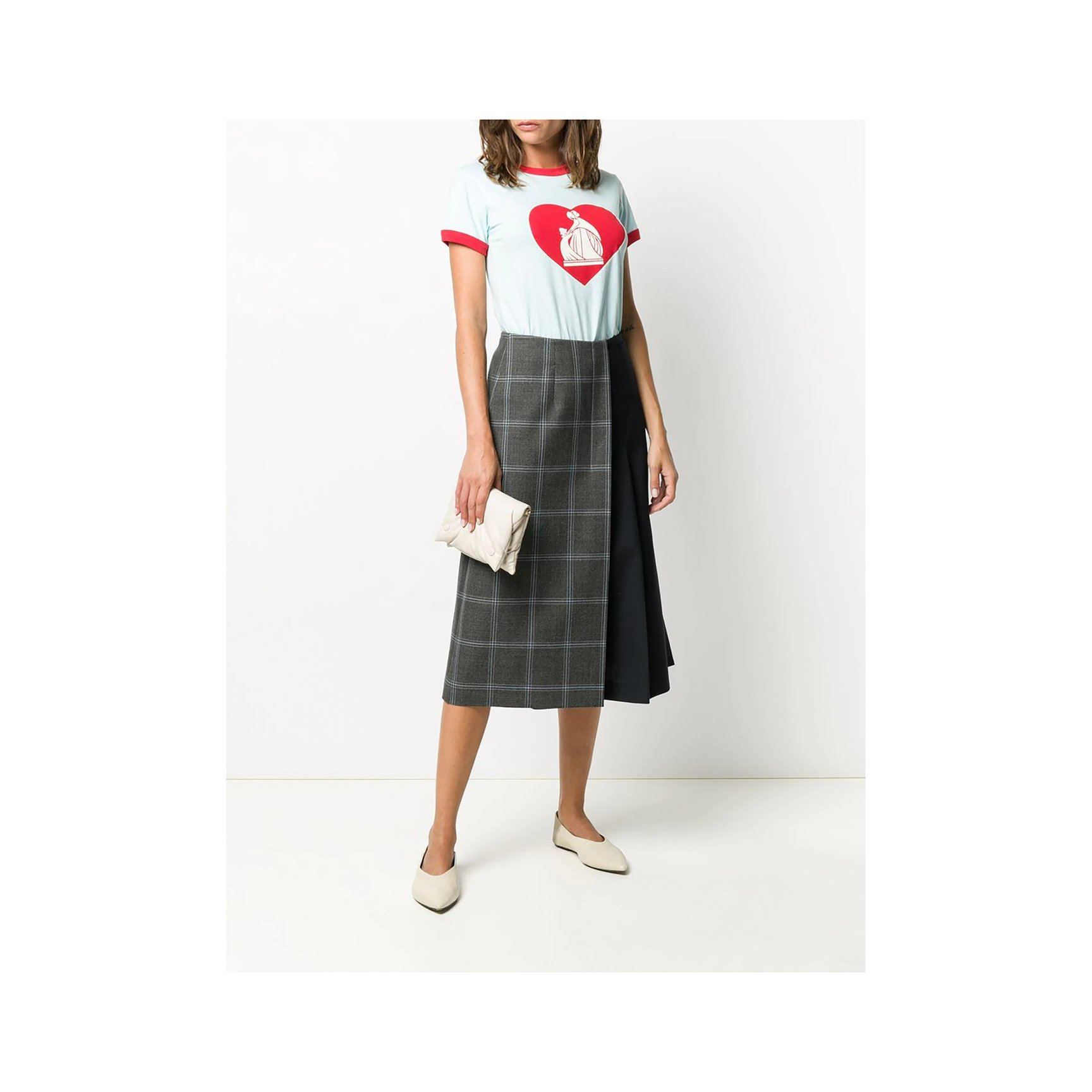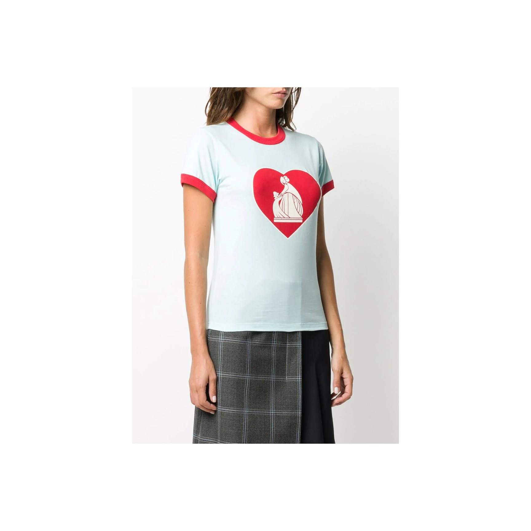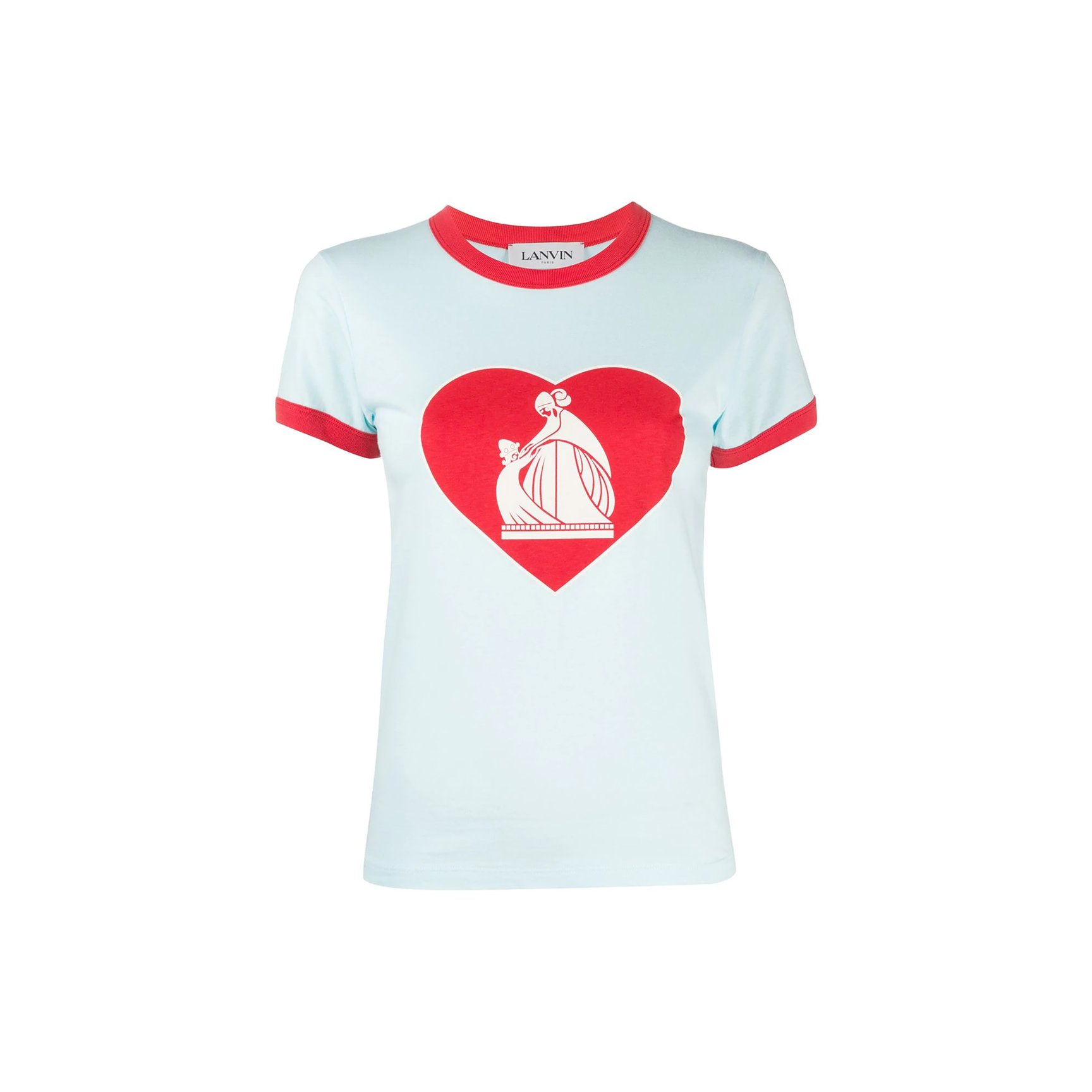 ブランドロゴとハートを大きく胸元にあしらった「ランバン(LANVIN)」のレトロなムードのリンガーTシャツ。ペールブルーとレッドの組み合わせがガーリーな印象です。