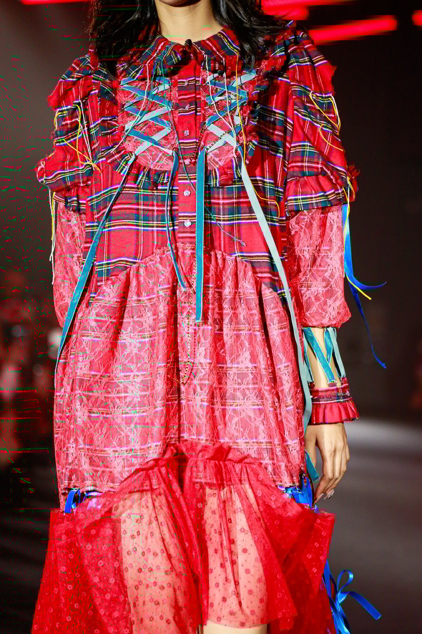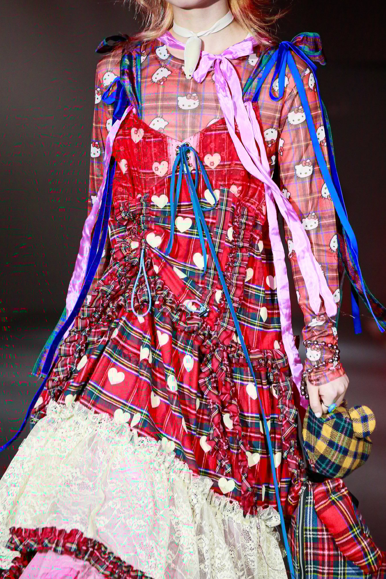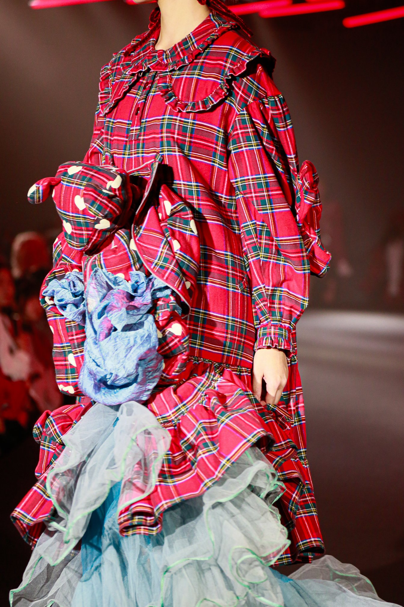 コレクション全体を通して、ヘイヘイのブレないシグネチャーを提示しながらも、新しい表現を模索するような姿勢も印象的。シグネチャーである赤チェックを基調にしながらも、リボンや異素材との組み合わせが新鮮なルックが多く登場した。