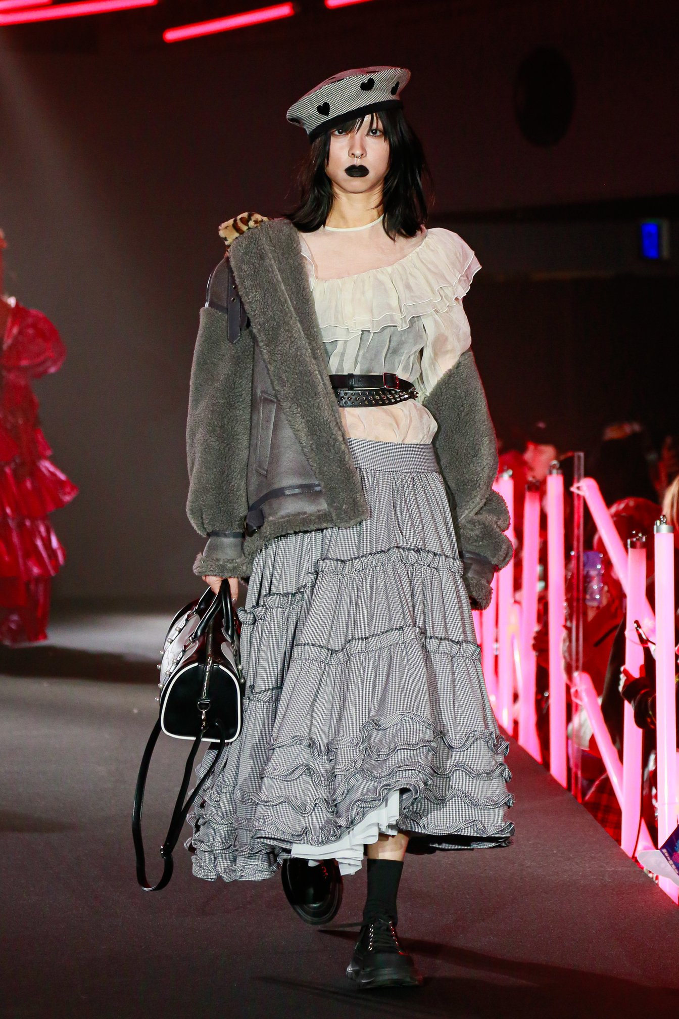 音楽は、日本とアメリカを中心に活動する韓国人プロデューサー兼DJのNight Tempoが担当。ショーの冒頭の楽曲は、未来の東京のイメージとして想起させる、大友克洋作「AKIRA」のアニメーション映画のオープニングをサンプリングして制作したという。ファーストルックは、AKIRAの主人公である金田がバイクを停める印象的なシーンをイメージし、疾走感のあるウォーキングで表現。ブランドのシグネチャーカラーと金田を想起する赤を基調としたルックに、ブランドを象徴するチェック柄のリボンあしらったヘルメットを着用したモデルが登場した。ヘルメットは戦隊ヒーローのイメージを引用し、モデルがヘルメットを外すと、地面にパラパラとリボンが落ちるという演出が加えられた。