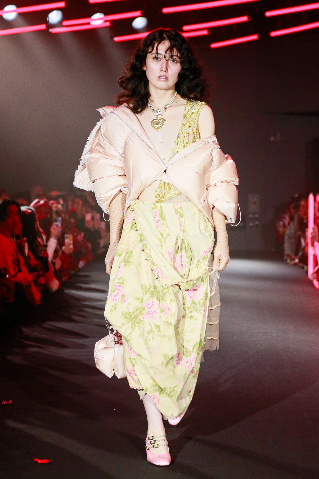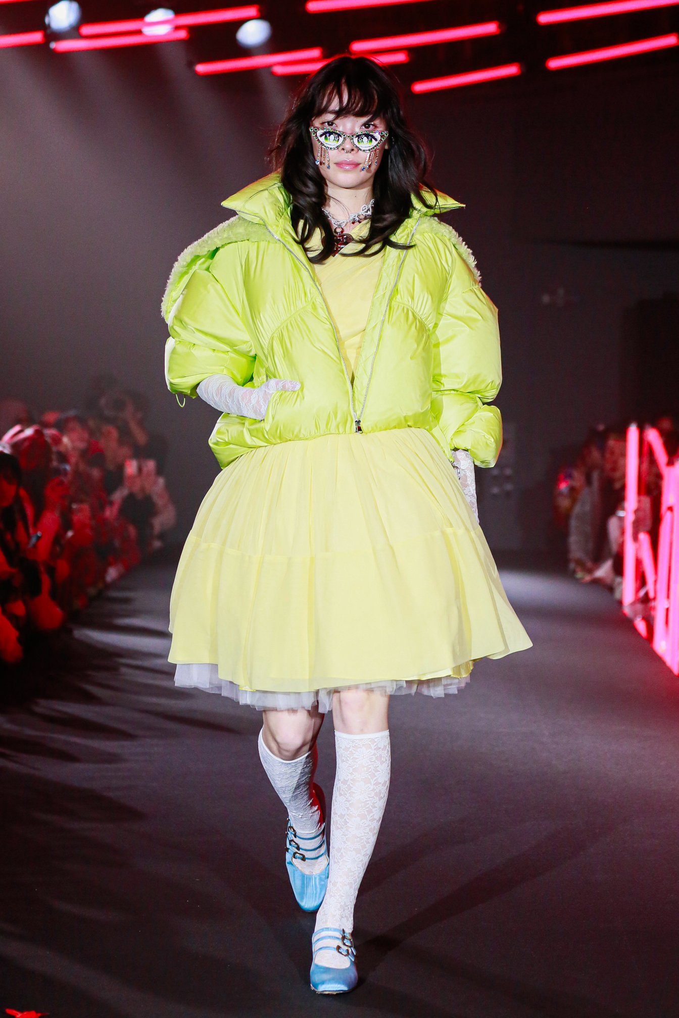 2000年〜2010年代の原宿を想起するような懐かしさのあるニュアンスのレイヤードや色合いの中で、ブランドとしては珍しいネオンカラーを取り入れるなど挑戦的な表現も見られた。