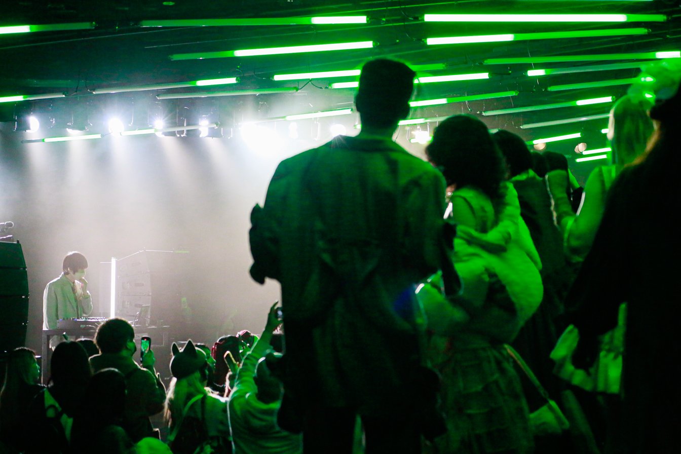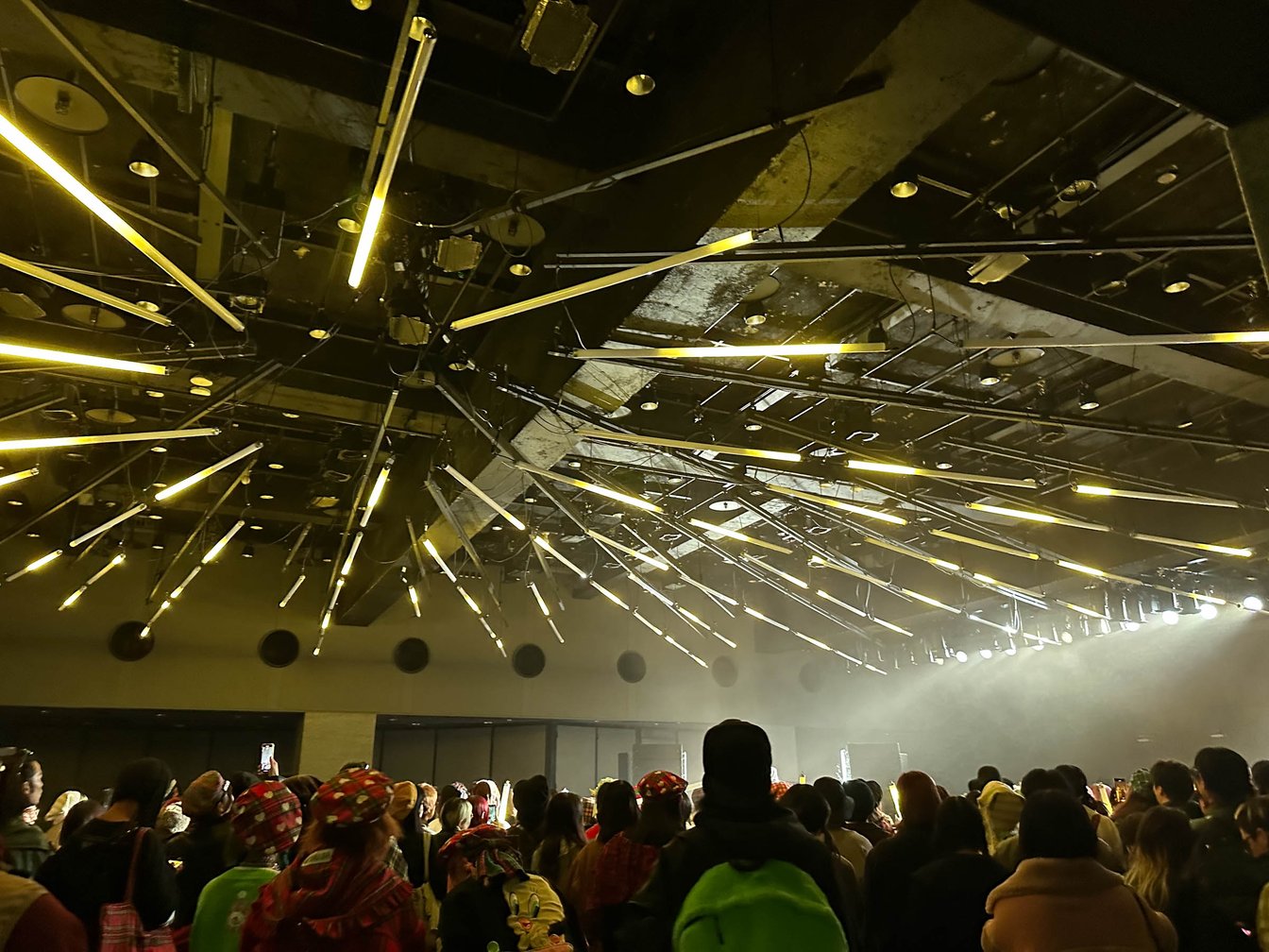 会場となったのはラフォーレミュージアム原宿。未来の原宿をイメージし、ネオン管が配されたランウェイの周りには、赤チェック、リボン、ベレー帽といったヘイヘイらしいスタイルに身を包んだファンたちが集まり、ステージに身を乗り出すような勢いでショーの開始を待つ。
