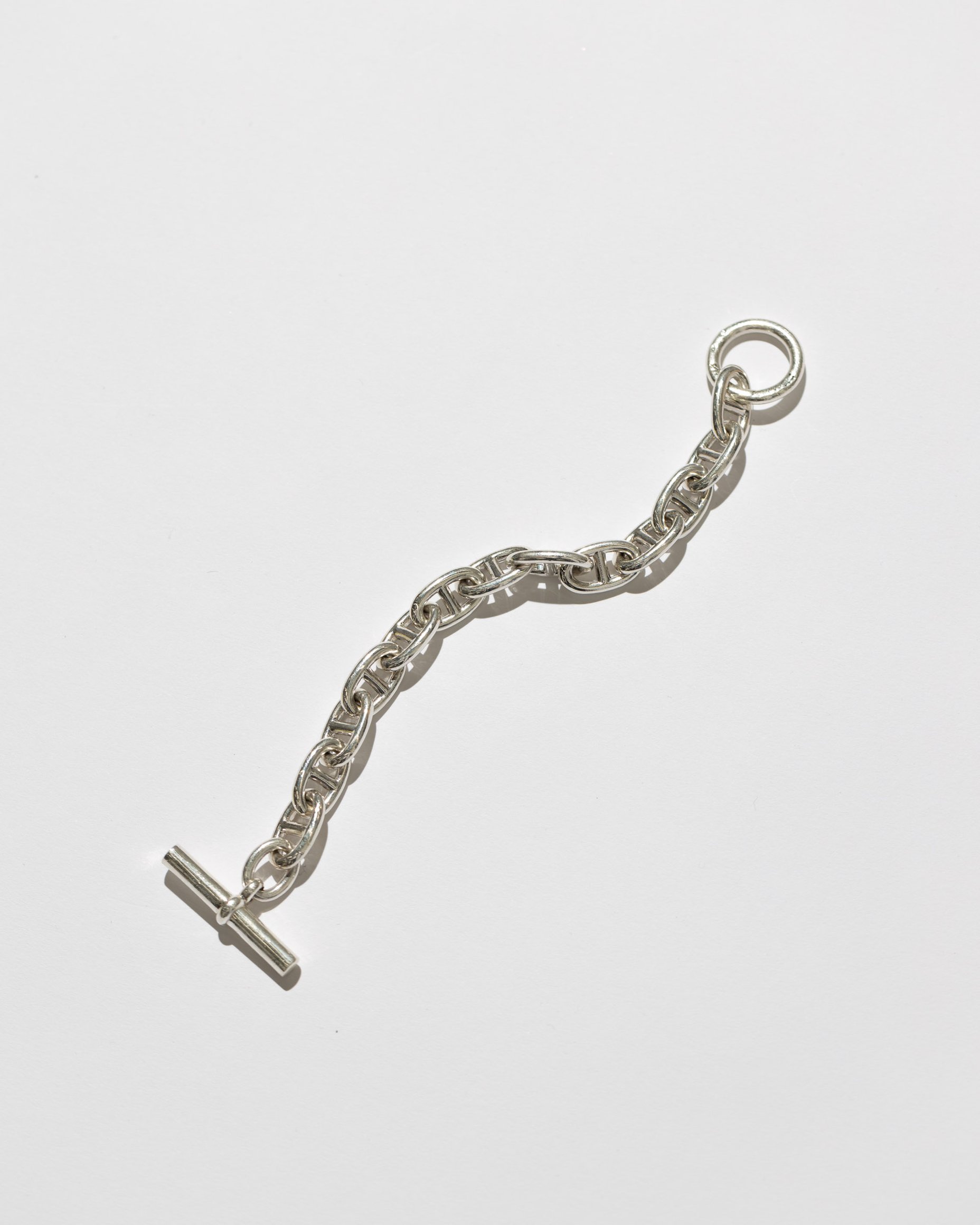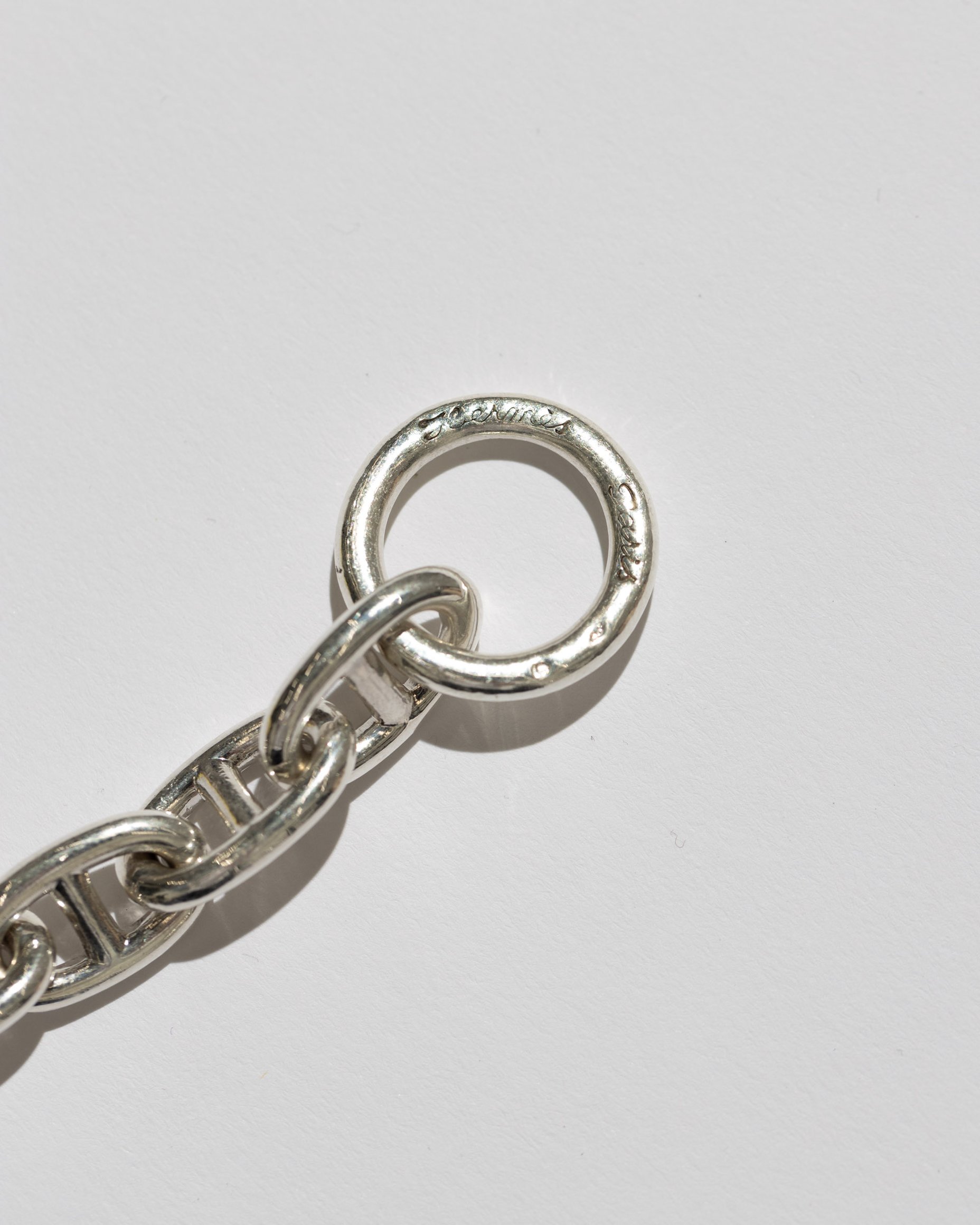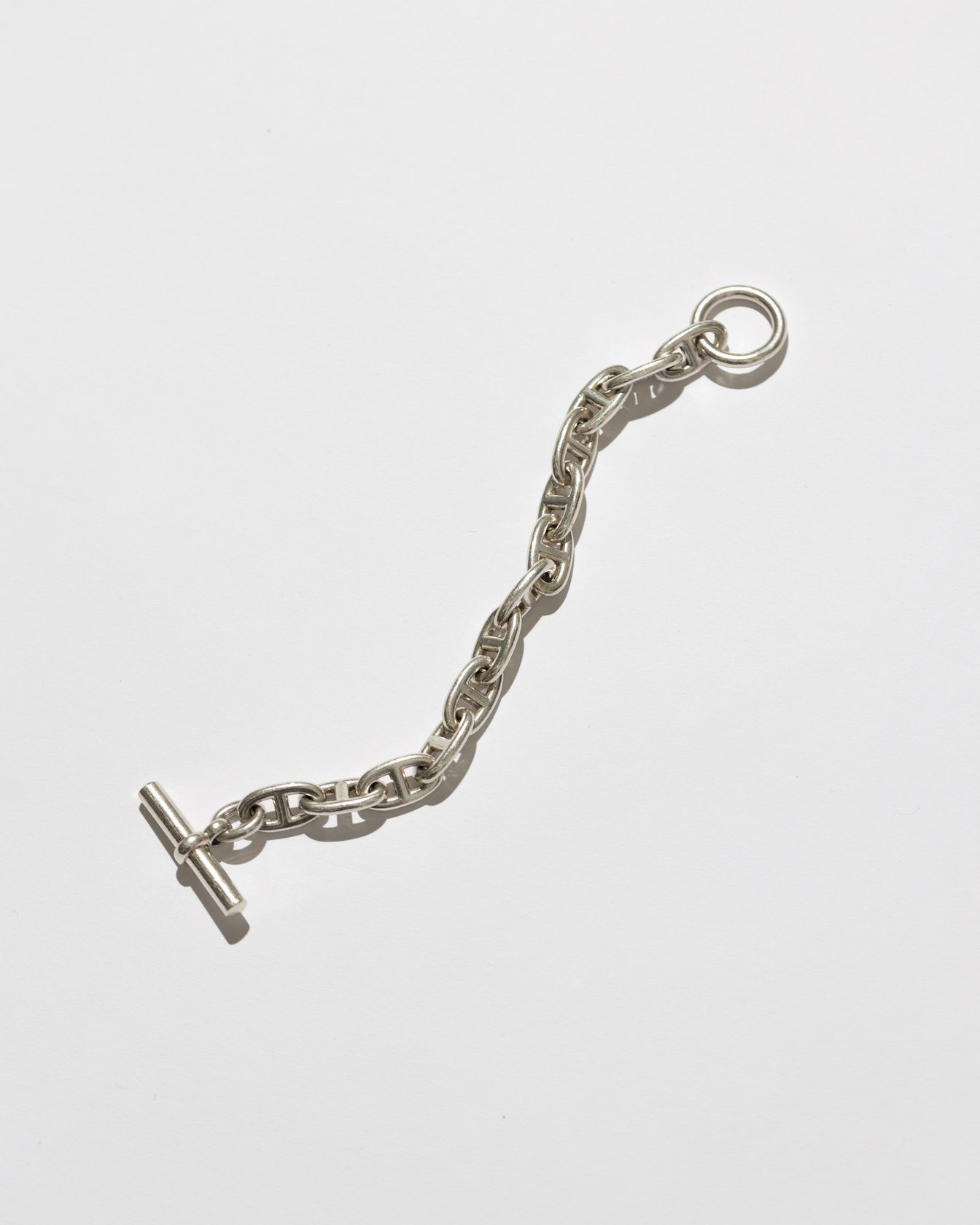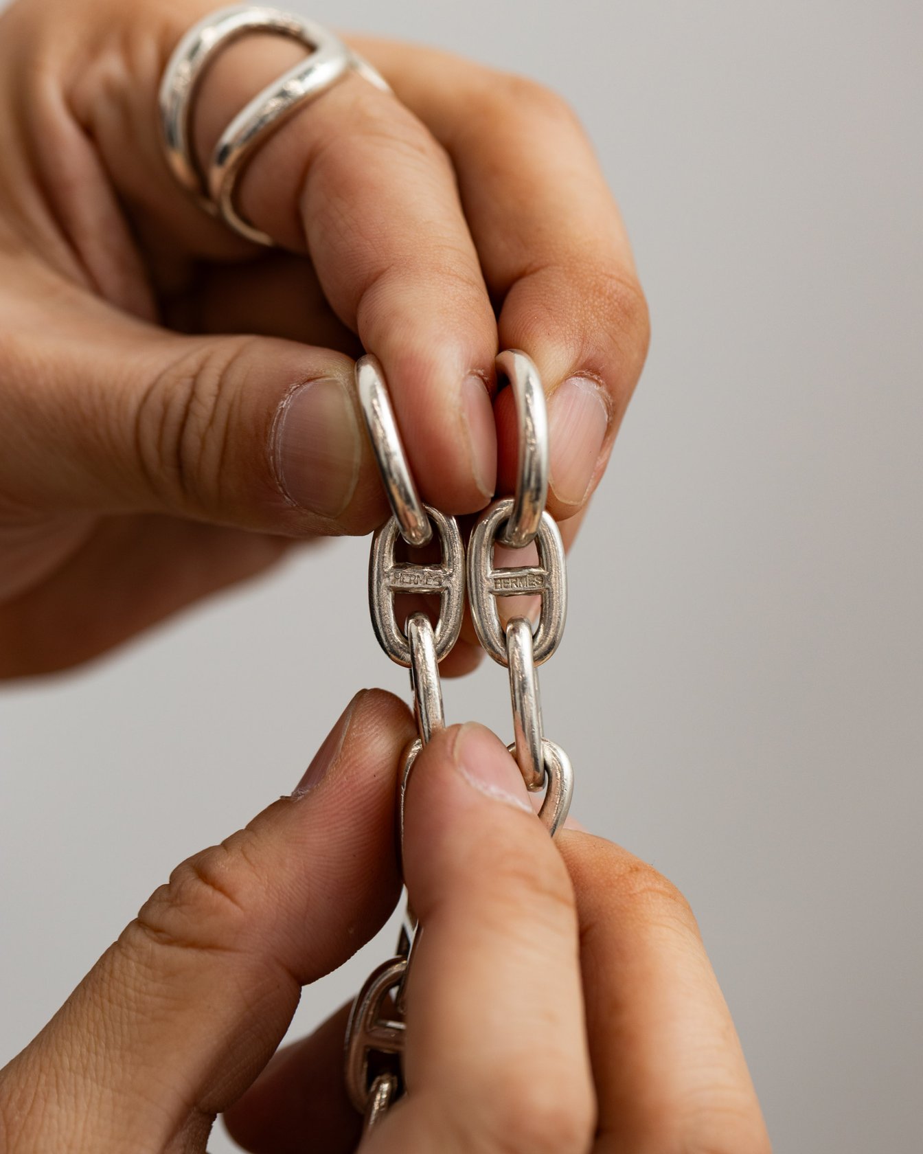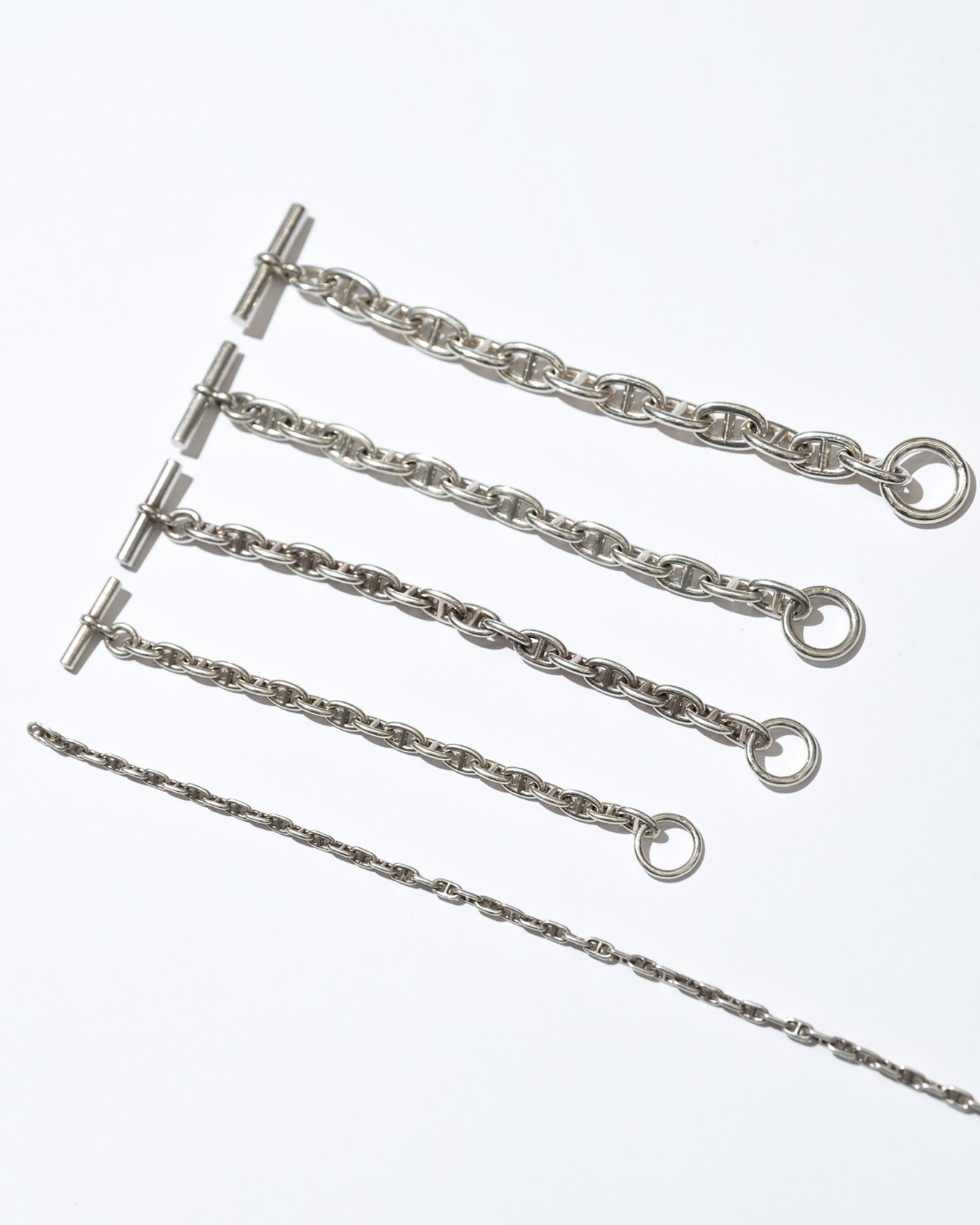十倍:1937年にロベール・デュマが海岸を散歩していたとき、船と港を繋ぐ錨のチェーンを見た時に始まったと言われています。確かノルマンディの海岸だったと思います。それから形にしてシルバーでオーダーではないエルメス初のジュエリーとして1938年に発売されました。