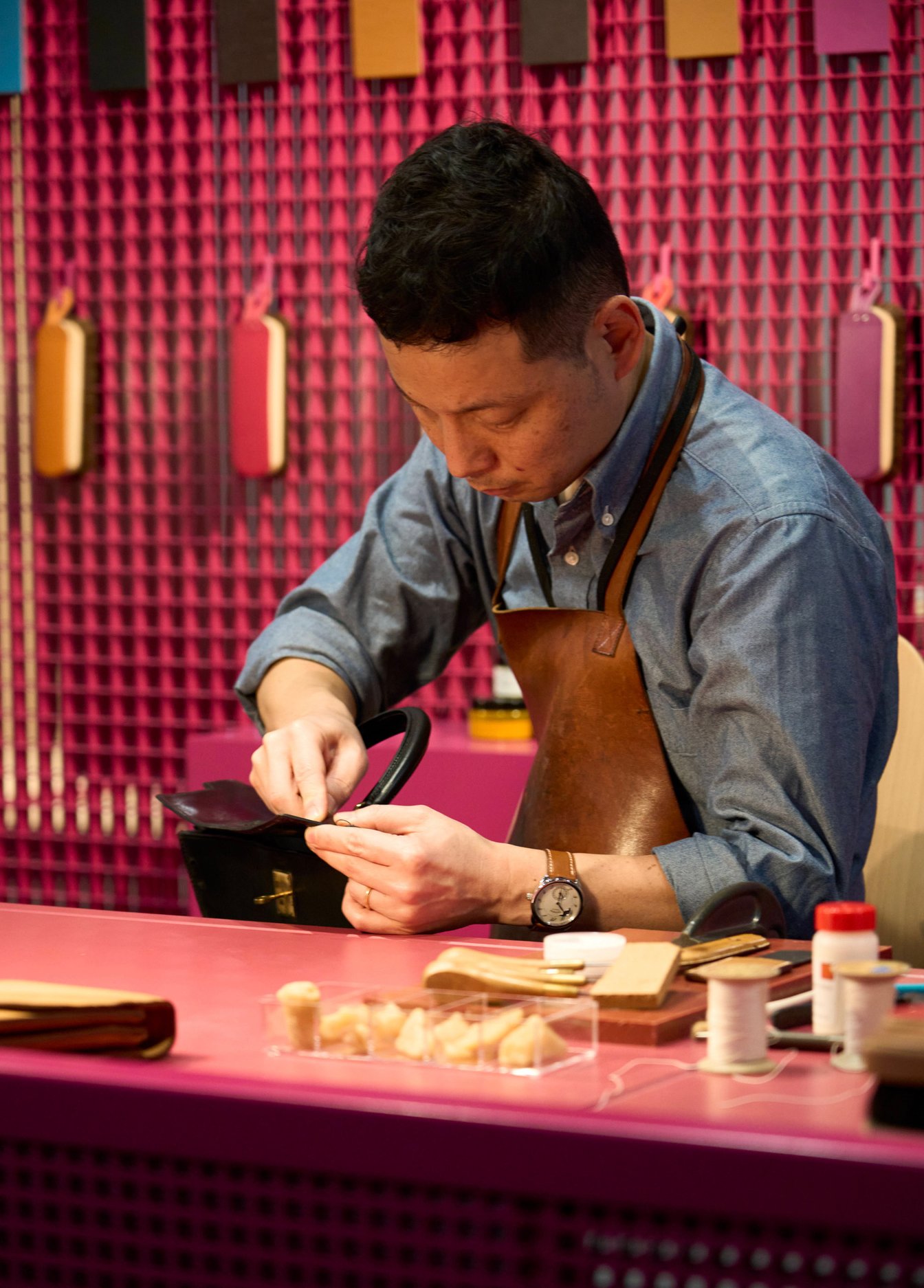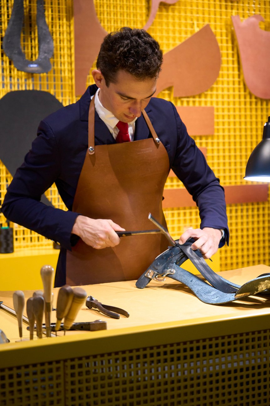 時計職人のブースでは、極小の部品を組み立てる工程を披露。また革製品の修理の実演として、バッグのベルトをサドルステッチで付け直す作業が行われていた。修理職人は世界の主要都市に点在しており、修理や修復を求めて毎年10万点以上の製品が持ち込まれているという。