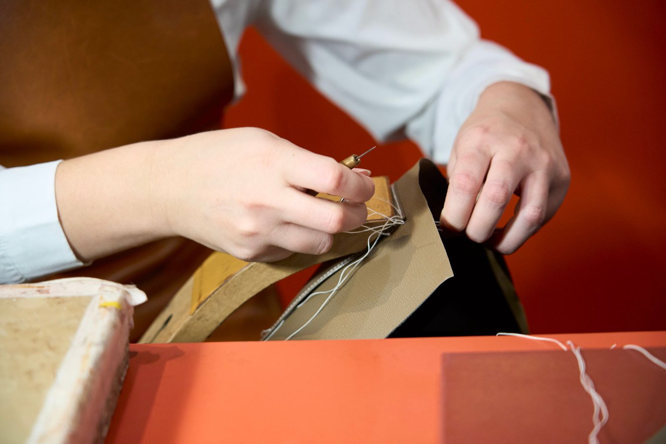 エルメスのバッグはどのようにして作られているのか。熟練の組み立て職人が、手を動かしながら丁寧に説明する。代表的な「ケリー」バッグは40点あまりのレザーパーツから作られ、1人の職人が1つのバッグを数日かけて手作業で仕上げていく。