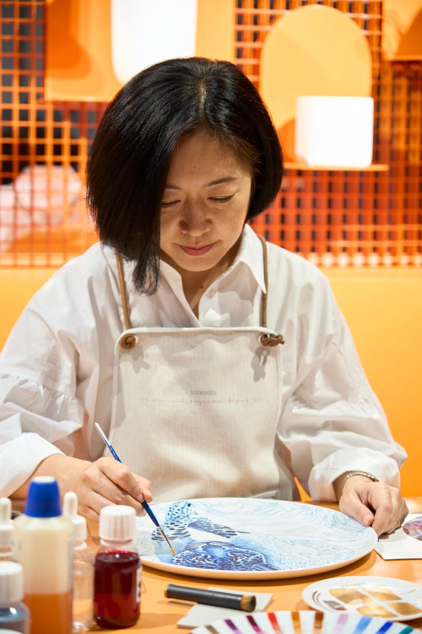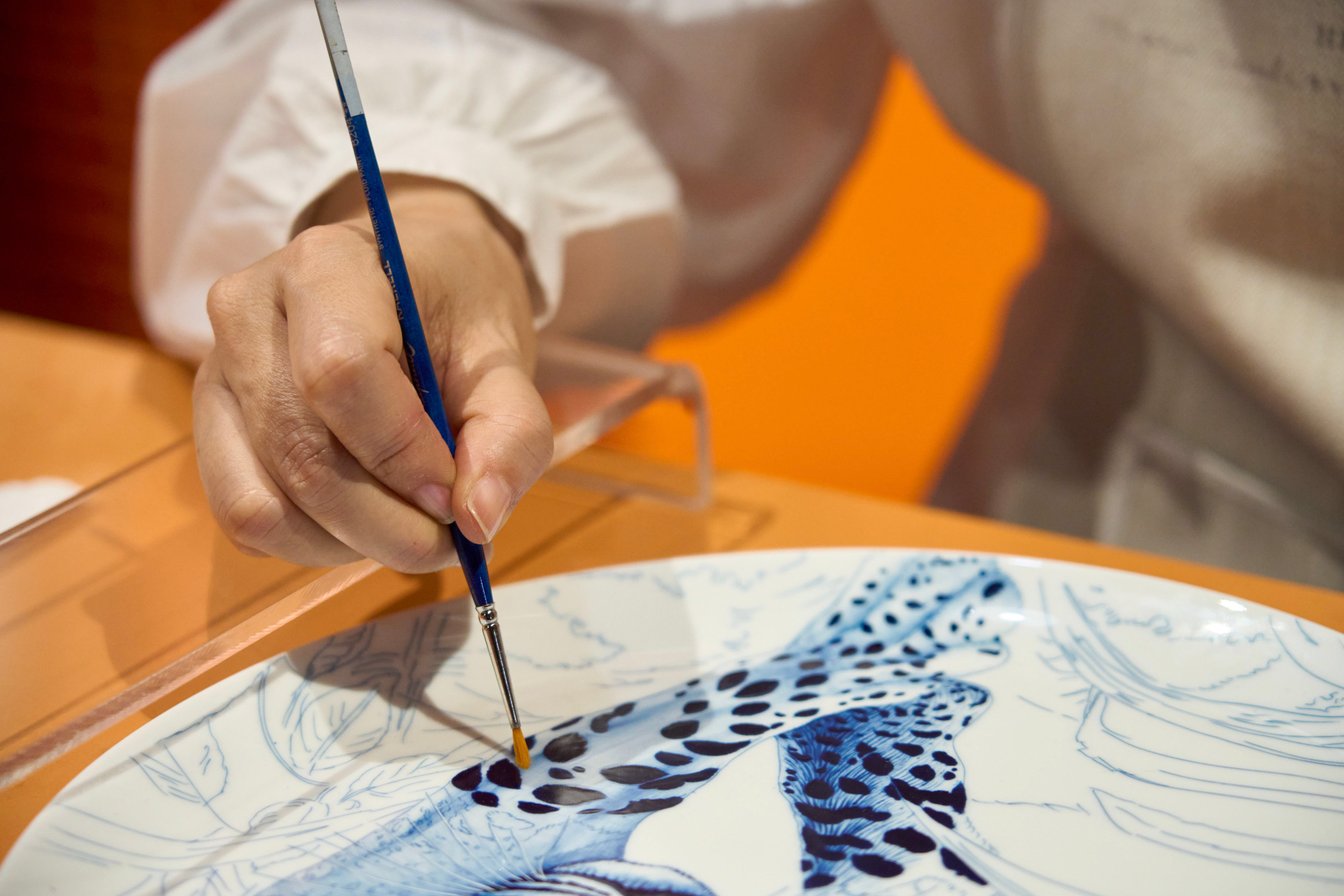 磁器のブースで絵付けを行っていたのは、日本からフランスにわたったという磁器絵付け職人。極細の筆を使って原画を忠実に再現する。窯で何度も焼くことにより、鮮やかな色彩が現れるという。