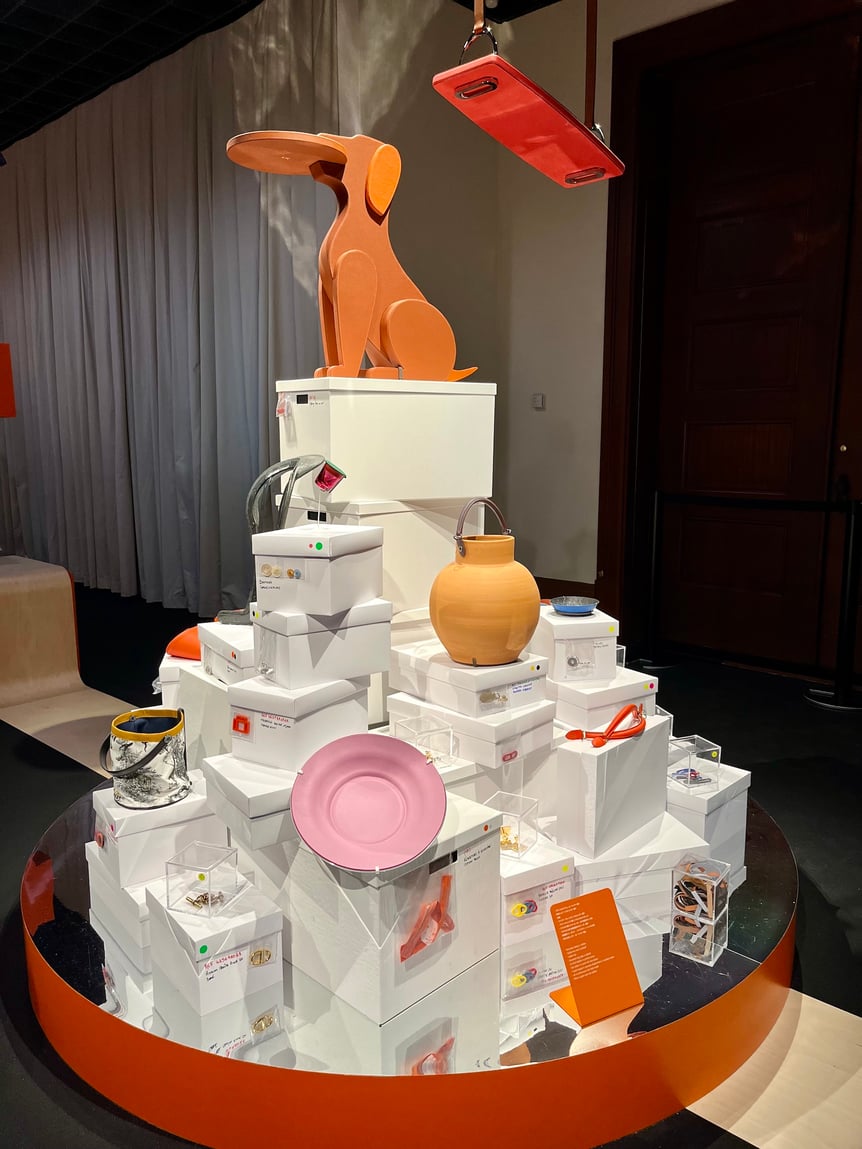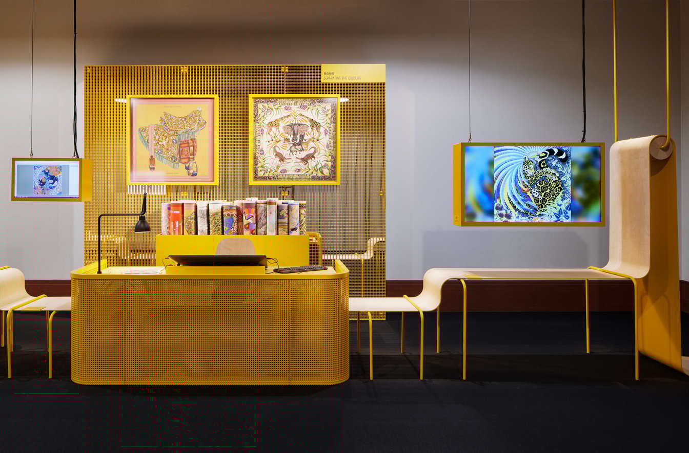 エルメスと京都のつながりとして、世界唯一の染色技法を受け継ぐ京都の工房「京都マーブル」のアーカイヴのカレを展示。粘土状の染料で染める特別な技法で、鮮やかなマーブル模様が特徴。唯一「MADE IN JAPAN」のカレとなっている。