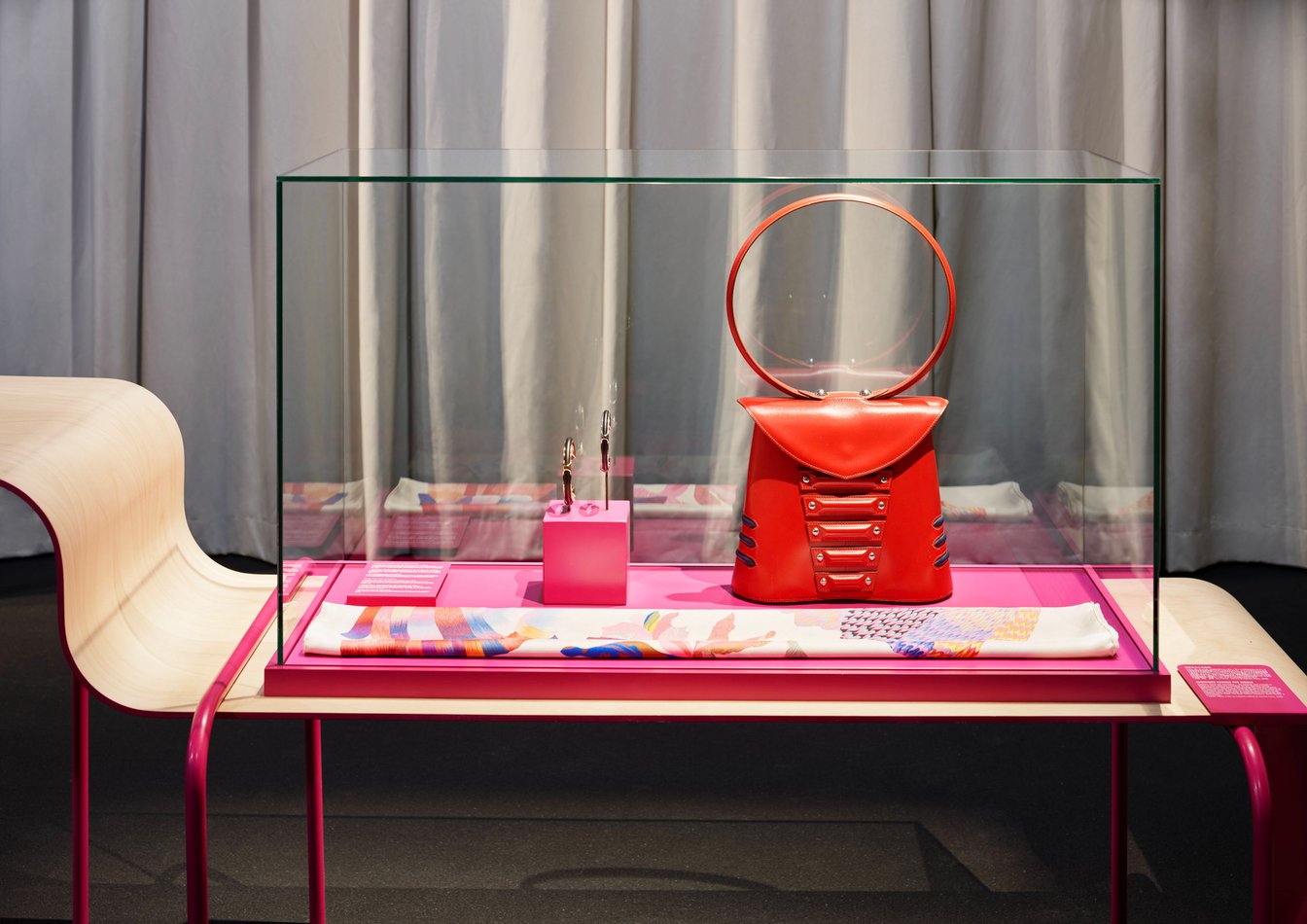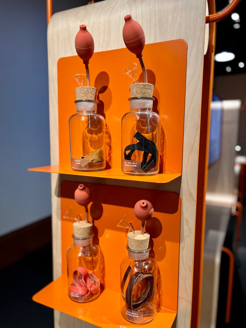 端材や傷がついた製品などを違うものに作り変えて再び息を吹き込むユニークなコレクション「petit h(プティ アッシュ)」の展示。また、複数の種類のレザーがそれぞれ瓶に詰められ、香りの違いを楽しめるコーナーも。さまざまな角度から素材を探求していく。