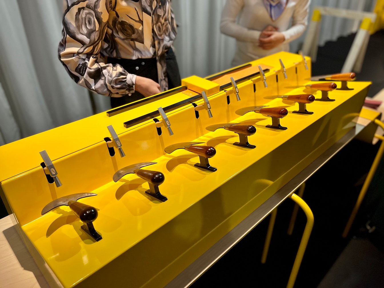 館内に一歩足を踏み入れれば、まるでアトリエのような雰囲気。4色のカラーと白木を使ったディスプレイが特徴で、道具や機械を操る音や、職人たちの声が響いている。