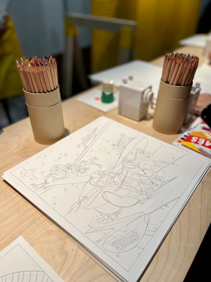 塗り絵コーナーや、シルクスクリーン体験、そしてカレの絵合わせに挑戦するスロットマシーンなど、子どもから大人まで楽しめるコンテンツが用意されている。