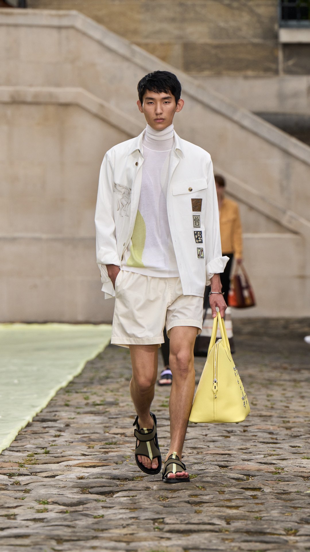 カレのアイコンたちをあしらったワッペンやペガサスの刺しゅうなどは、エルメスらしい遊び心を感じさせる。モデルたちが着用していたジュエリーも「アルファケリー」のシルバーネックレスや「コリエ・ド・シアン」のシルバーリングとブレスレットなど、アイコニックなアイテムが多く見られた。
