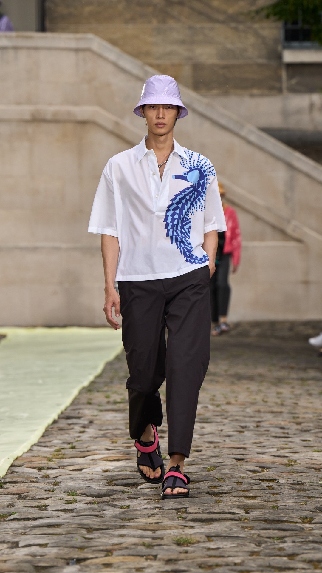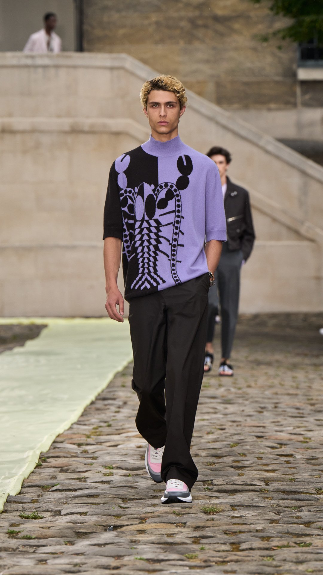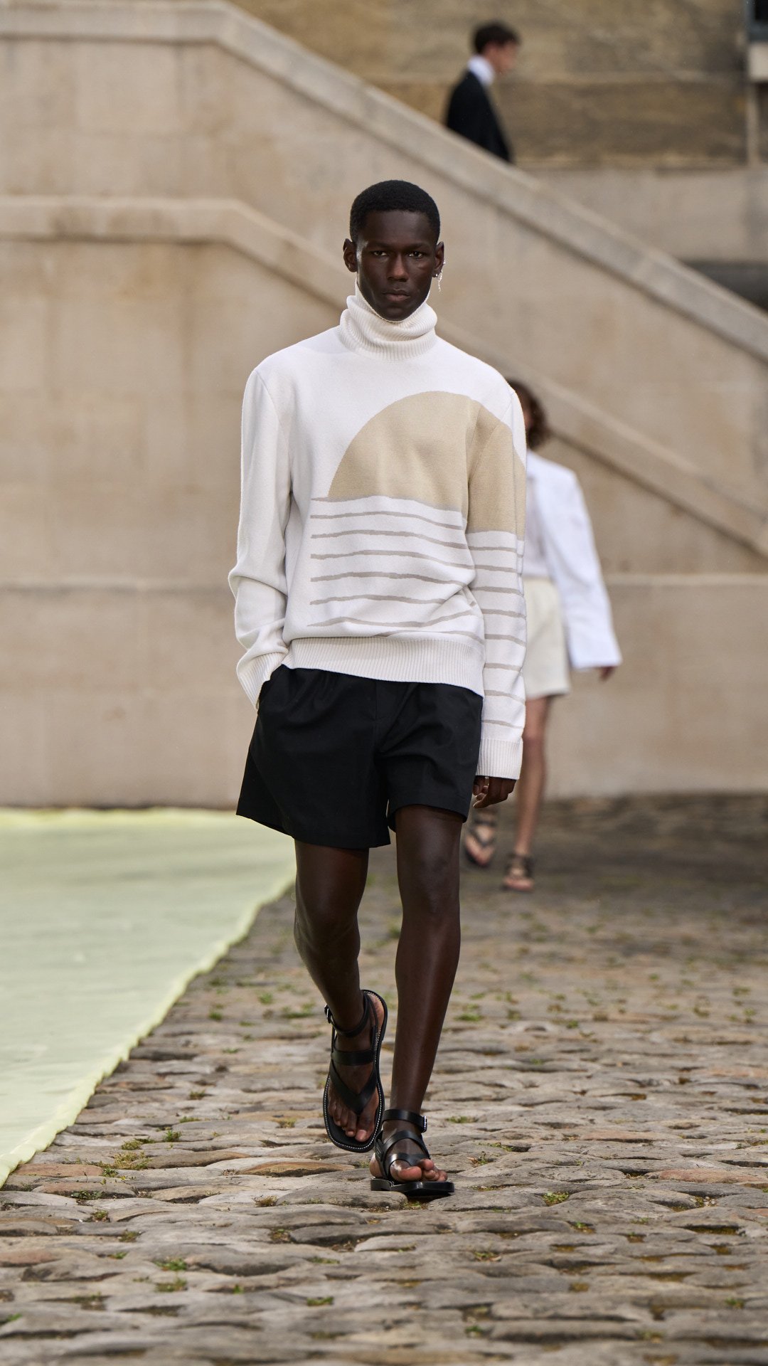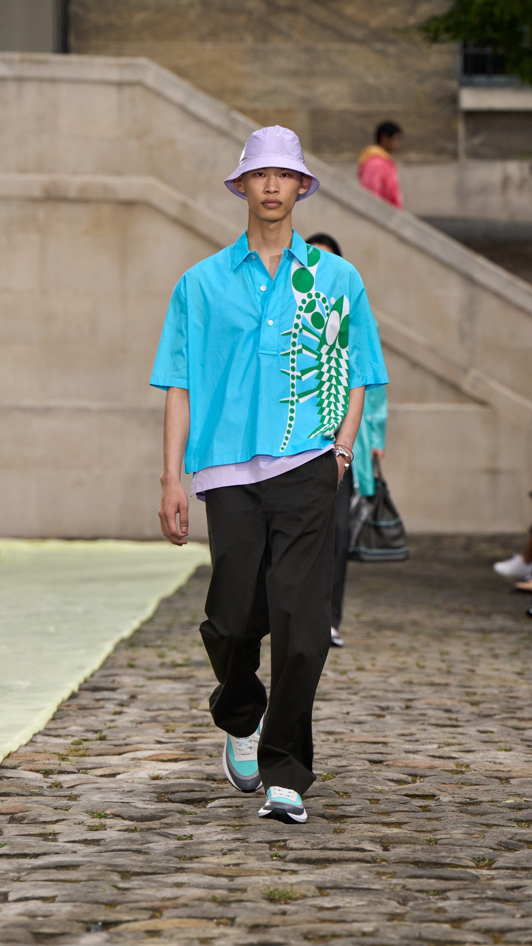 会場となったのは、18世紀に建てられた国立ゴブラン織工房の中庭。開け放たれた窓からトワル(仮縫い用の生地)が飛び出したかのように、ペールグリーンのカーペットが窓から石畳へと敷かれていた。コレクションのキーワードとなったのは、夏の太陽や水の動き、そして海辺の生き物たち。サンセット(日没)モチーフのプルオーバーや、波や波紋を表現したシャツなどが登場した。
