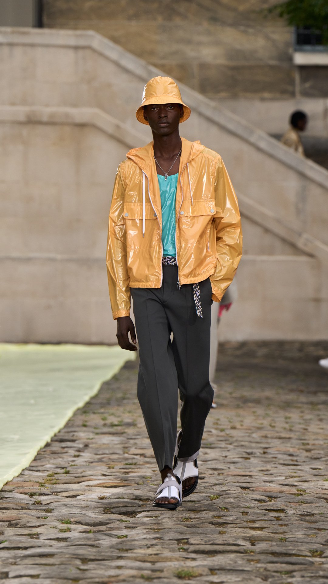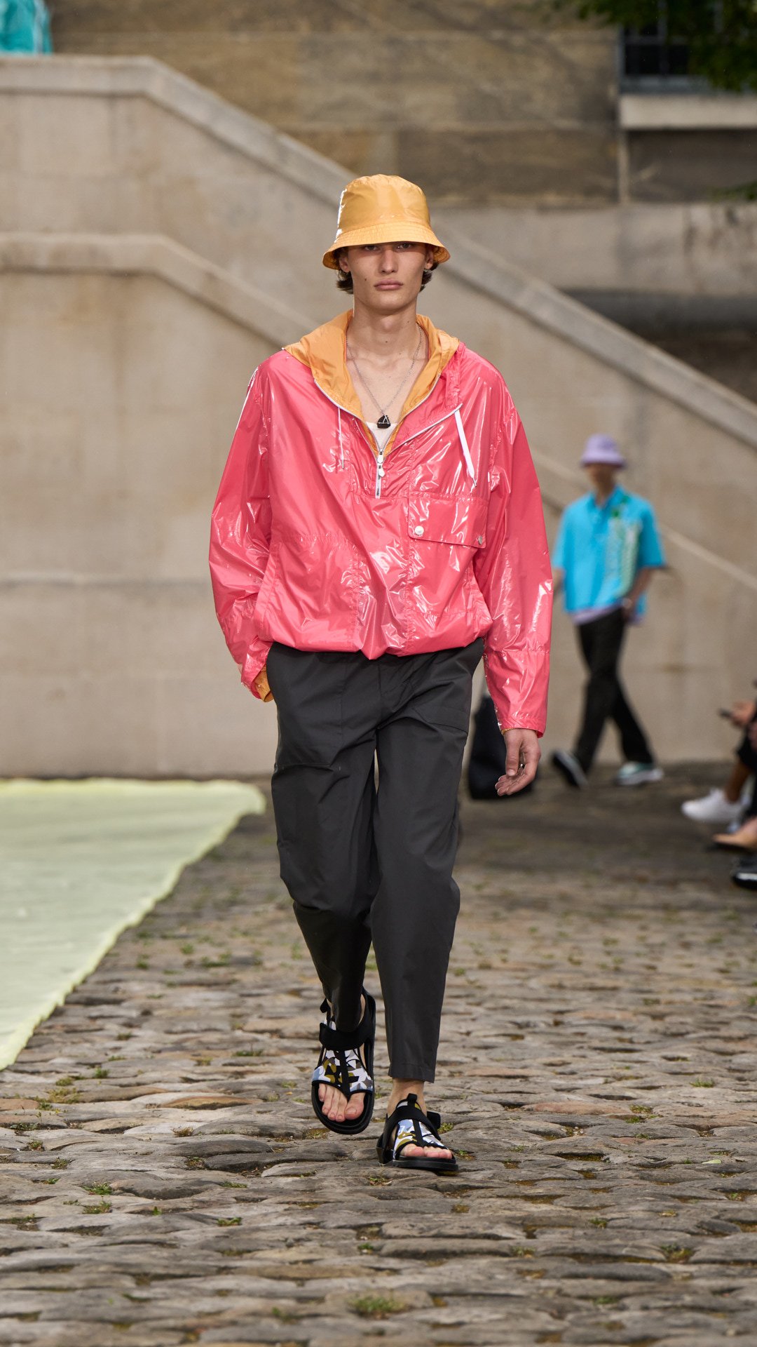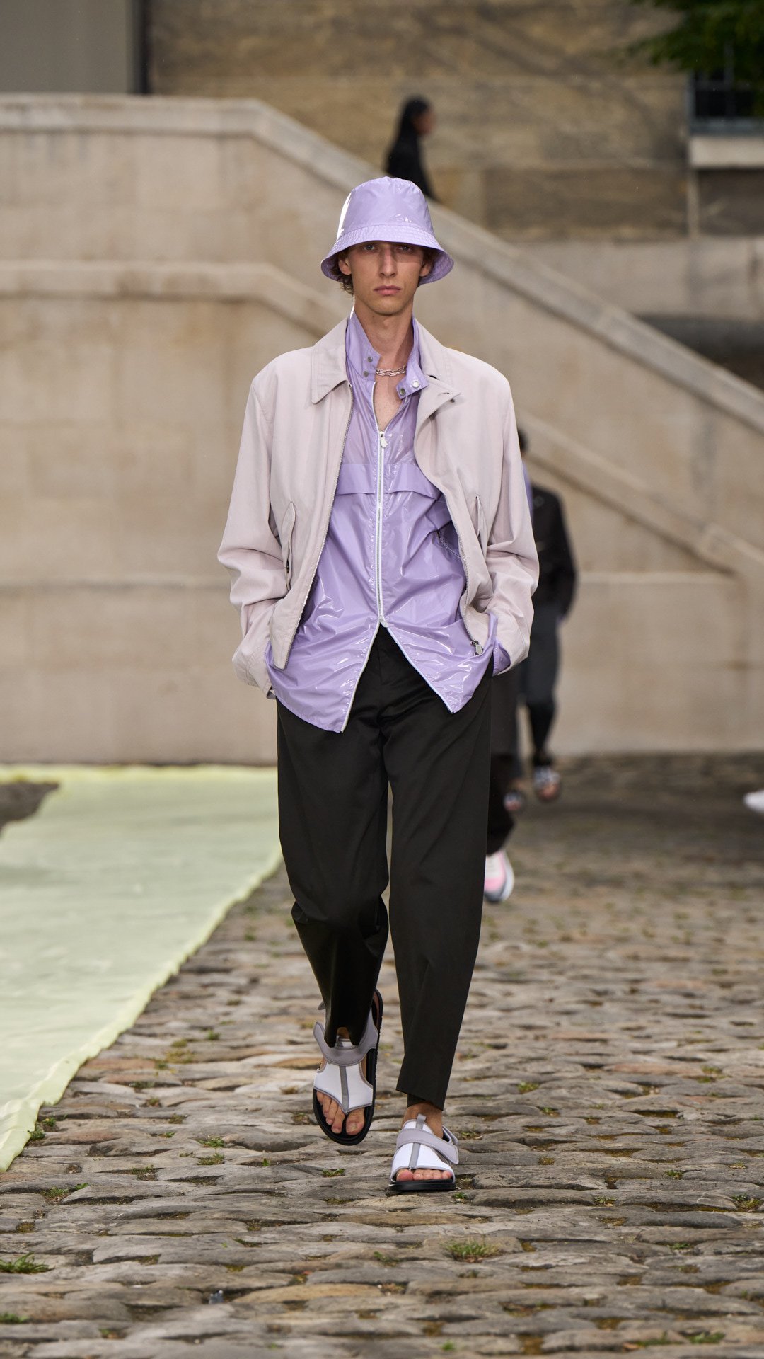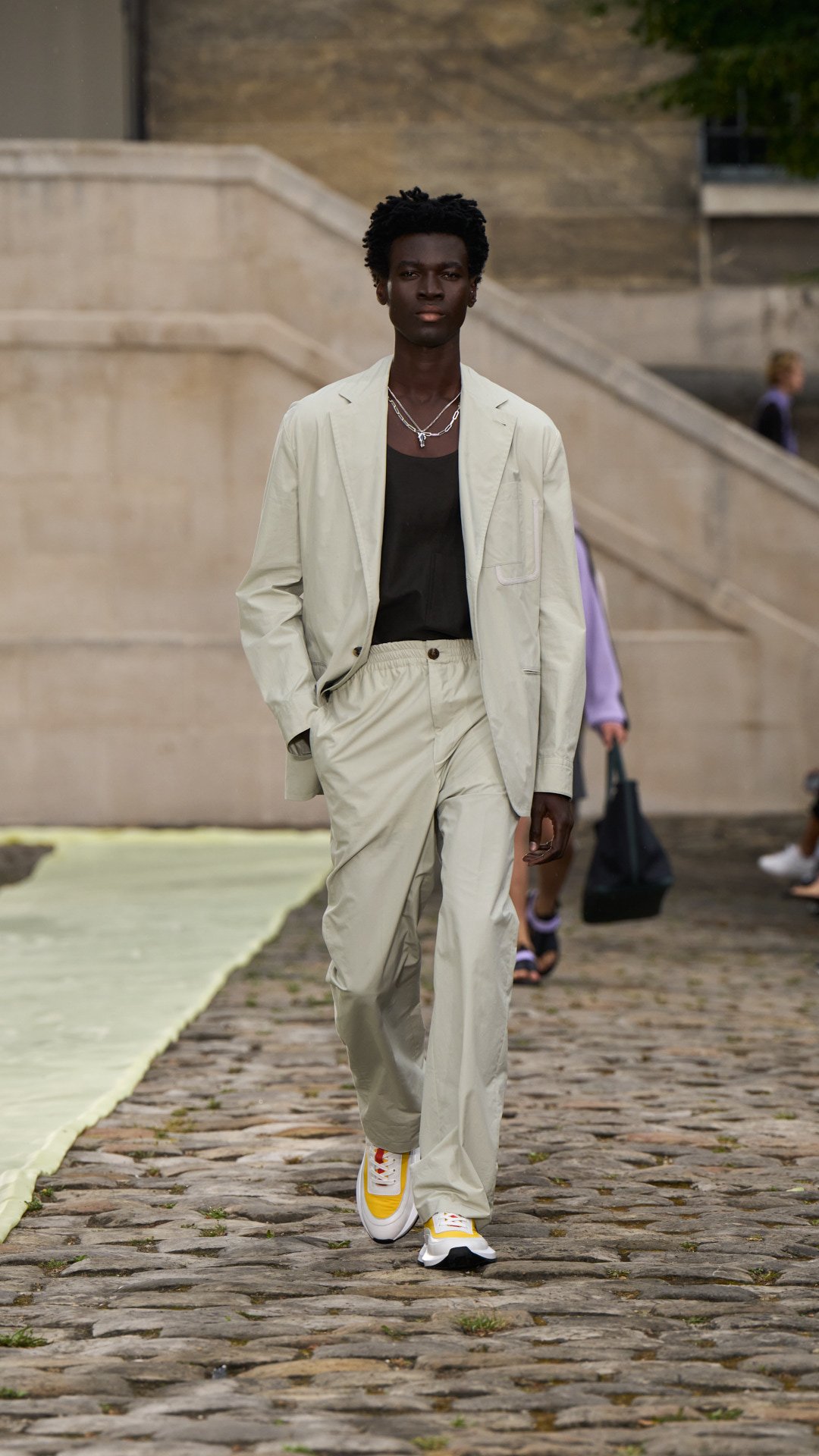 会場となったのは、18世紀に建てられた国立ゴブラン織工房の中庭。開け放たれた窓からトワル(仮縫い用の生地)が飛び出したかのように、ペールグリーンのカーペットが窓から石畳へと敷かれていた。コレクションのキーワードとなったのは、夏の太陽や水の動き、そして海辺の生き物たち。サンセット(日没)モチーフのプルオーバーや、波や波紋を表現したシャツなどが登場した。