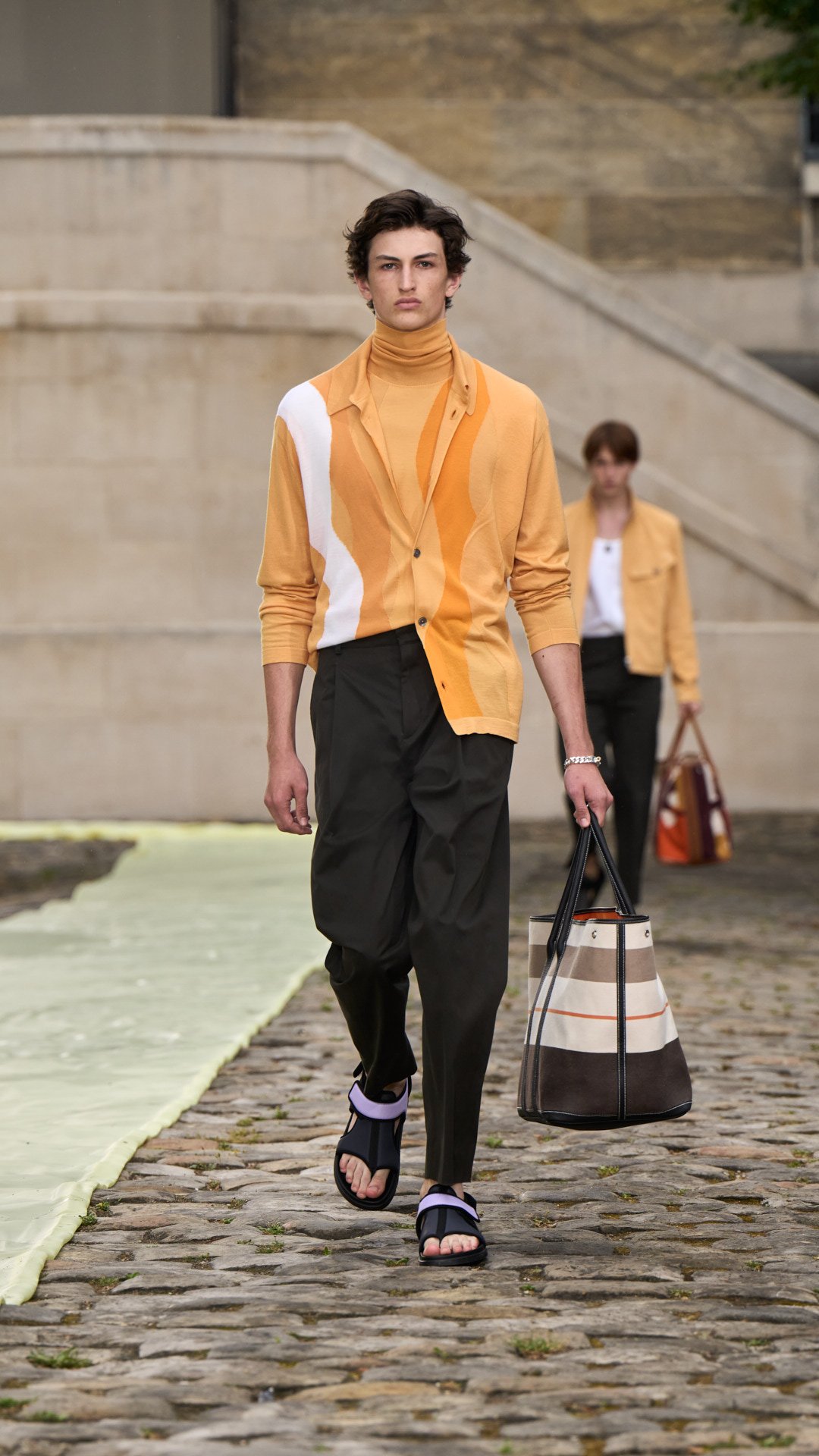 浜辺のイラストがプリントされたコットンキャンバスのビーチバッグや、カーフスキンとプリントシルクツイルの手編みベルトなども、カラフルで軽快。洗練されたスタイルの中に、キャッチーな小物使いが目を引いた。フィナーレで石畳の坂道を降りてきたモデルたちは、今からバカンスへと旅立つような、明るく開放されたムードを放っていた。