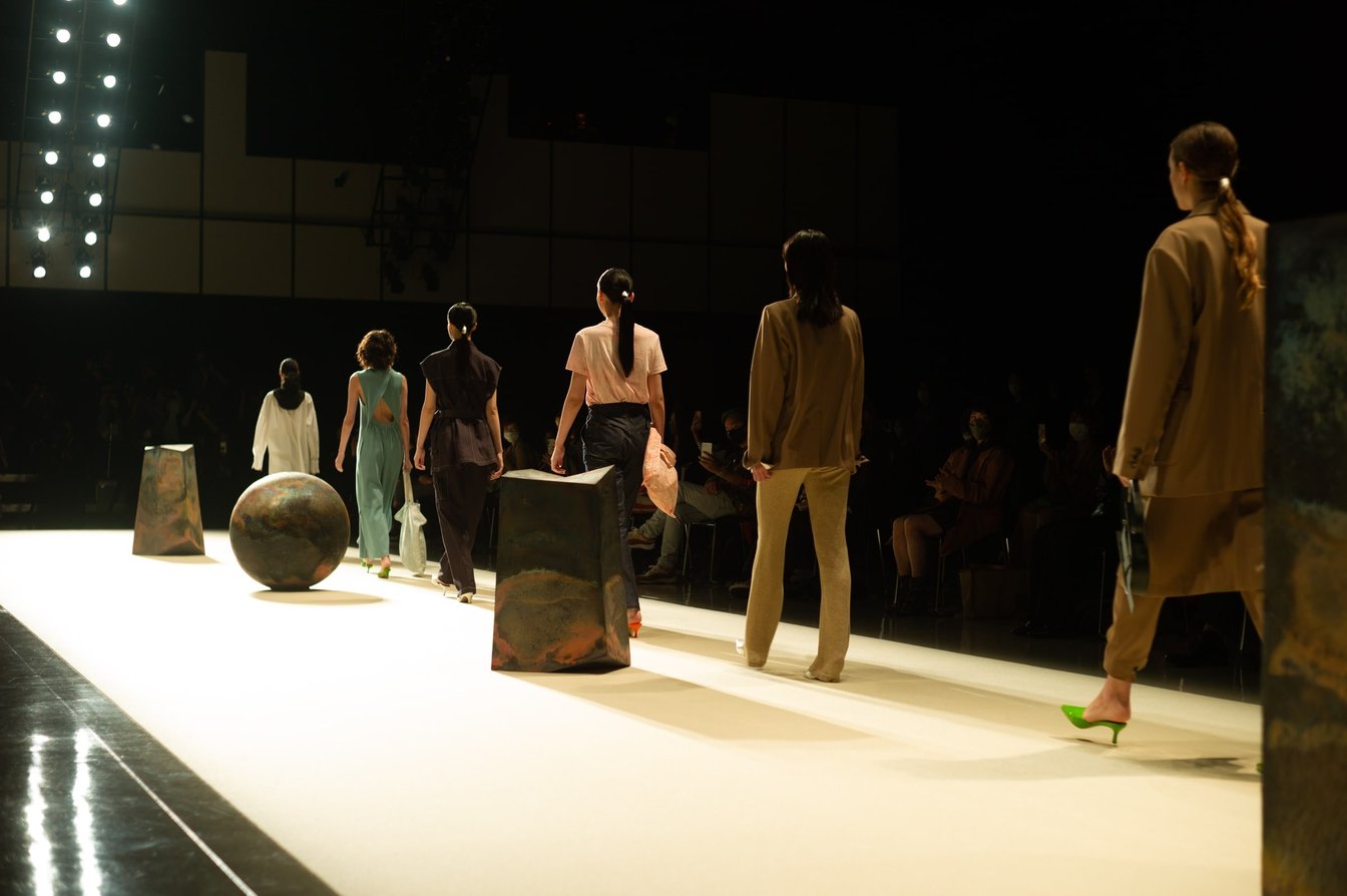 表面に現れるマーブルは、長い時間釜に入れ釉薬が化学反応を起こすことで生まれる模様で、様々なアングルから見ることで神秘的で異なる表情を見せる。印はこの橋本の本質的な色を追求するという創作理念に、立ち上げから5年ほど経つブランドを重ね合わせ、「シンプルでも直球で服を見せたい」との思いから2回目となるショーを開催した。