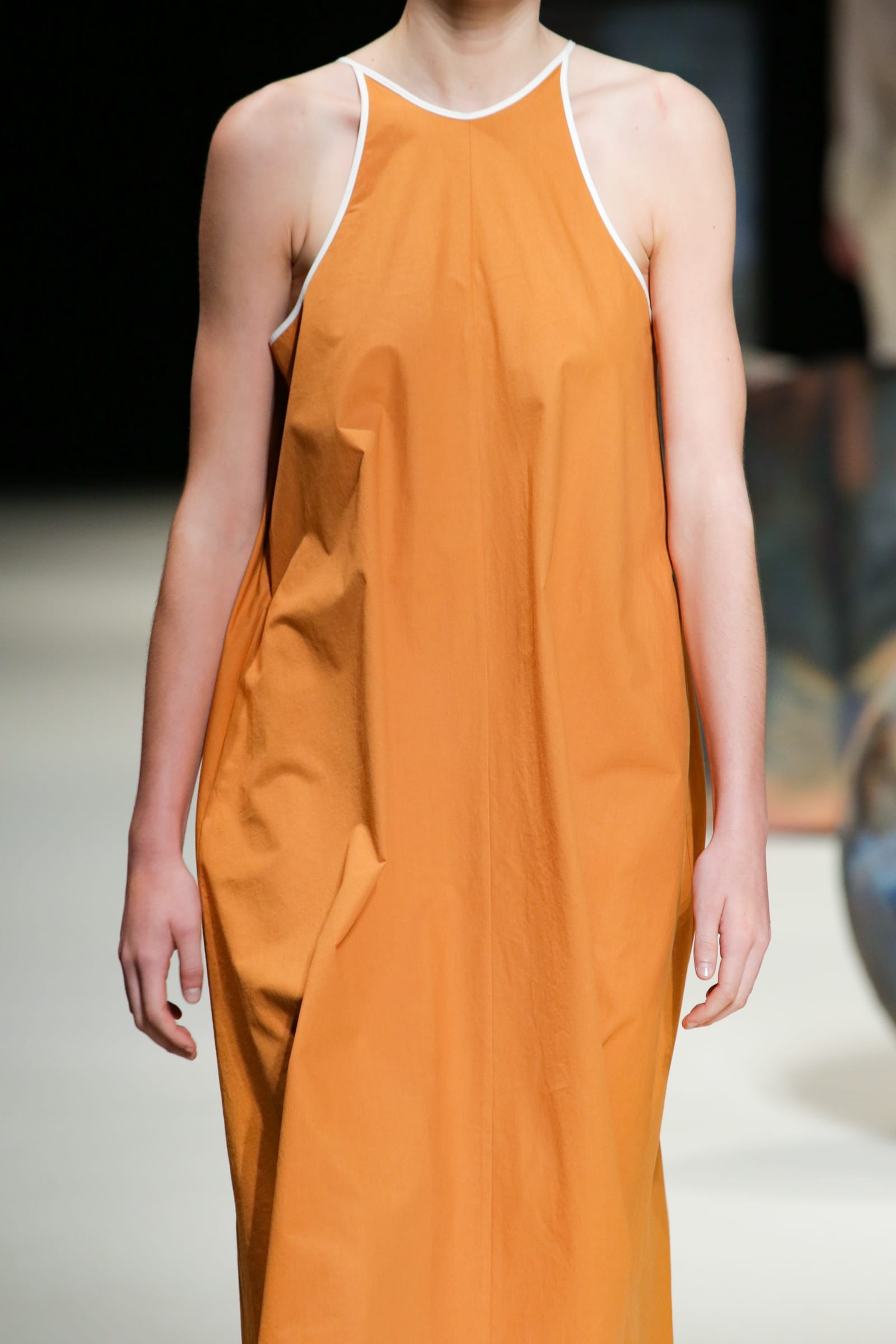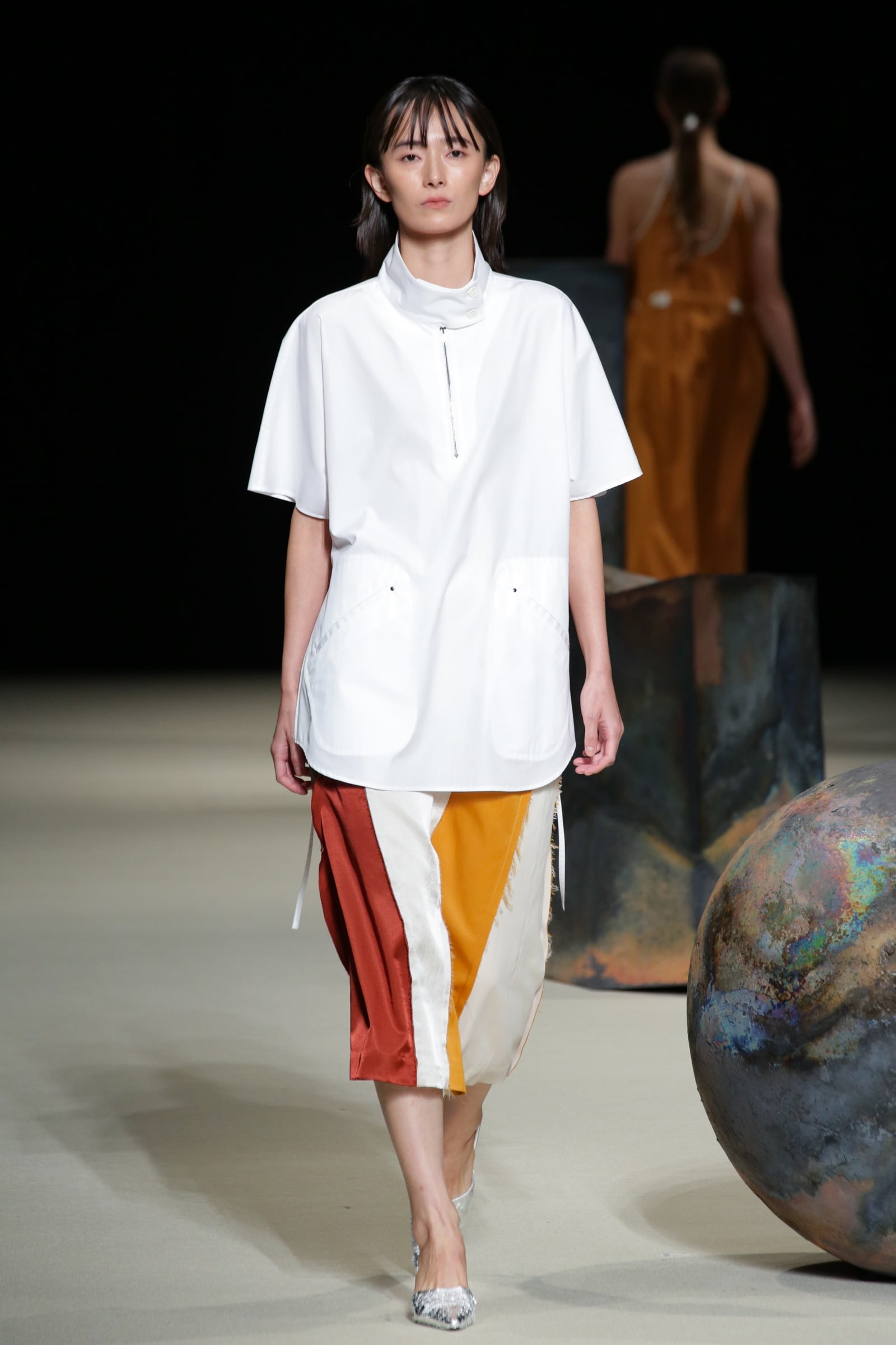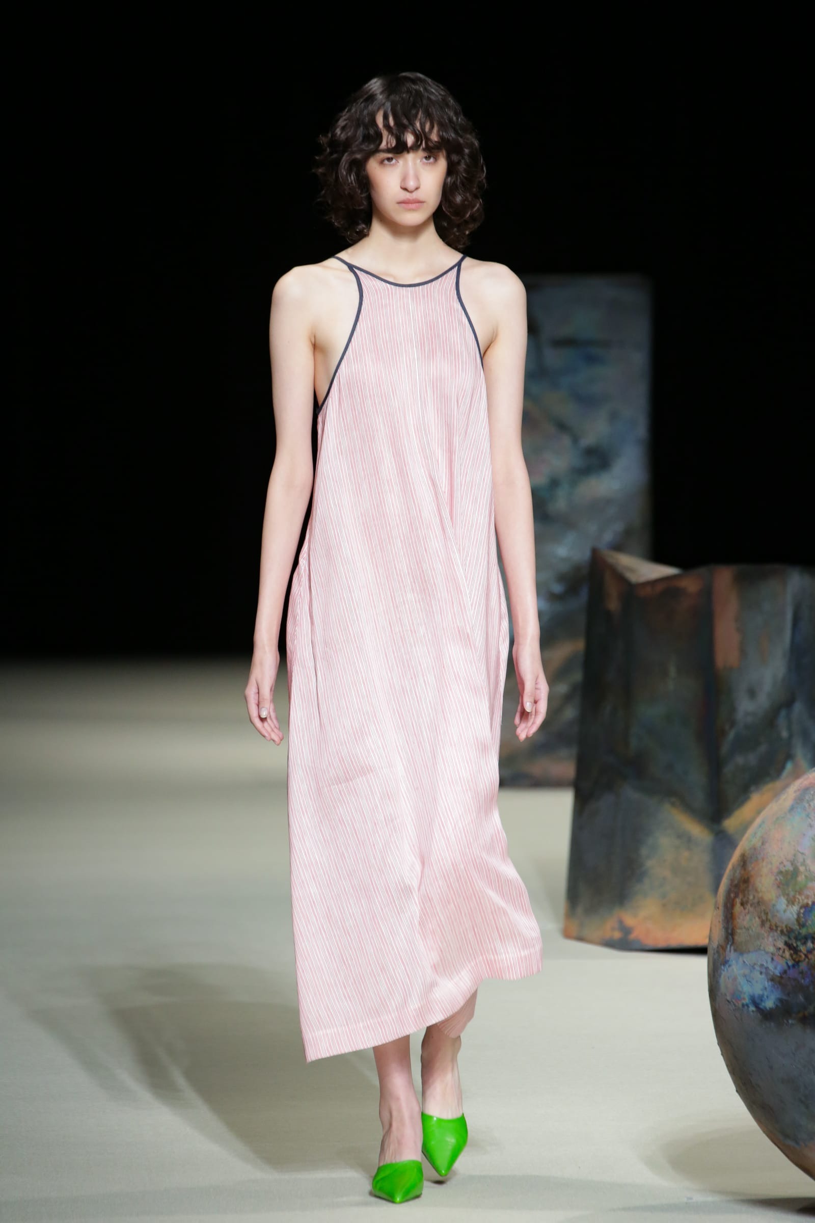 コレクションではネックデザインが特徴のピンクの細ストライプワンピースに始まり、セットアップやパジャマのような開襟シャツ、シアーな素材のノーカラーシャツ、ホワイトやレッド、オレンジのマルチカラーのファブリックが縫い合わされたスカートと続き、全体的にゆったりめなシルエットとリネンやキュプラなどの高級感のある光沢と軽やかな素材感が際立った。
