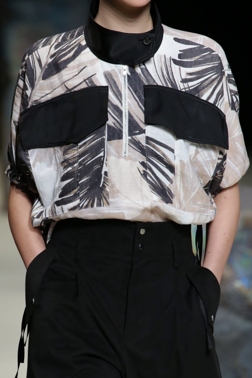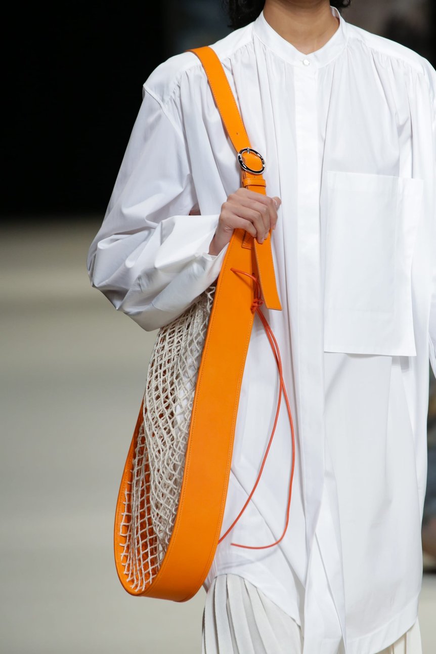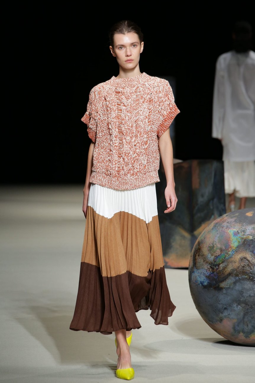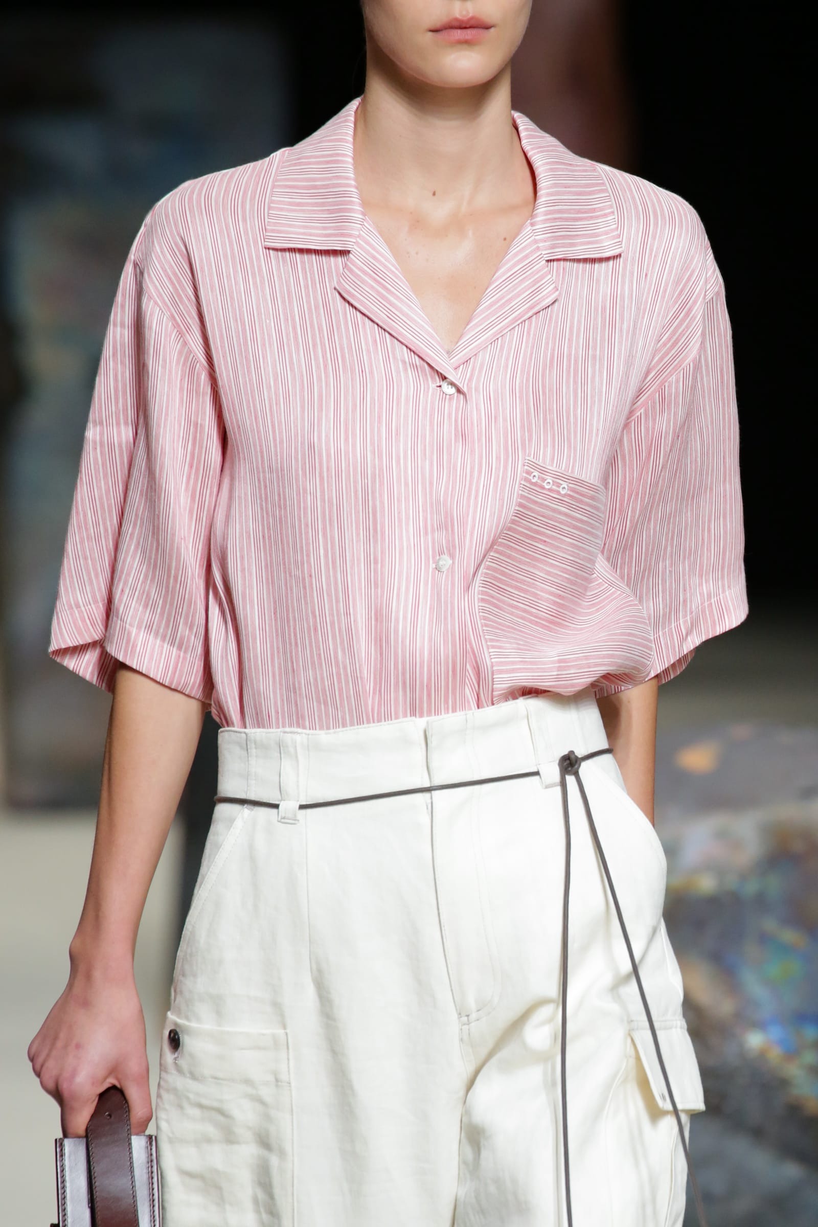 コレクションではネックデザインが特徴のピンクの細ストライプワンピースに始まり、セットアップやパジャマのような開襟シャツ、シアーな素材のノーカラーシャツ、ホワイトやレッド、オレンジのマルチカラーのファブリックが縫い合わされたスカートと続き、全体的にゆったりめなシルエットとリネンやキュプラなどの高級感のある光沢と軽やかな素材感が際立った。