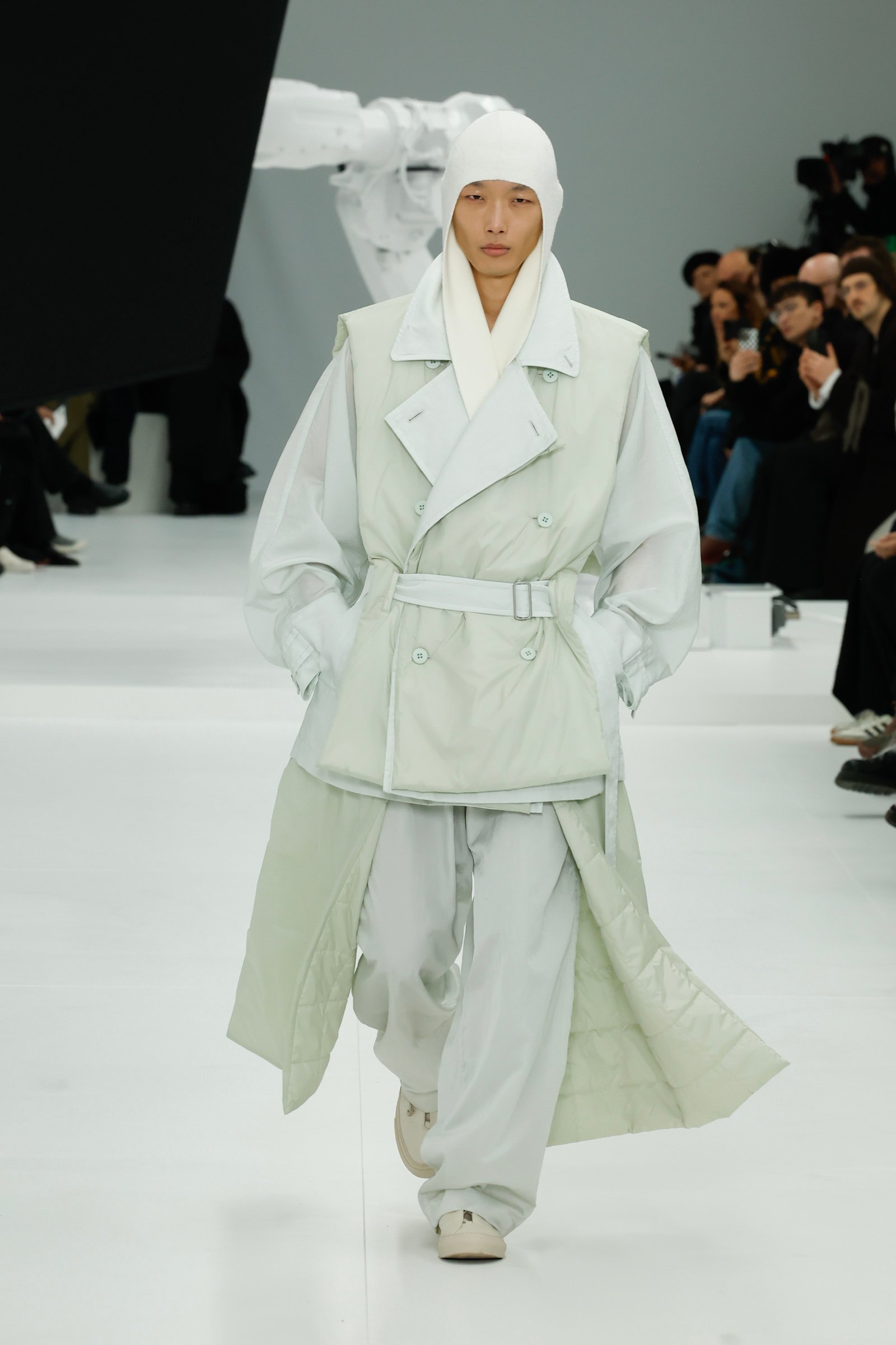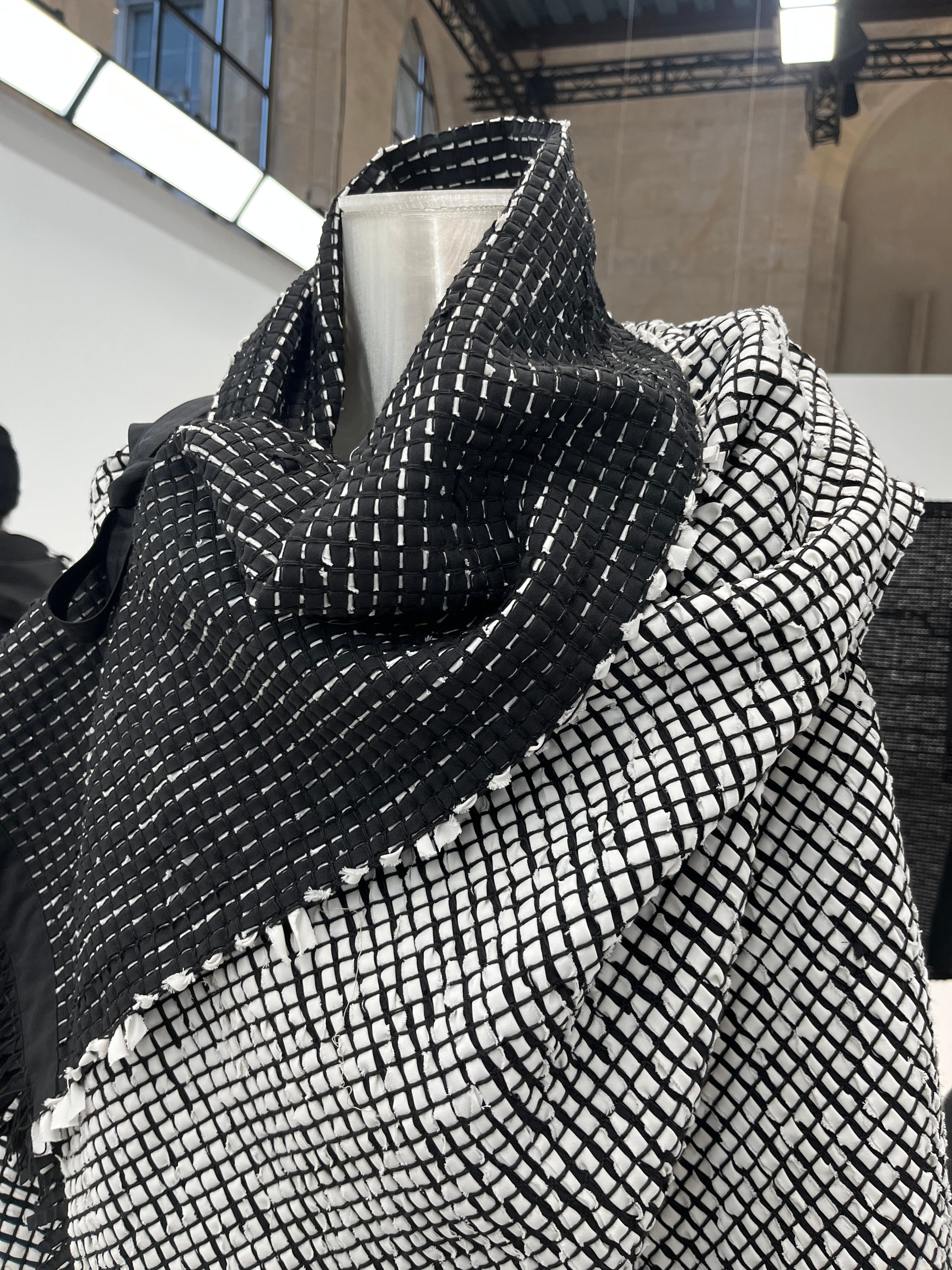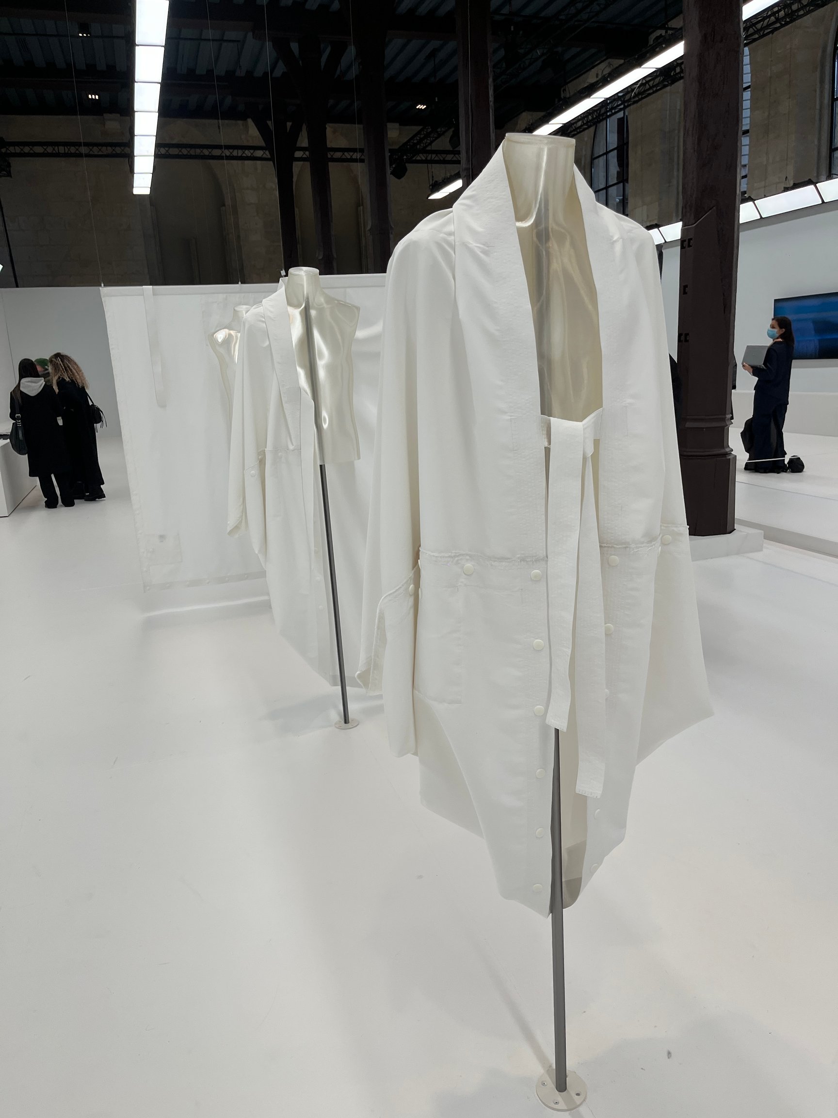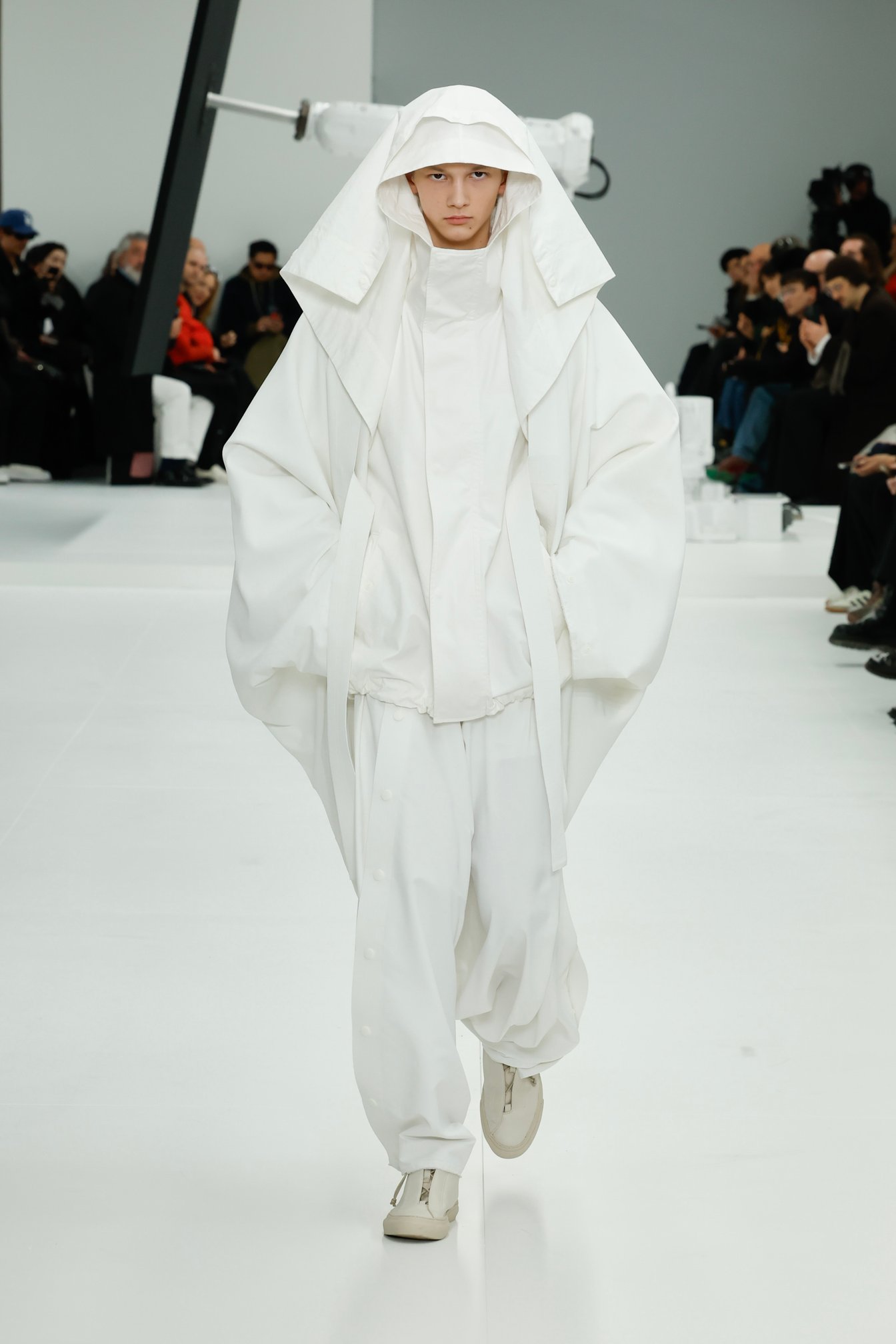 ロボットアームが動き出し、ショーが始まった。ファーストルックは、白いドレープに包まれた僧侶のような出立ちだ。織物の端すらも切り落とさない“一枚の布”でできており、風をきるように歩くと空気をはらんで膨らんだ。遠目から見ても、素材の軽さが伝わる。パッド入りの素材でさえ非常に軽く、空中に浮いているようだった。ロボットアームの機械的な動きや、黒い正方形のオブジェとしての硬さは、衣服の持つしなやかさと対照的に見えた。