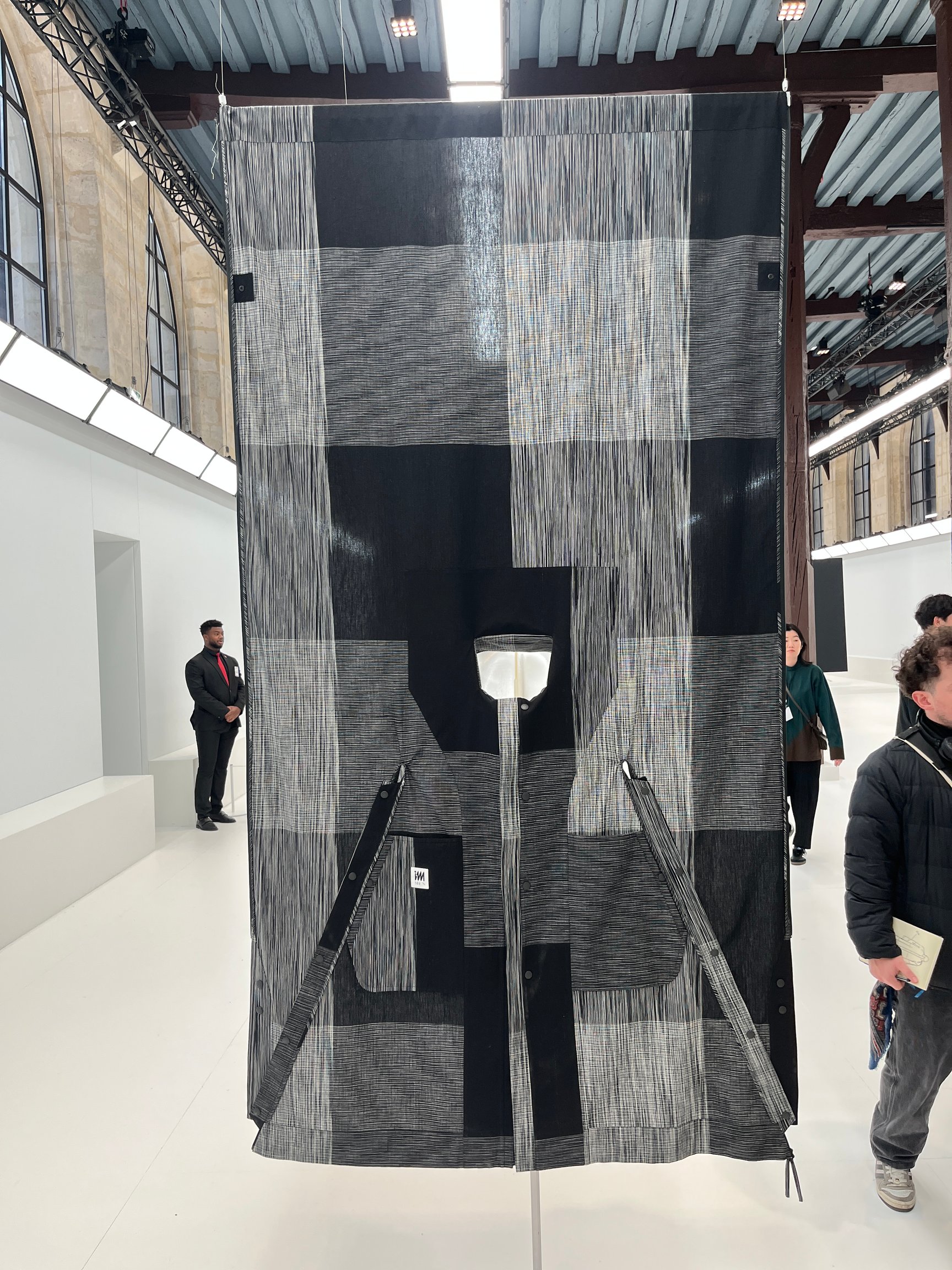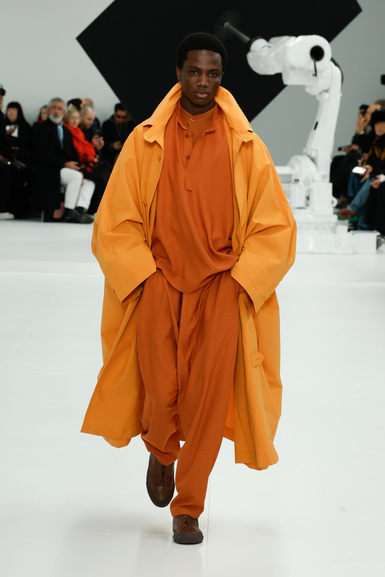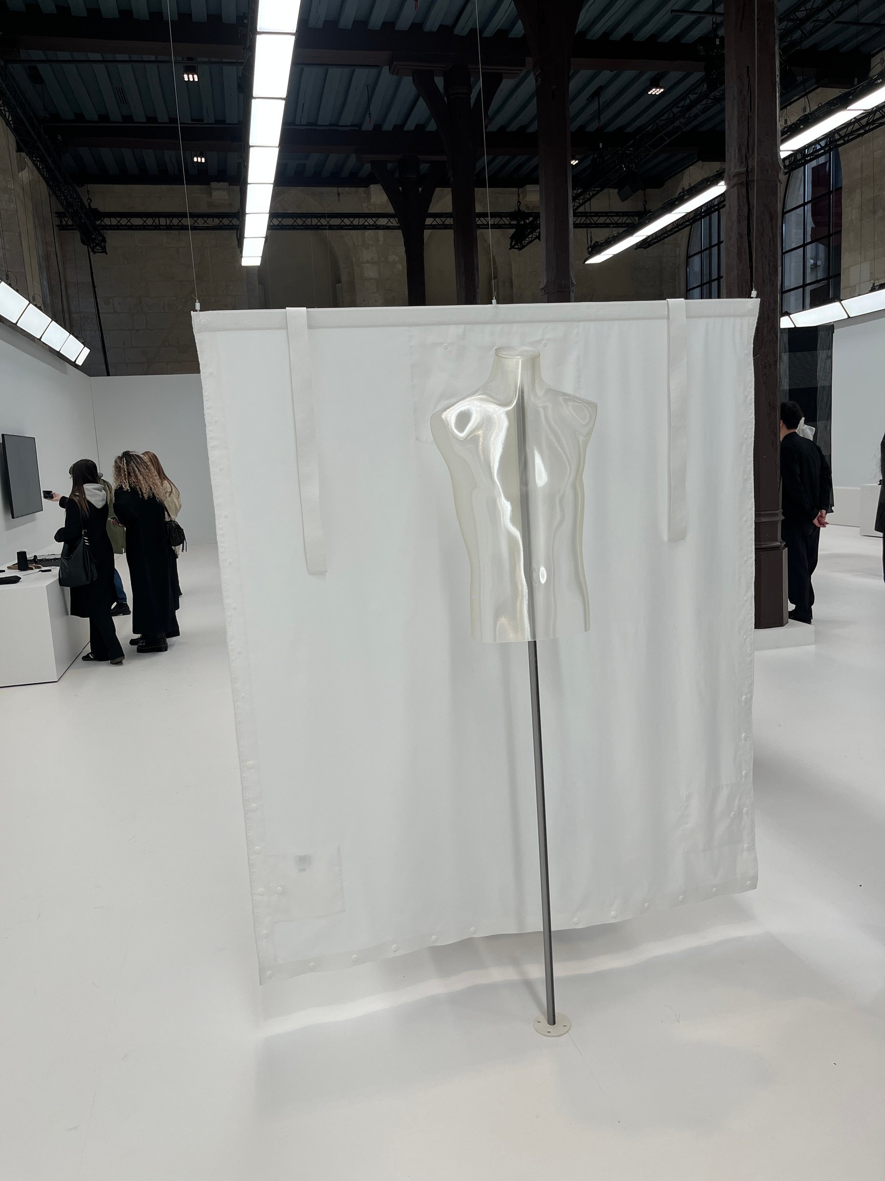 ロボットアームが動き出し、ショーが始まった。ファーストルックは、白いドレープに包まれた僧侶のような出立ちだ。織物の端すらも切り落とさない“一枚の布”でできており、風をきるように歩くと空気をはらんで膨らんだ。遠目から見ても、素材の軽さが伝わる。パッド入りの素材でさえ非常に軽く、空中に浮いているようだった。ロボットアームの機械的な動きや、黒い正方形のオブジェとしての硬さは、衣服の持つしなやかさと対照的に見えた。