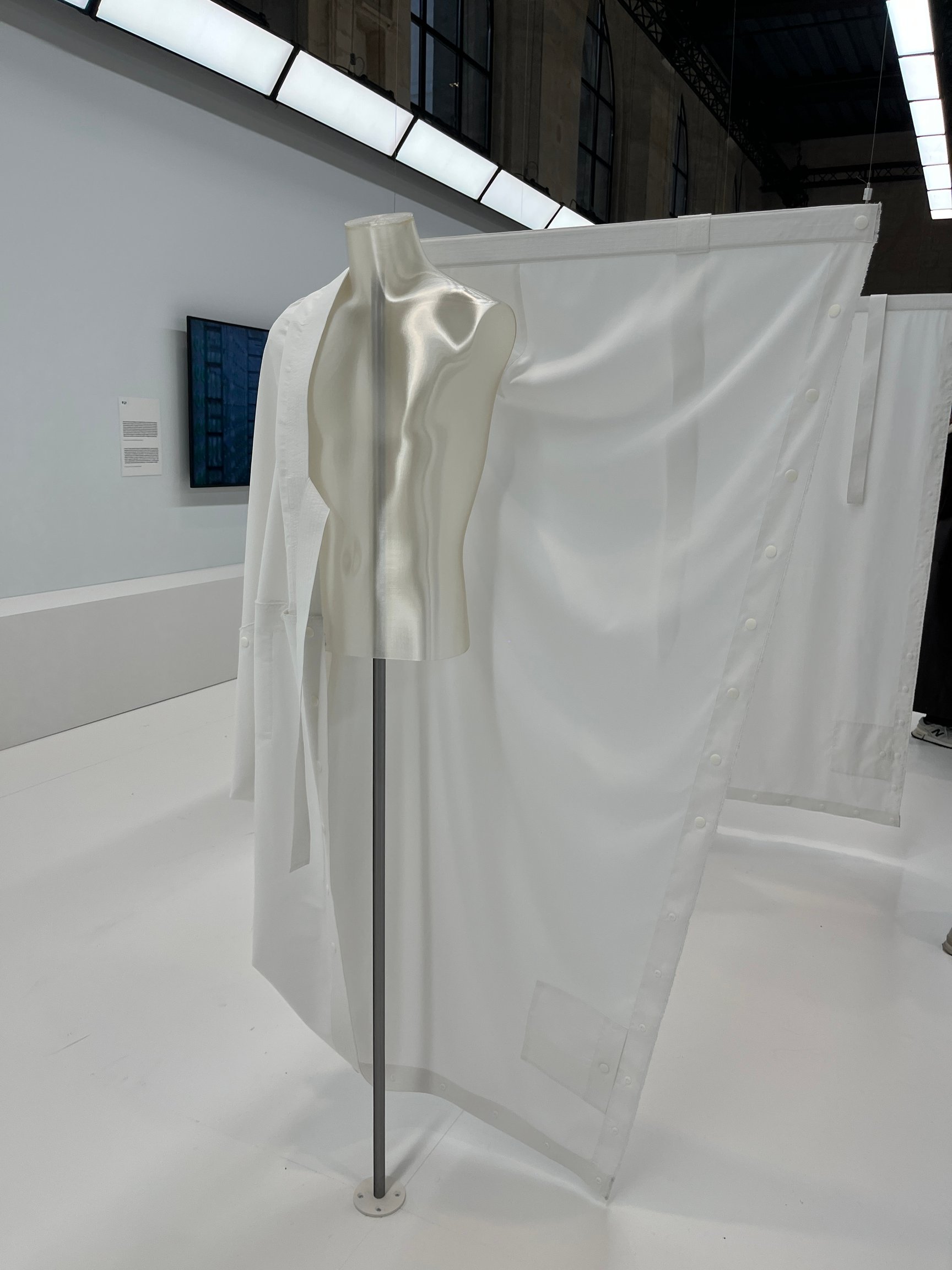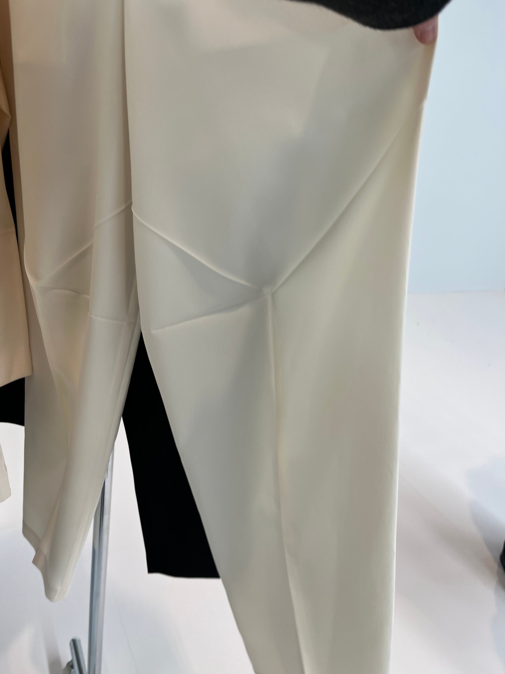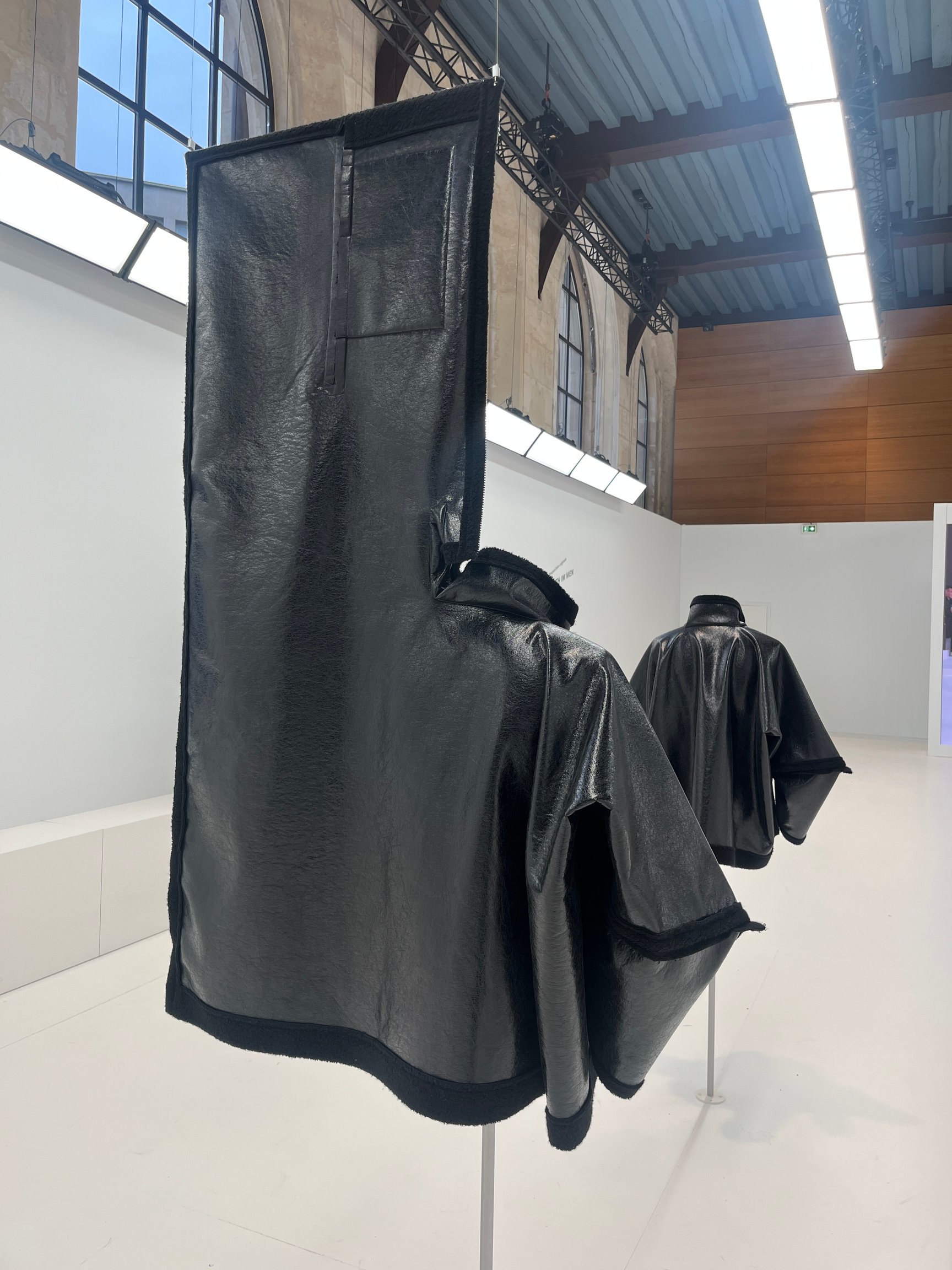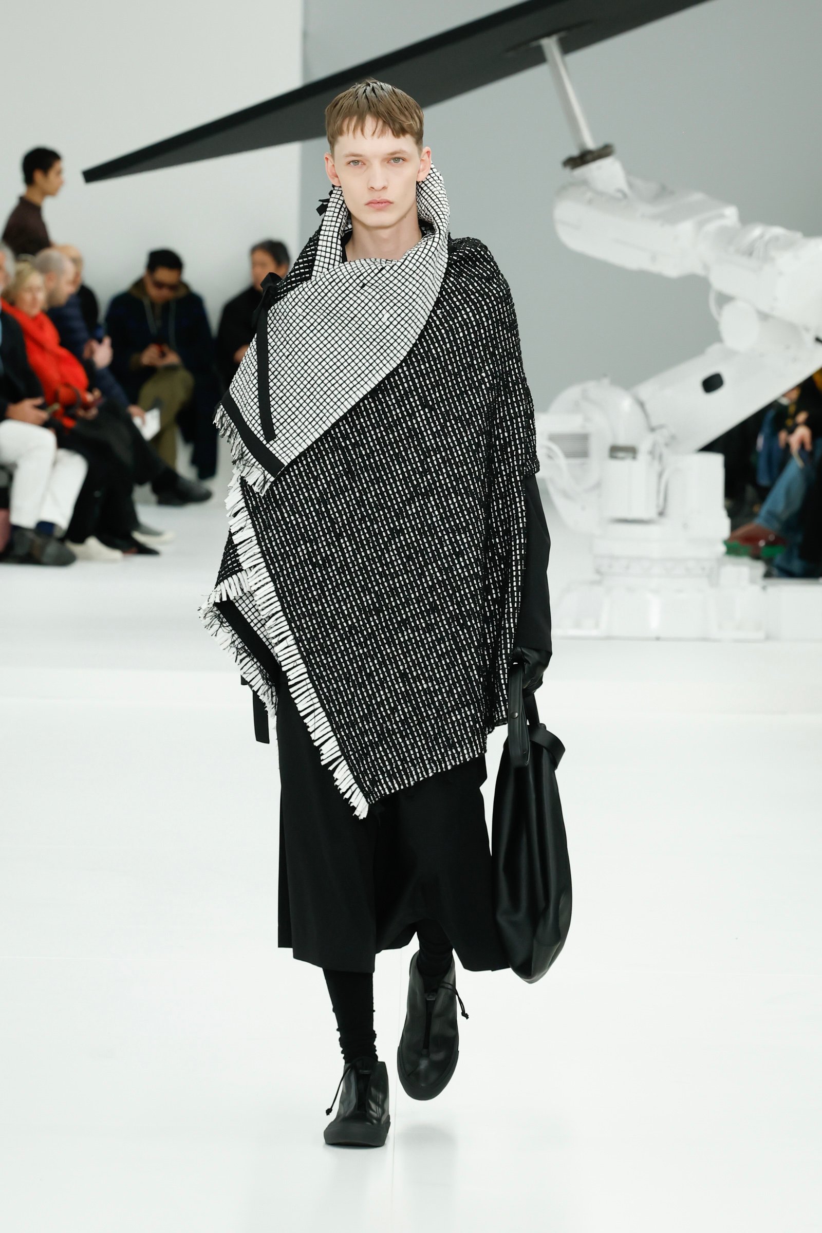 ロボットアームが動き出し、ショーが始まった。ファーストルックは、白いドレープに包まれた僧侶のような出立ちだ。織物の端すらも切り落とさない“一枚の布”でできており、風をきるように歩くと空気をはらんで膨らんだ。遠目から見ても、素材の軽さが伝わる。パッド入りの素材でさえ非常に軽く、空中に浮いているようだった。ロボットアームの機械的な動きや、黒い正方形のオブジェとしての硬さは、衣服の持つしなやかさと対照的に見えた。