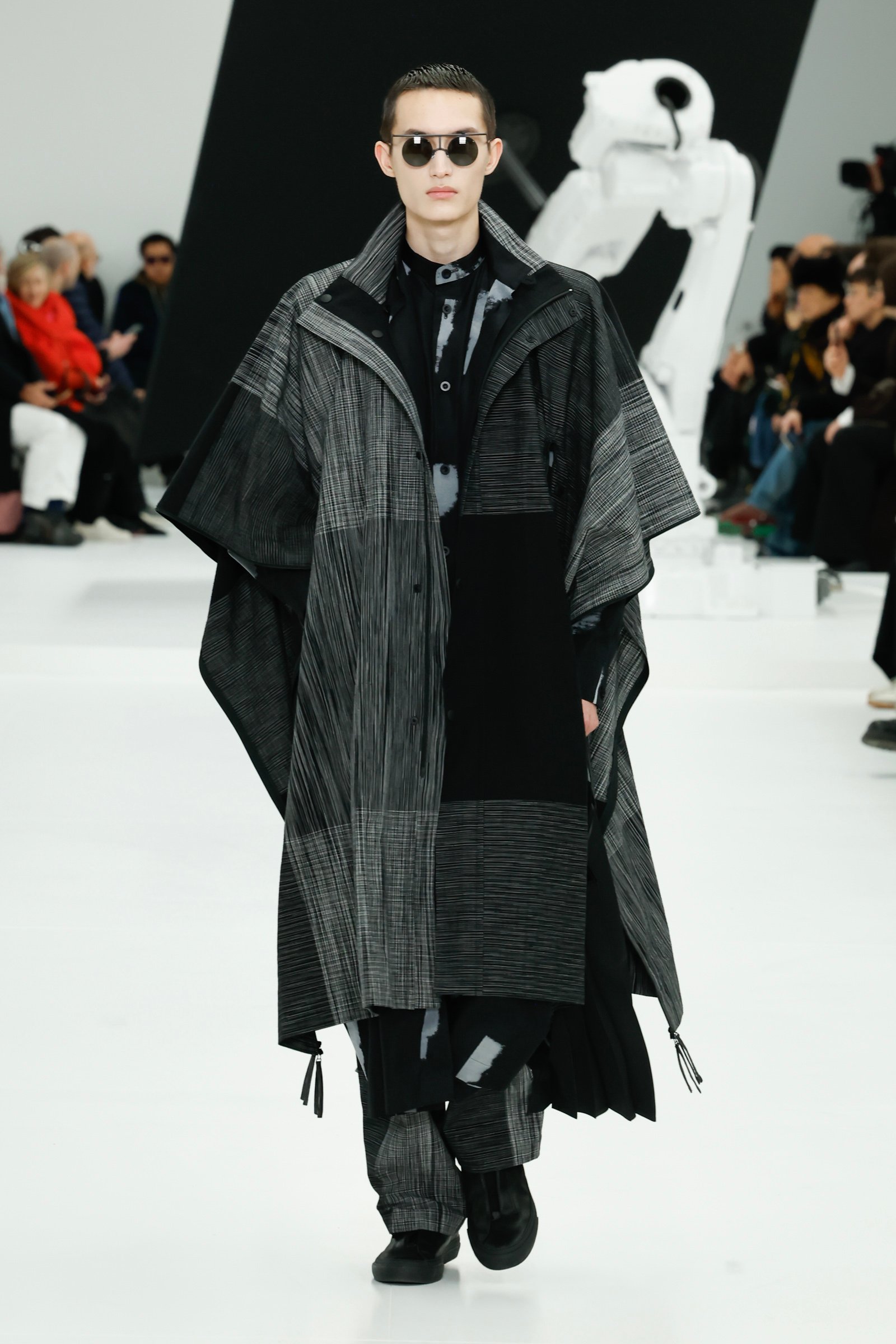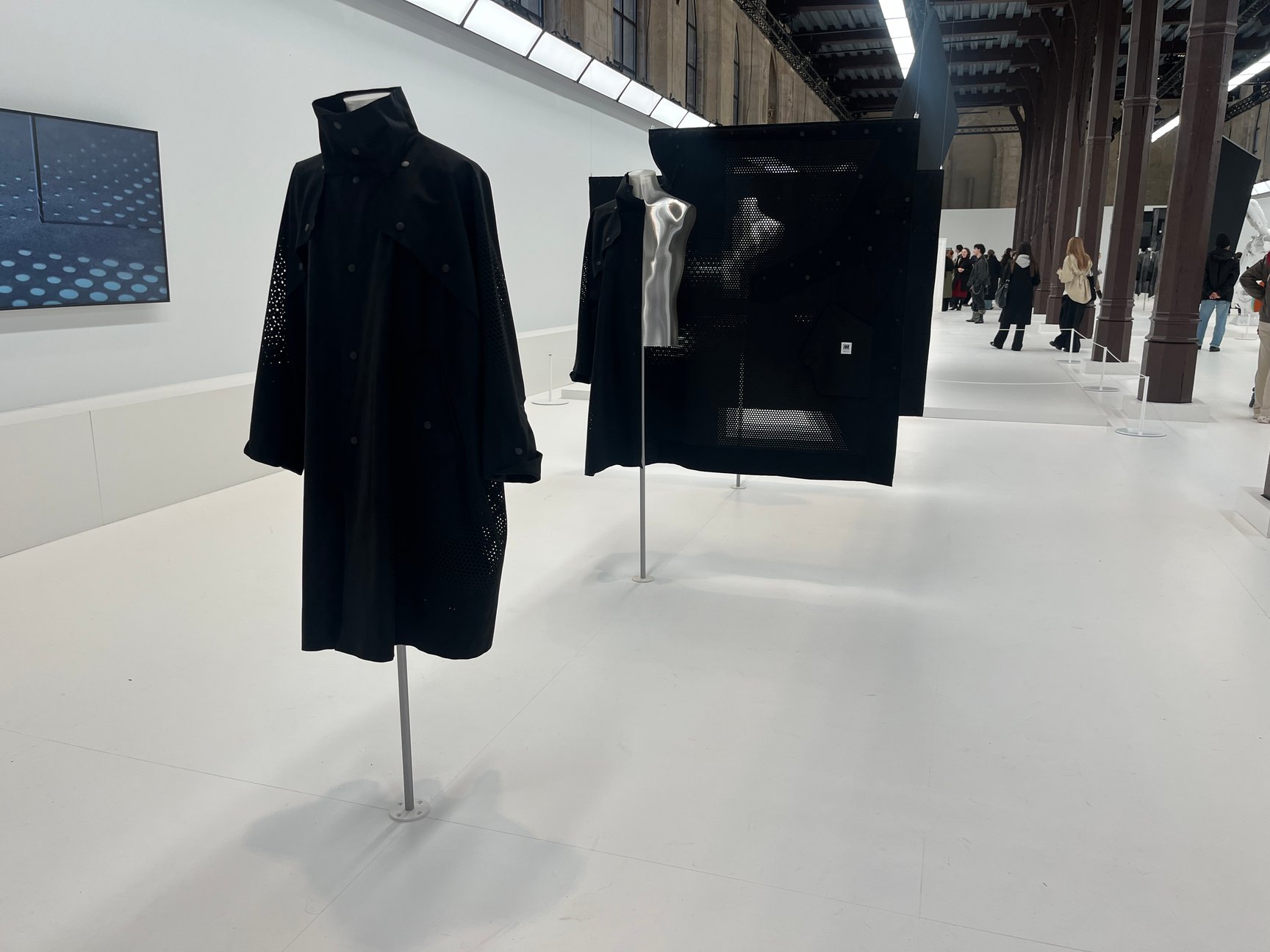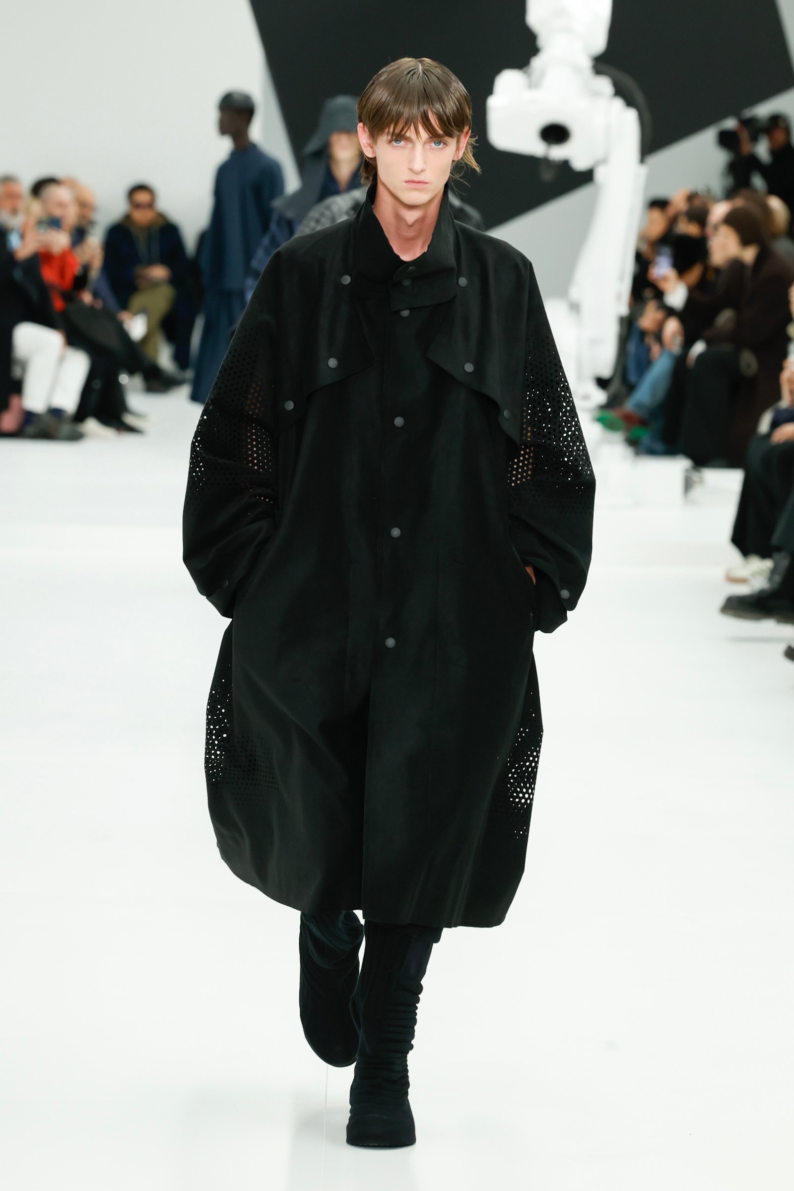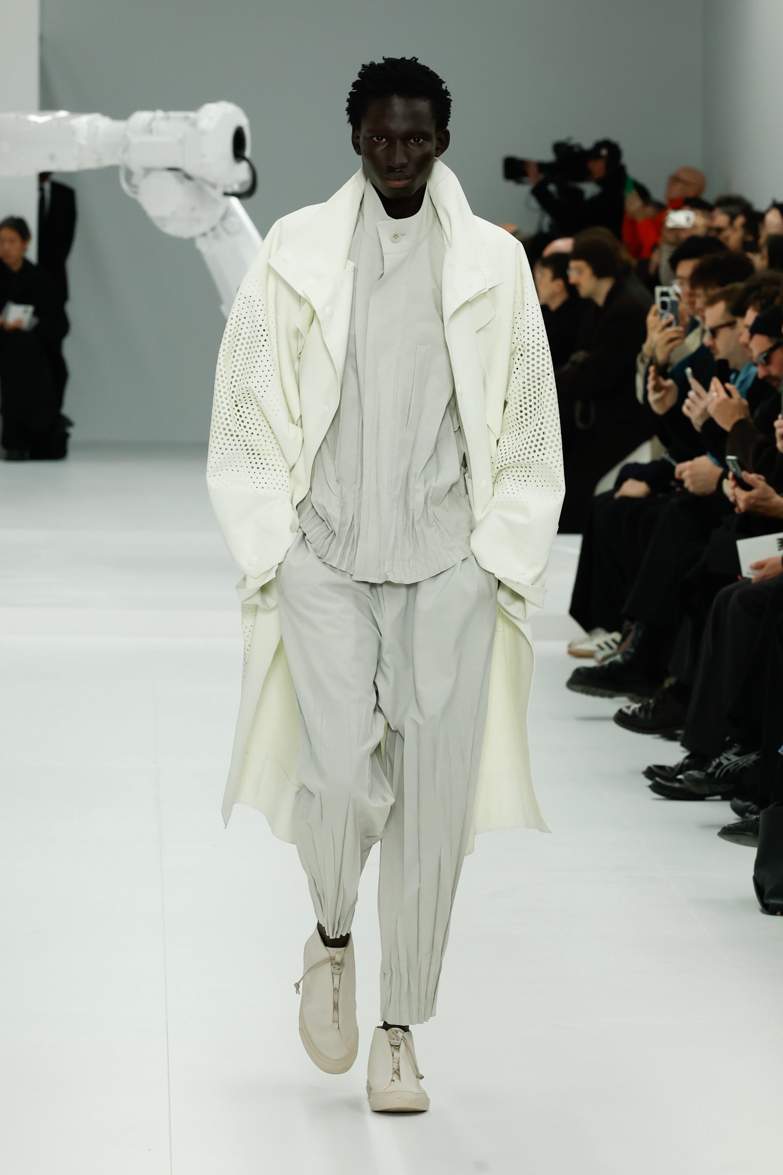 これまでは展示会ベースだった「アイム メン」だが、2019年から5年にわたりパリメンズでコレクションを発表し続けてきた「オム プリッセ イッセイ ミヤケ(HOMME PLISSE ISSEY MIYAKE)」に代わり、初のランウェイショーを行った。会場は、パリ6区のレフェクトワール・デ・コルドリエ(REFECTOIRE DES CORDELIERS)。中に入ると、白い空間の中に、黒い大きな正方形のパネルを持ったロボットアームがふたつ鎮座している。これは、アーティスト吉岡徳仁による特別な仕掛けのようだ。
