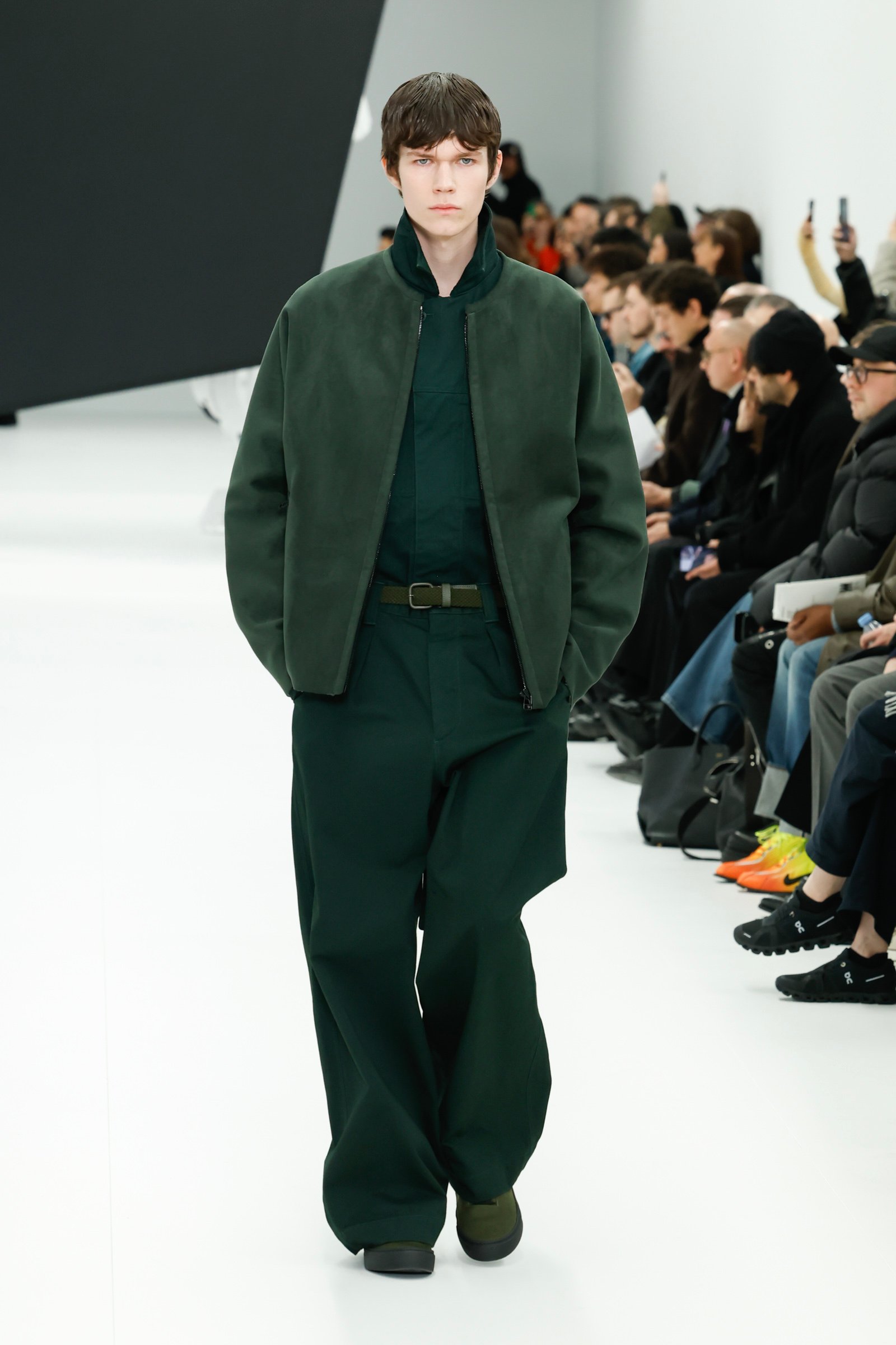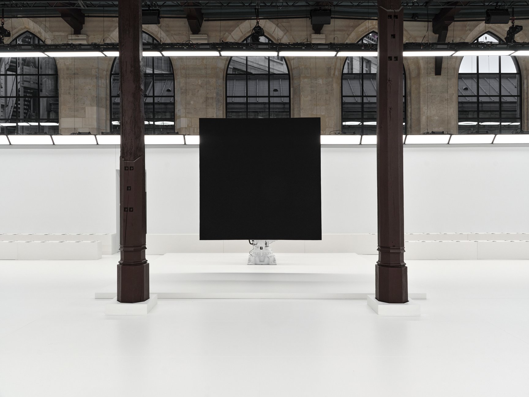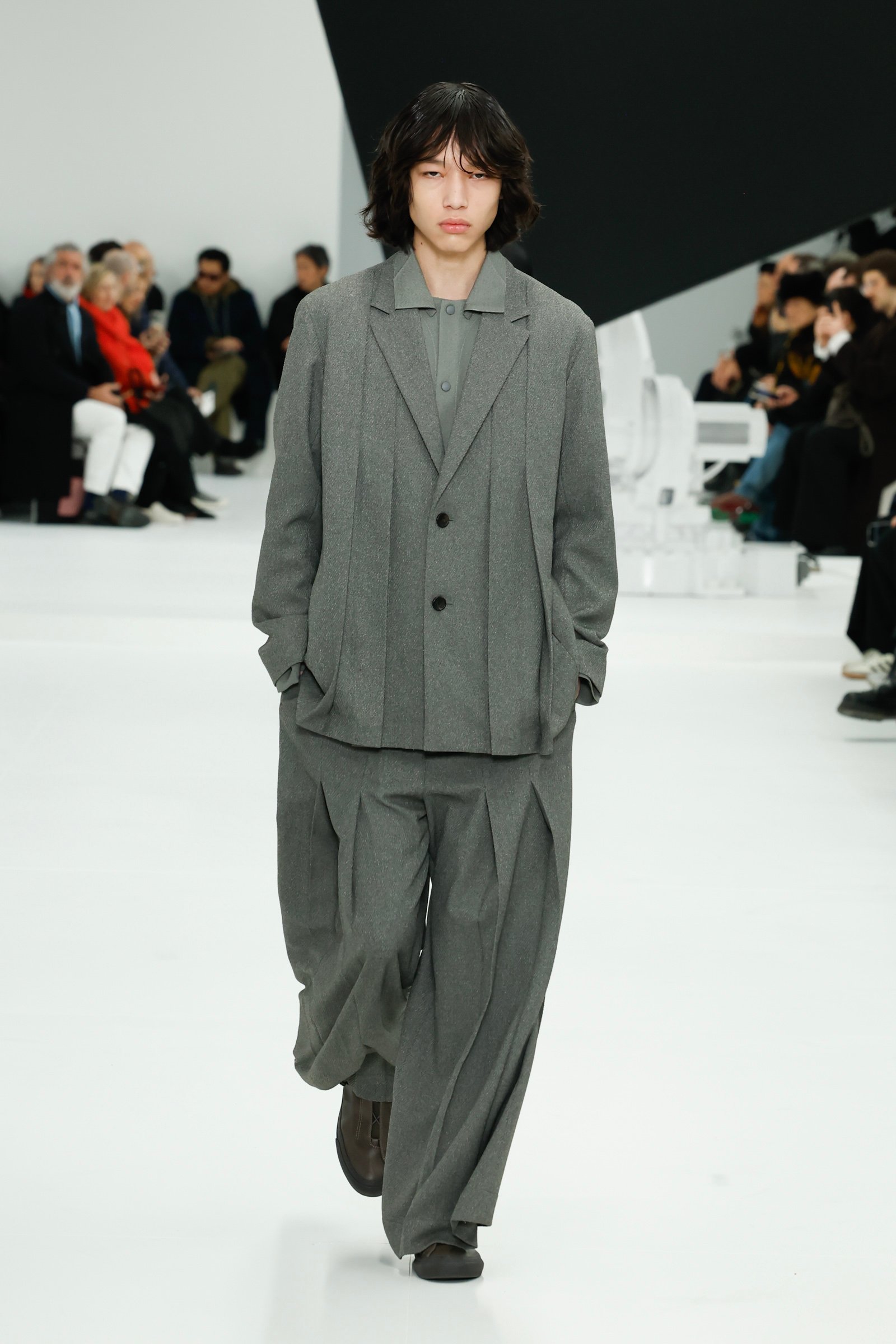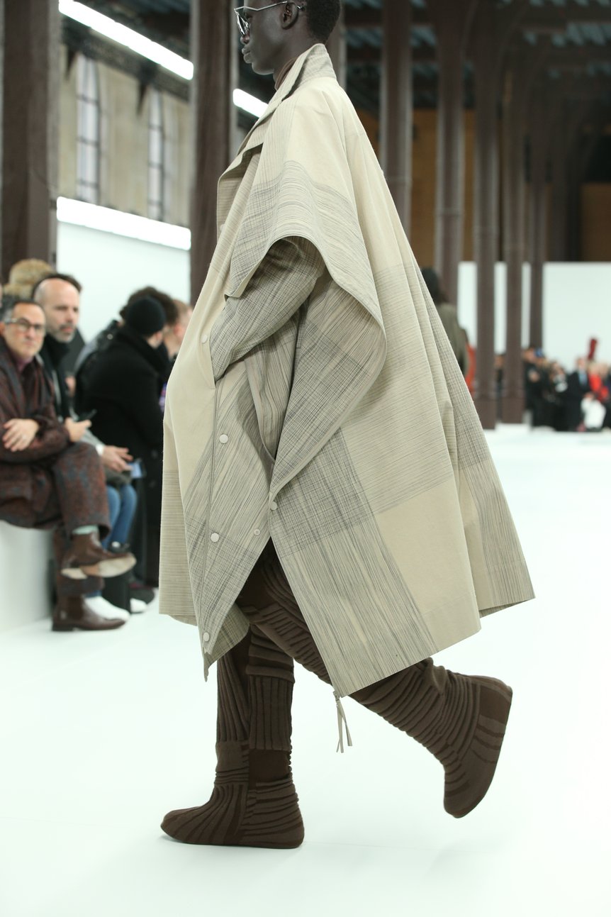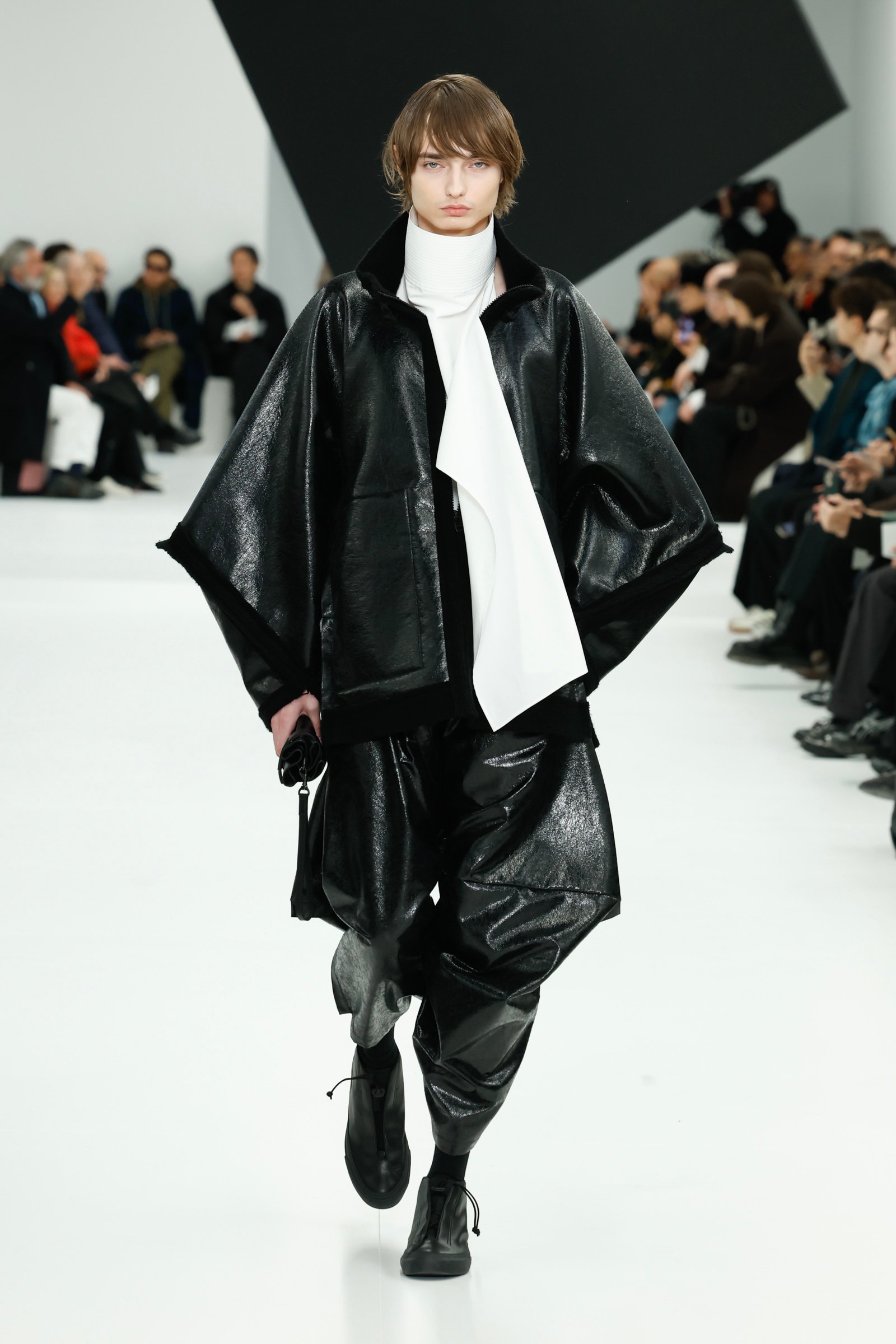 これまでは展示会ベースだった「アイム メン」だが、2019年から5年にわたりパリメンズでコレクションを発表し続けてきた「オム プリッセ イッセイ ミヤケ(HOMME PLISSE ISSEY MIYAKE)」に代わり、初のランウェイショーを行った。会場は、パリ6区のレフェクトワール・デ・コルドリエ(REFECTOIRE DES CORDELIERS)。中に入ると、白い空間の中に、黒い大きな正方形のパネルを持ったロボットアームがふたつ鎮座している。これは、アーティスト吉岡徳仁による特別な仕掛けのようだ。