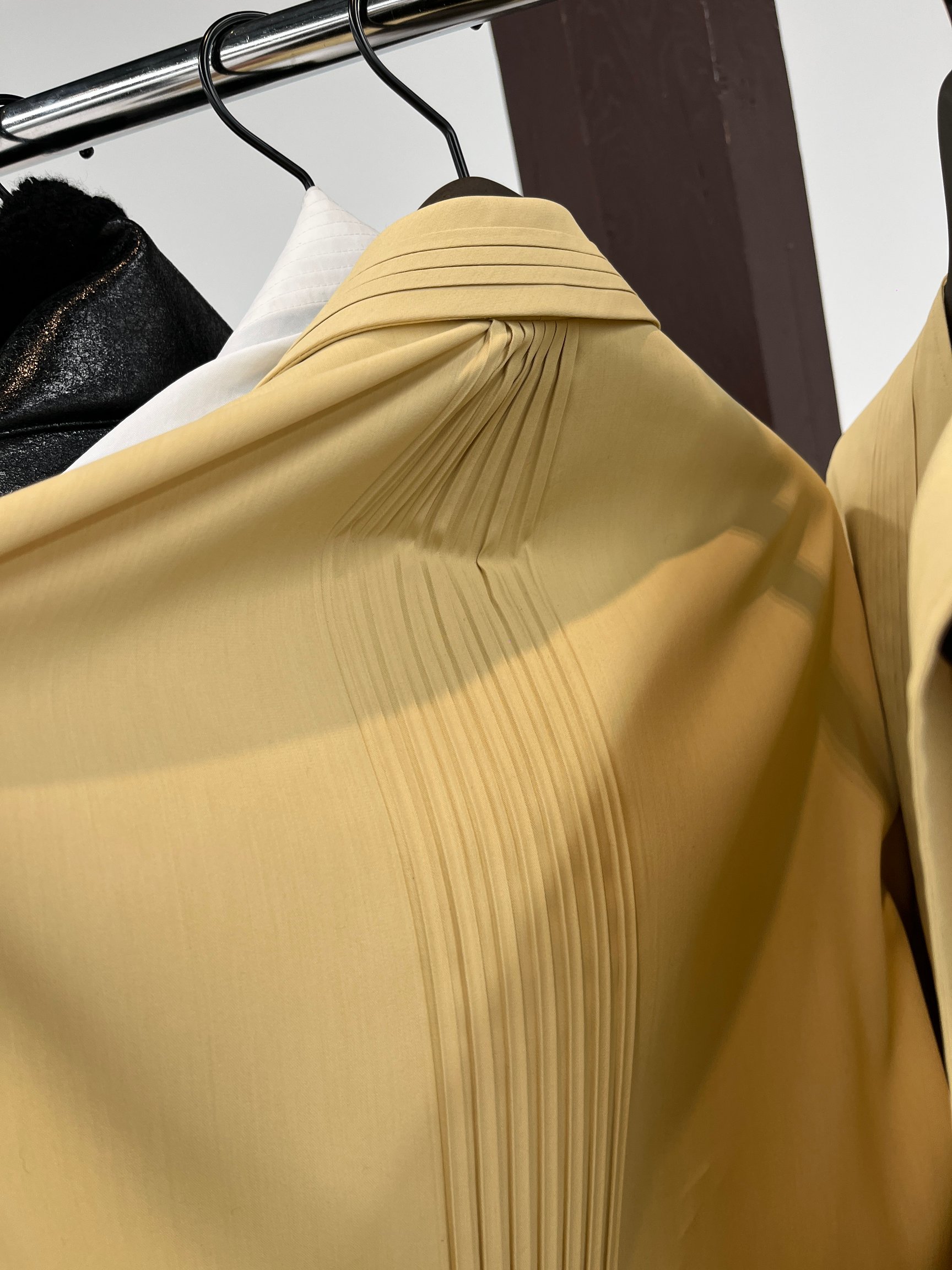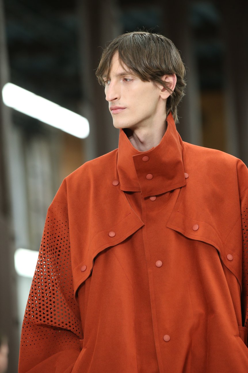 "一枚の布"だからこそ、ユニークな形が生まれ、プリーツ加工は新しいシルエットを作り出す(パンツのバリエーションは特筆したい)。ボタンをとめる位置を変えたり、ジップを開閉することで、フォルムが変わり、機能も変わる。素材が衣服として生き、テキスタイルの美しさが伝わってくる。ペールトーン、テラコッタ、ダークグリーンなど、色の出し方も見事で、裂織や絣といった伝統的な技術もモダンに取り入れられていた。すべてはエンジニアリングされたプロダクトでありながら、無機質で温もりに欠けることはなく、感覚に訴えかけるものがあった。