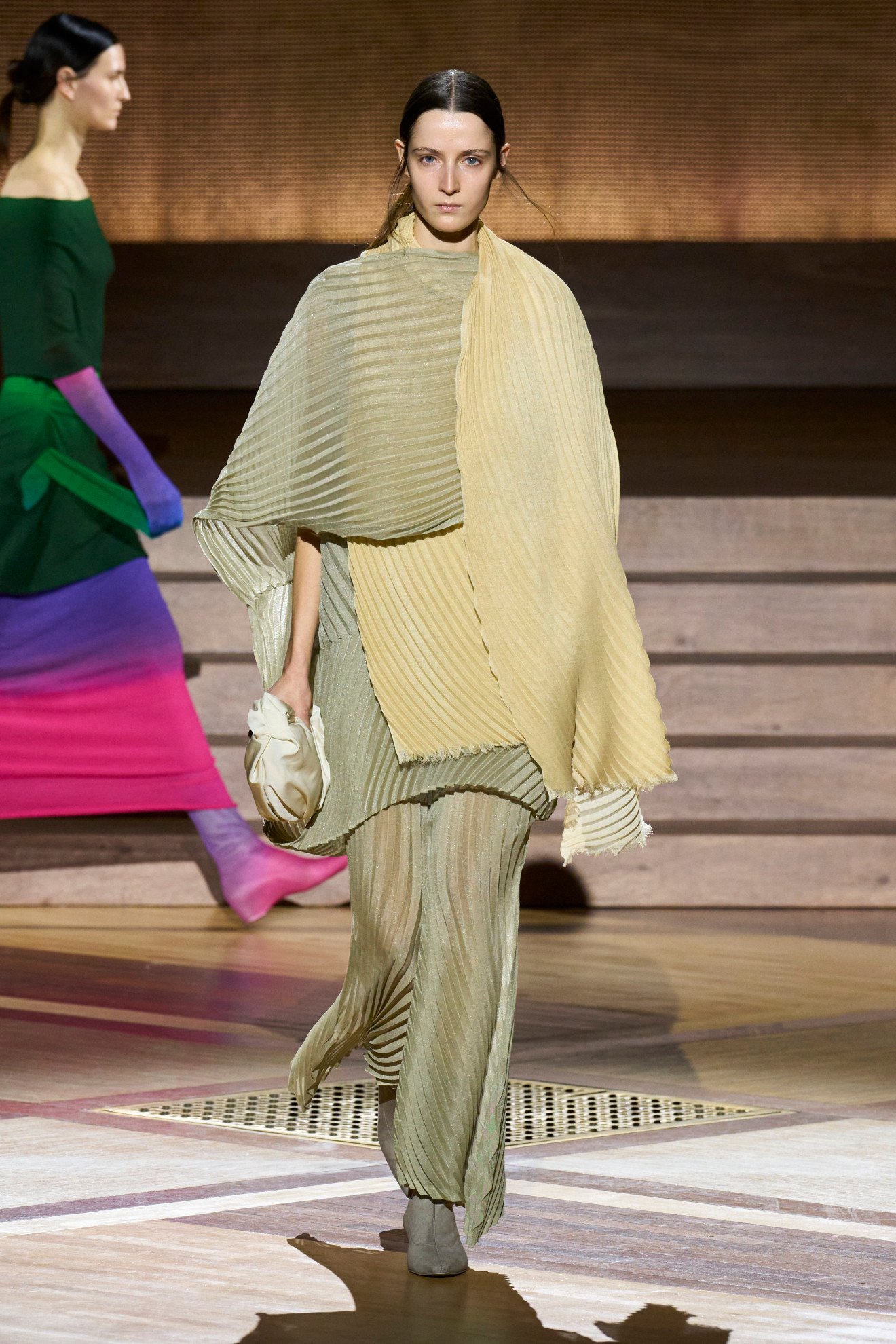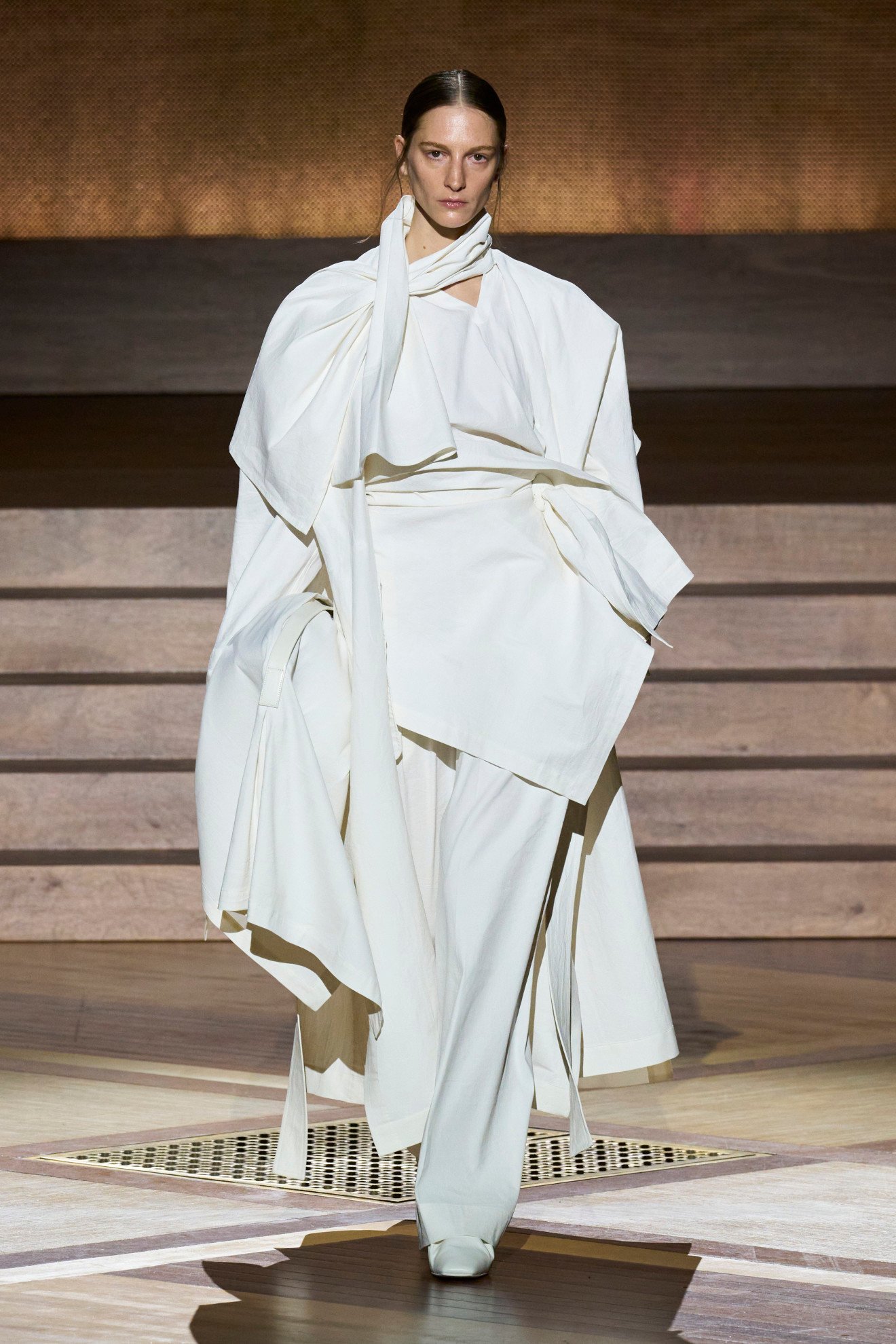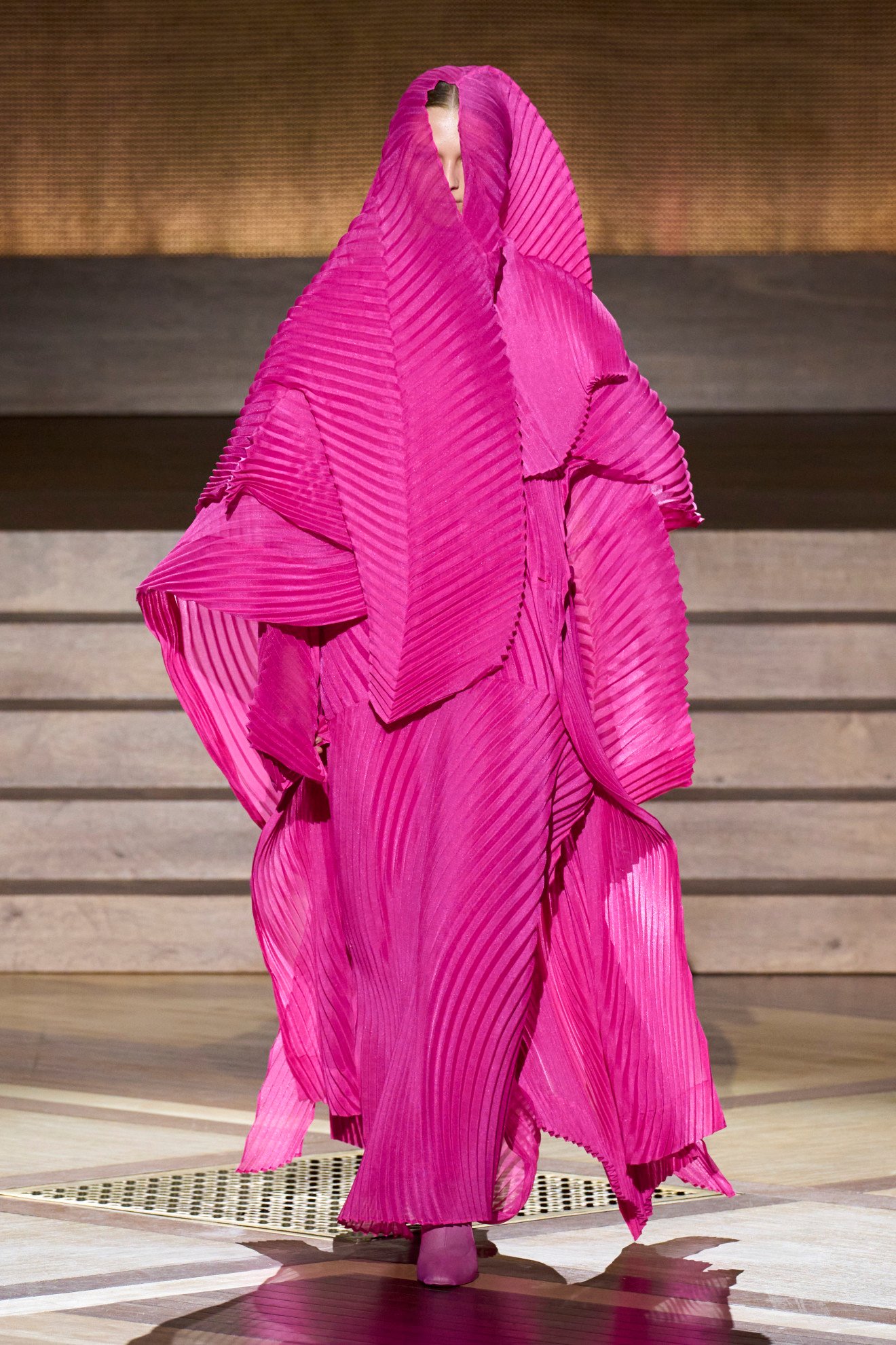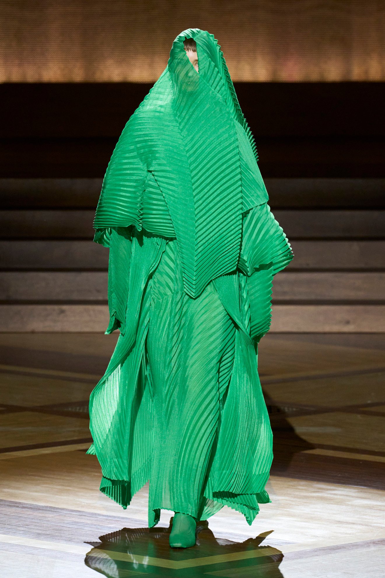 終盤は、有機的なフォルムのハンドプリーツのルックが登場。空気を含んだゆとりのあるシルエットが、どこか旅人を想起させる。布をまとうというシンプルな行為から生まれる、ドレープやねじれ、非対称なパターン。一枚の布が持つ本質的な美しさや強さを、イッセイ ミヤケらしい素材使いやテクニックで、潔く魅せたコレクションだった。