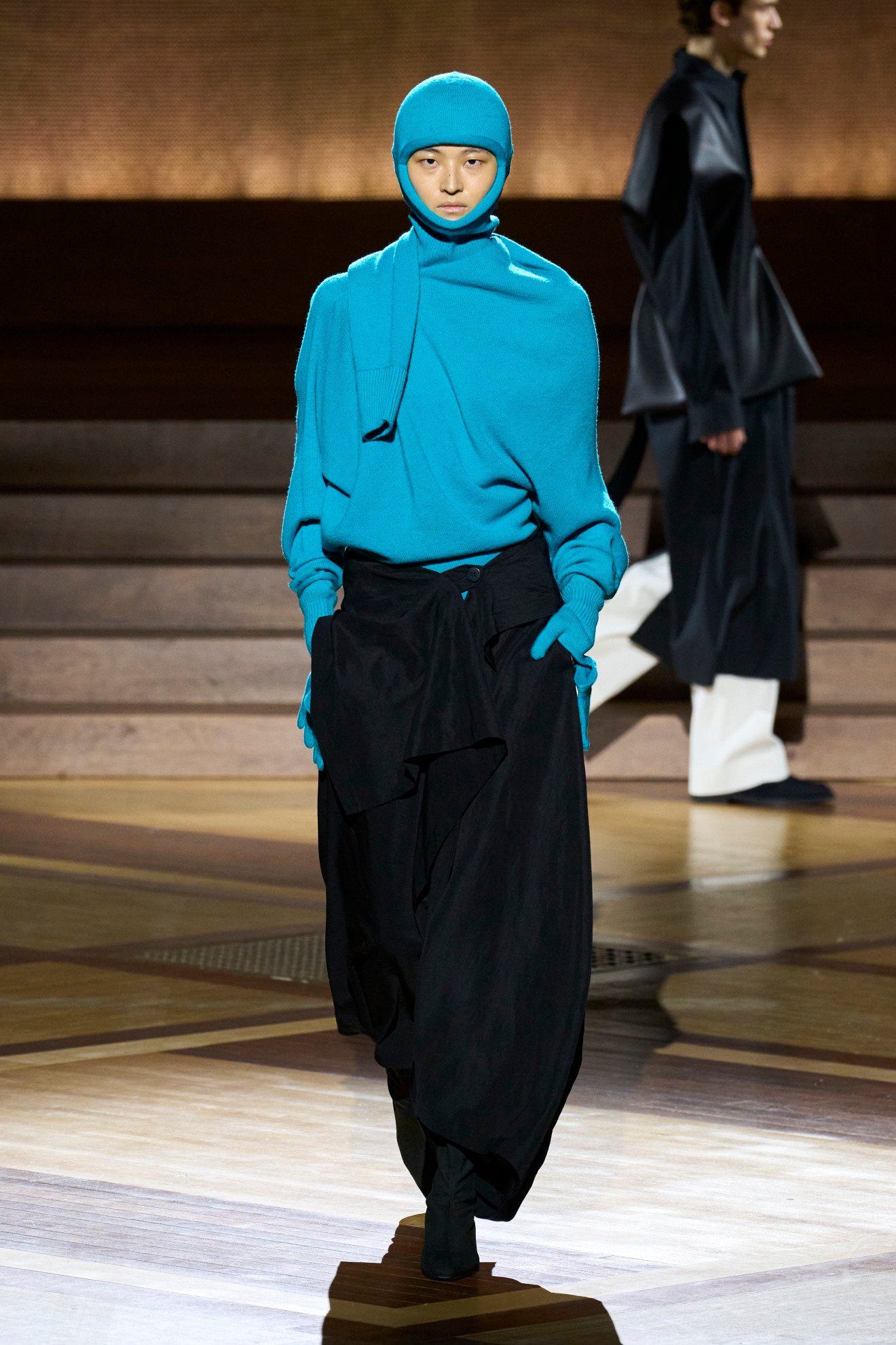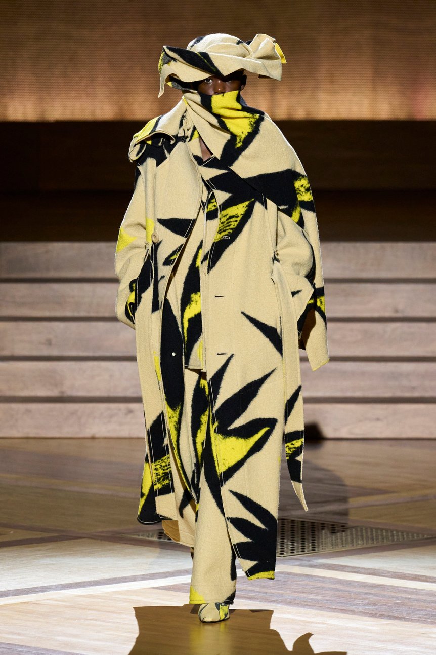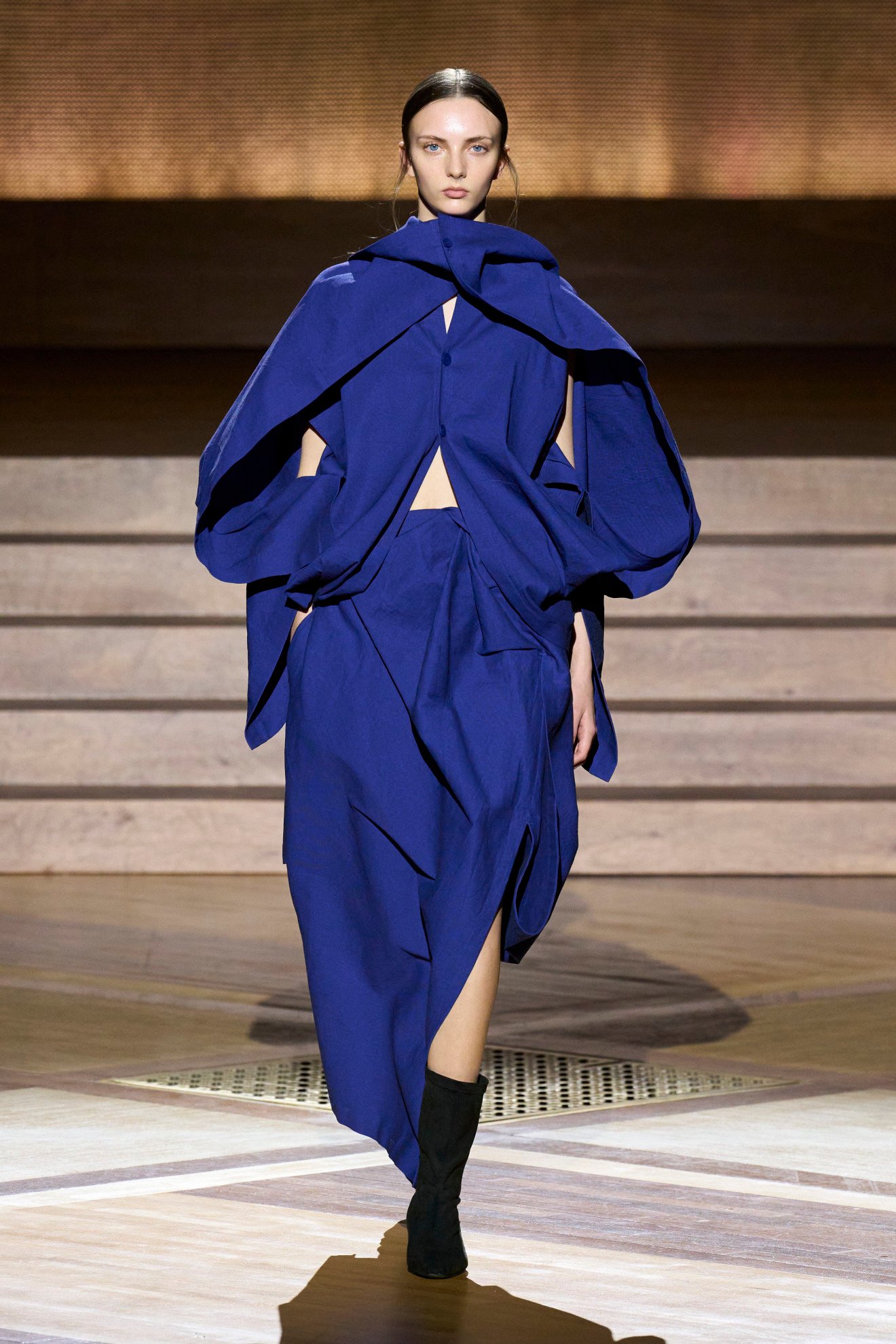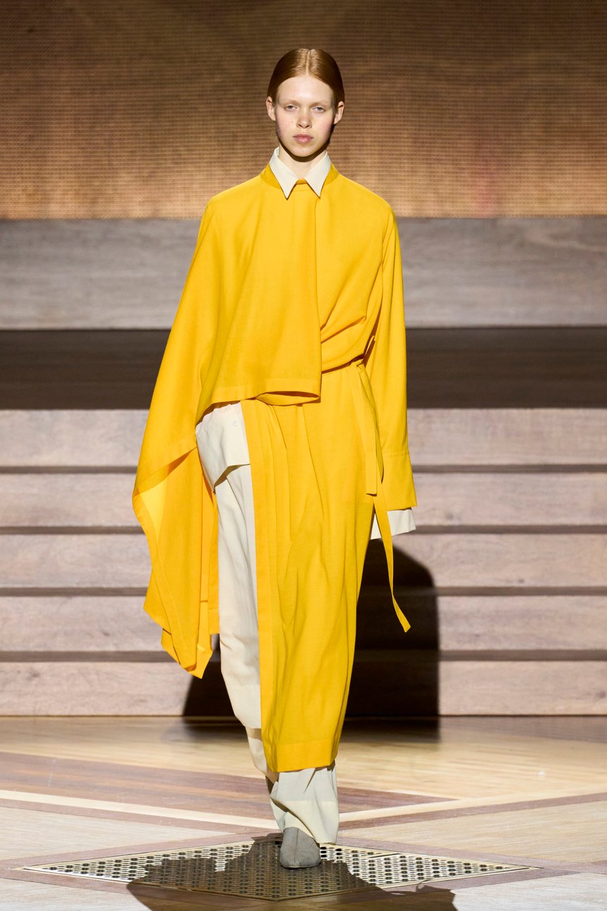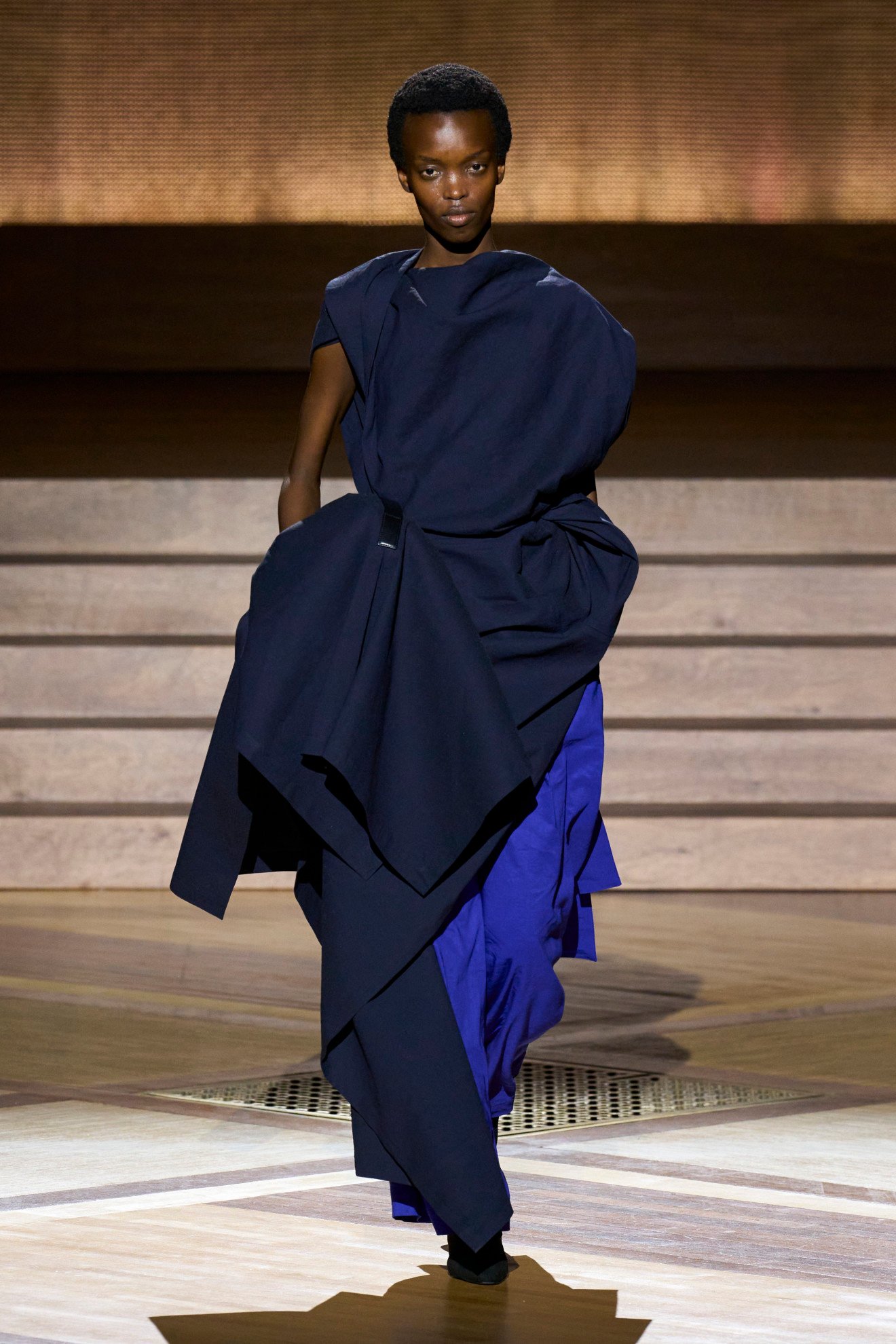終盤は、有機的なフォルムのハンドプリーツのルックが登場。空気を含んだゆとりのあるシルエットが、どこか旅人を想起させる。布をまとうというシンプルな行為から生まれる、ドレープやねじれ、非対称なパターン。一枚の布が持つ本質的な美しさや強さを、イッセイ ミヤケらしい素材使いやテクニックで、潔く魅せたコレクションだった。