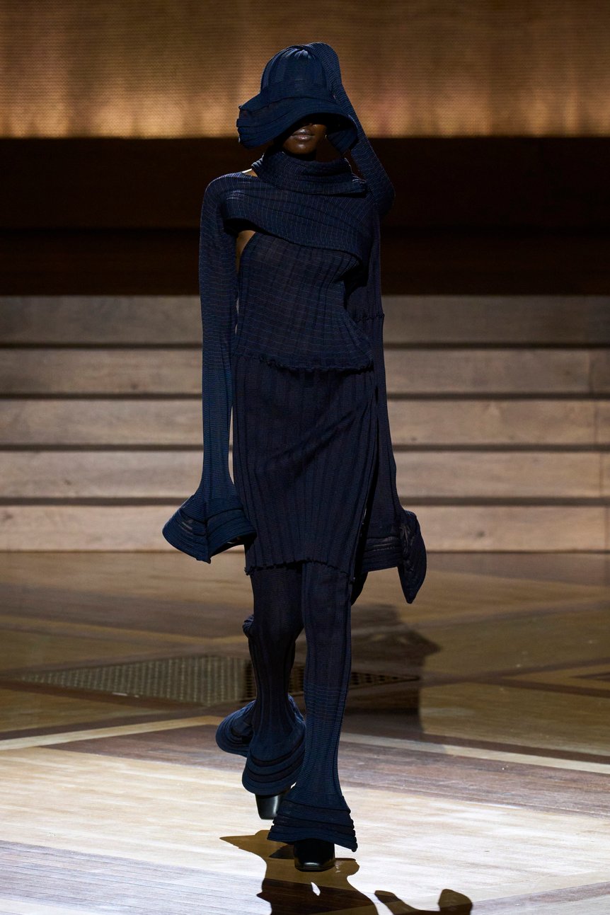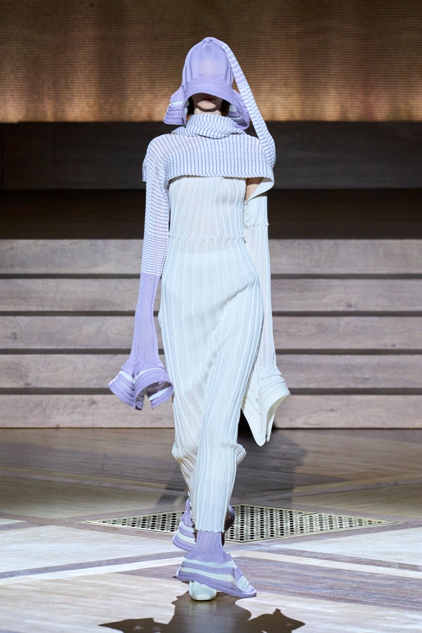 ショーは、アサガオのようなフォルムが特徴の無縫製ニットシリーズからスタート。袖口や裾の花のような造形はガーター編みで、筒状のフォルムが生き生きとした立体感をプラス。袖を首元に巻きつけたり、帽子のようにかぶったりと、ニットを自由にまとうことができるプレイフルな仕様だ。