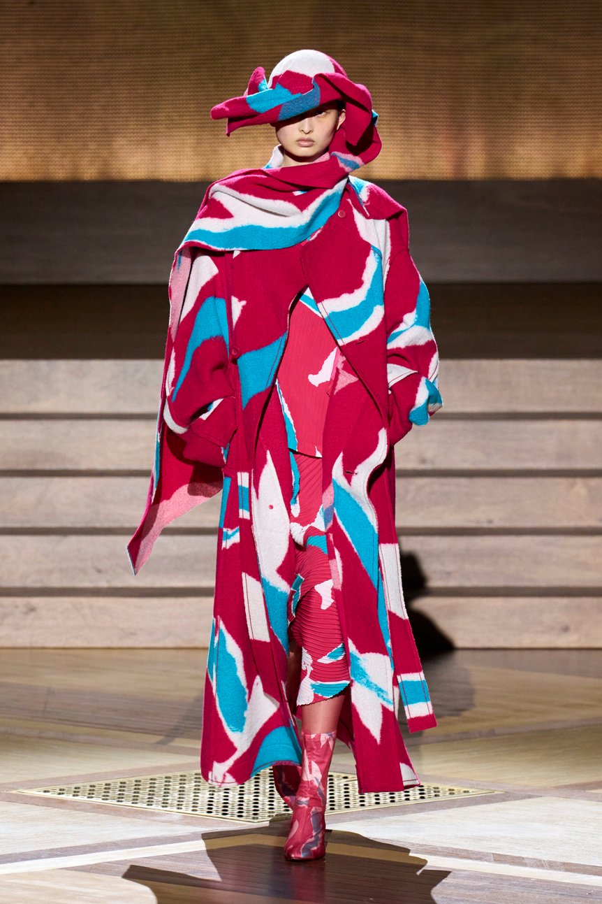ショー中盤に登場したのは、色彩を重ね合わせるというコンセプトで作られた、重ね着しているように見える二重構造の無縫製ニットシリーズ。さらに続く、秋の七草をイメージした柄のシリーズは、繊細さと荒々しさを兼ね備える。ヴィヴィッドなカラーコントラストが、コレクションに華やかさをプラスした。