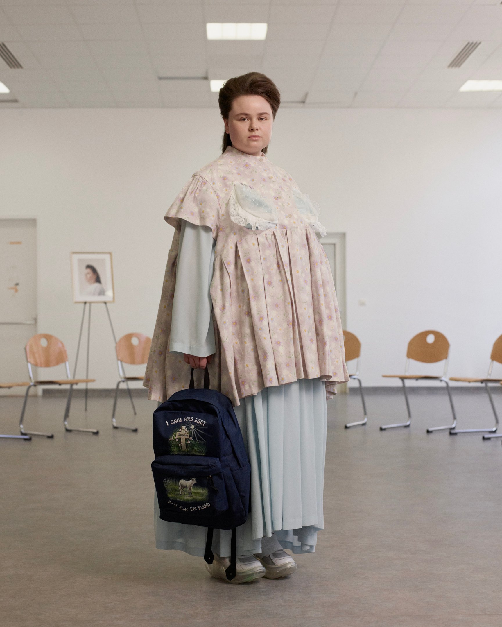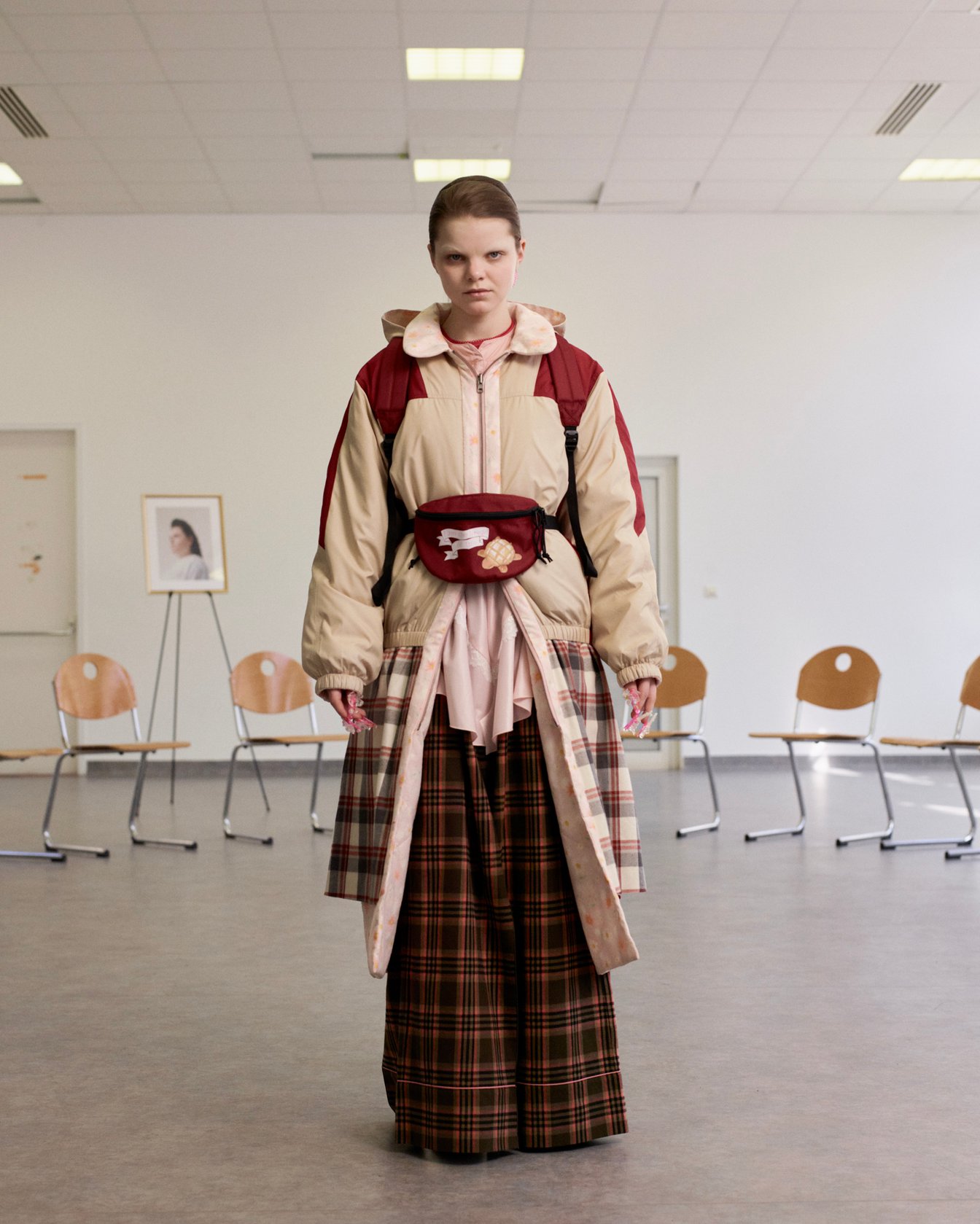 ほかにも、どこかノスタルジックに感じるカラーバランスのロングコートに、ウエストポーチとリュックを抱えてやってきた学校帰りのようなキャラクターも登場。ロングコートはレイヤードに見えるが、襟元から花柄、腰からチェックの生地が繋がった一着に仕上がっている。観客は服に隠された違和感をたよりに、「the invitation」の招待者は誰なのだろうと考えながら、コレクション全体を客観的に理解していこうとするのだが、いつ間にかその儀式的な集いの一員へと誘われている。すっかりジェニーファックスの世界観に取り込まれ、出口に向かった先には、1人のキャラクターによる自信に満ちた表情のポートレイトがをゴールドの額縁に飾られていた。
