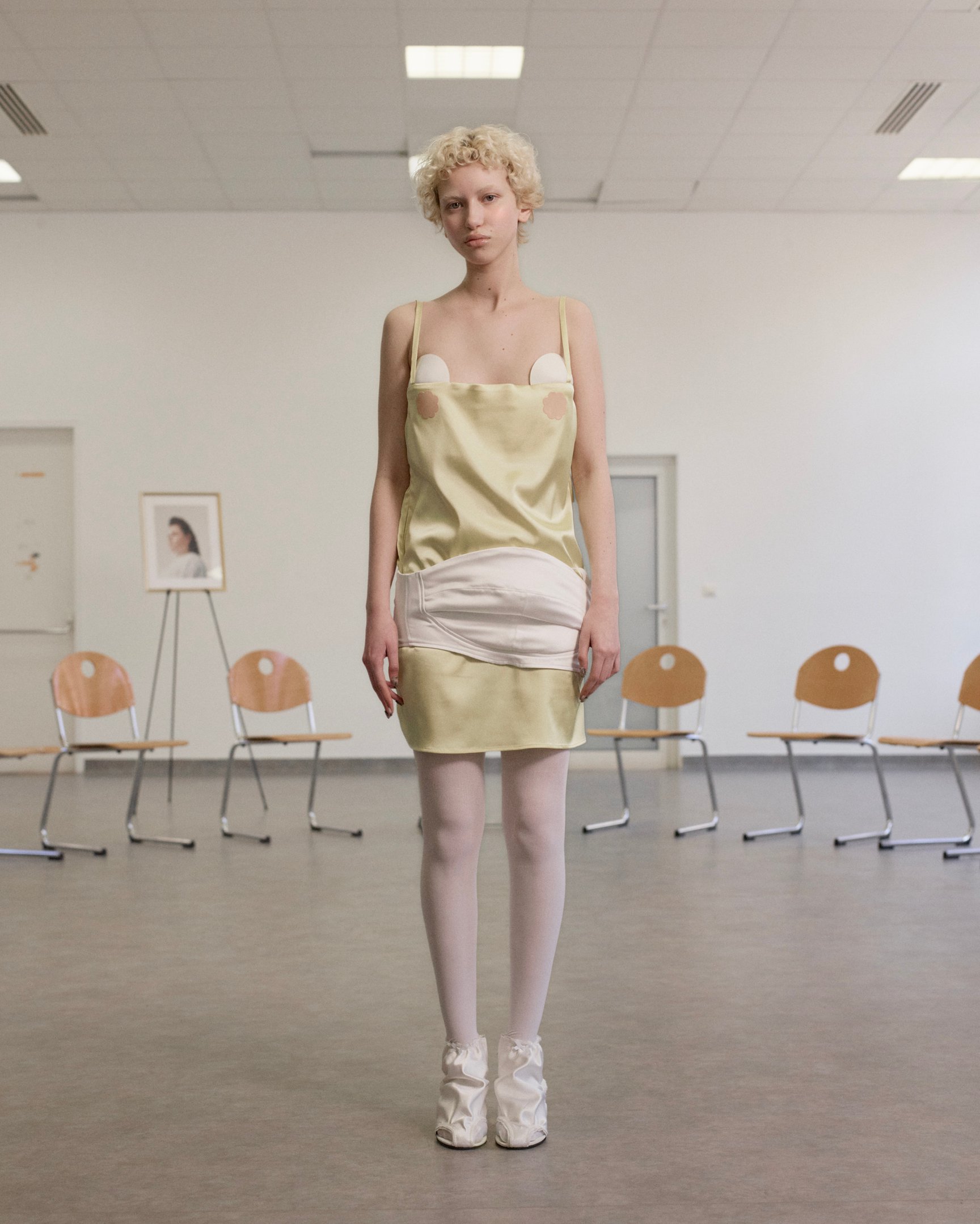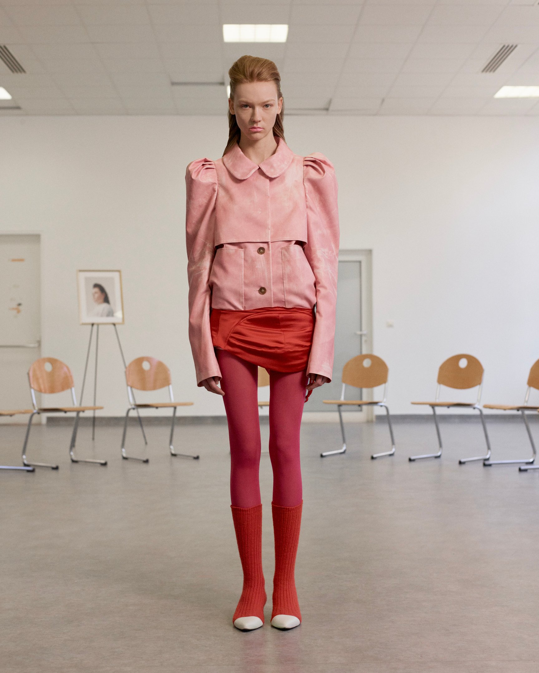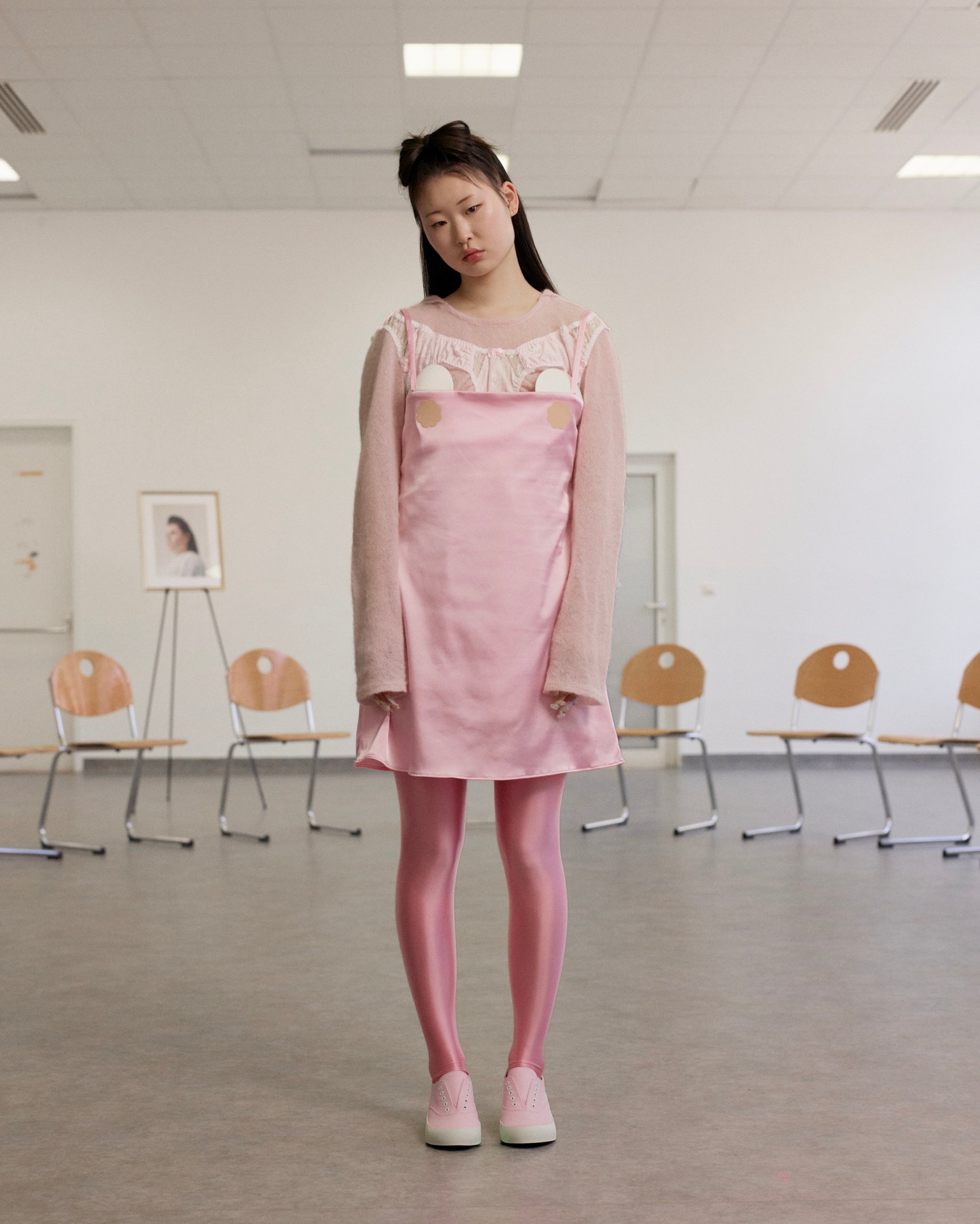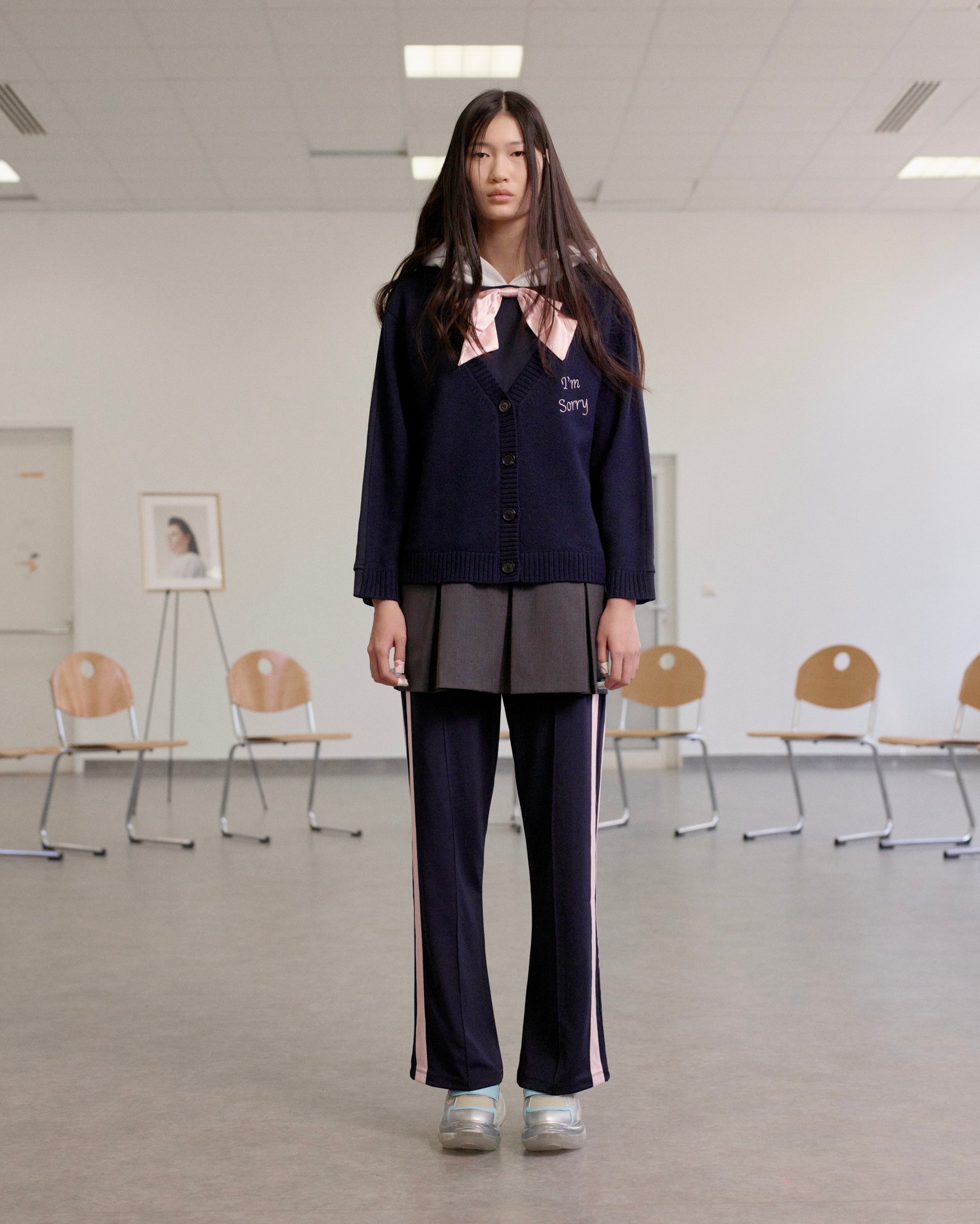 ランジェリードッキングドレスは、華奢な身体からパッドもニップレスもずり下がって見えてしまっているキャミソールワンピースに応用。腰には、ビッグサイズのコルセットブラがスカート上に巻かれている。また過去コレクションから引き続き、ジェニーファックスが社会規範を表すものとして扱ってきたスクールユニフォームも展開。ネイビーのニットカーディガンに、ピンクのラインが入ったジャージパンツとミニスカート合わせた制服は一見すると普通に見えるが、胸元に「I’m Sorry」、背中には大胆に「Sorry!!!」とプリントが入り、指先には痛々しい絆創膏が巻かれ、どこか自信なさげな立ち姿だ。