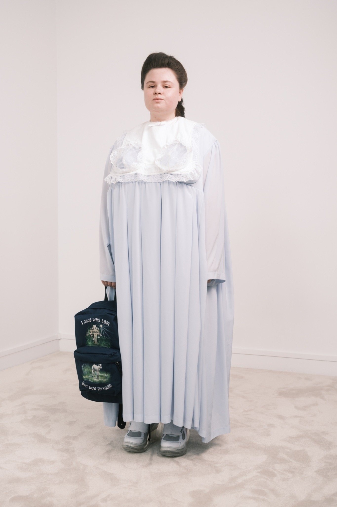そんなジェン・ファンの姿は、自信に満ち溢れた表情で佇む1人のキャラクターに重ねてみえる。前回のコレクションで「協会から帰宅中の少女」を演じた同じモデルを起用し、引き続きゆったりとしたロングドレスにオールバックの姿。