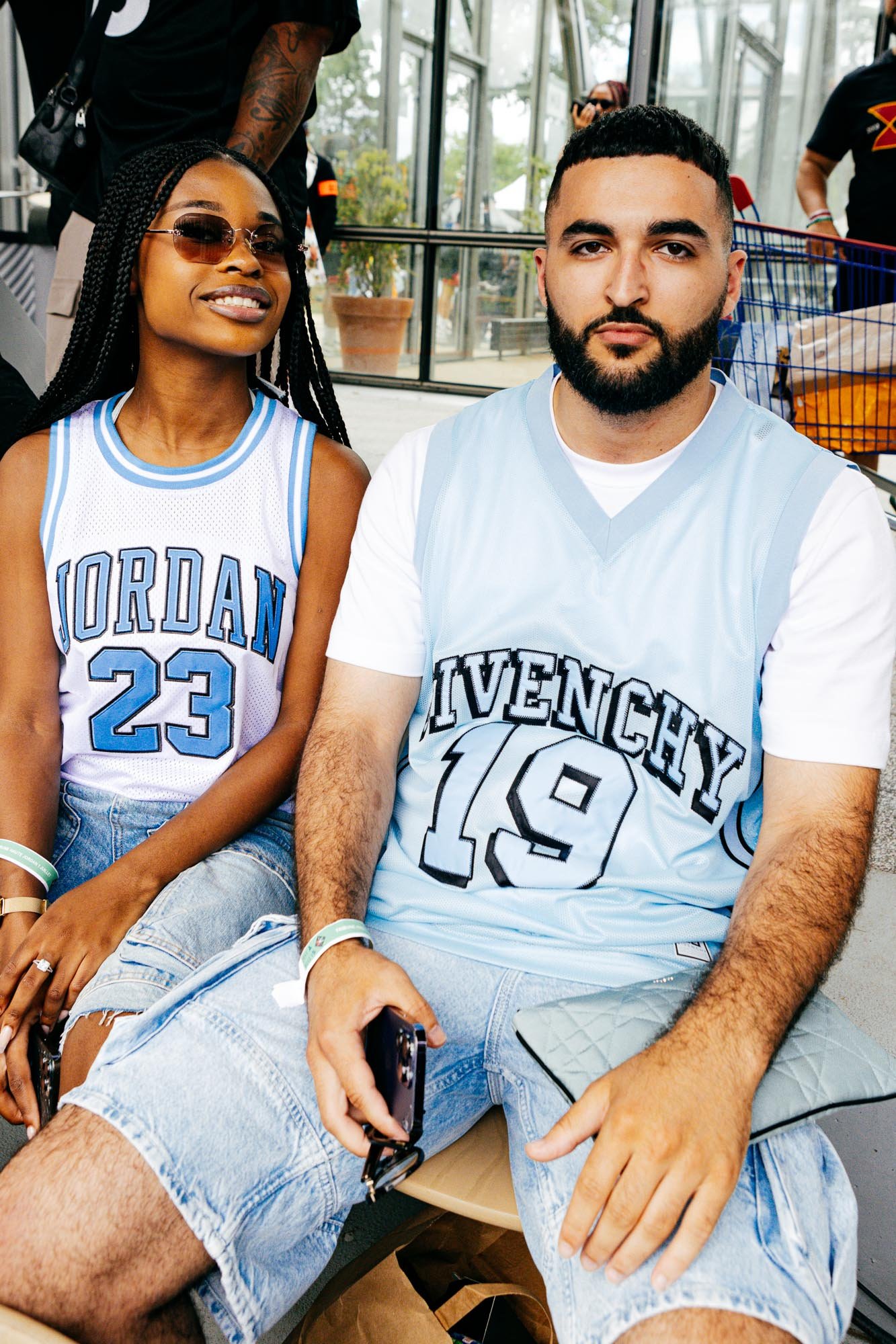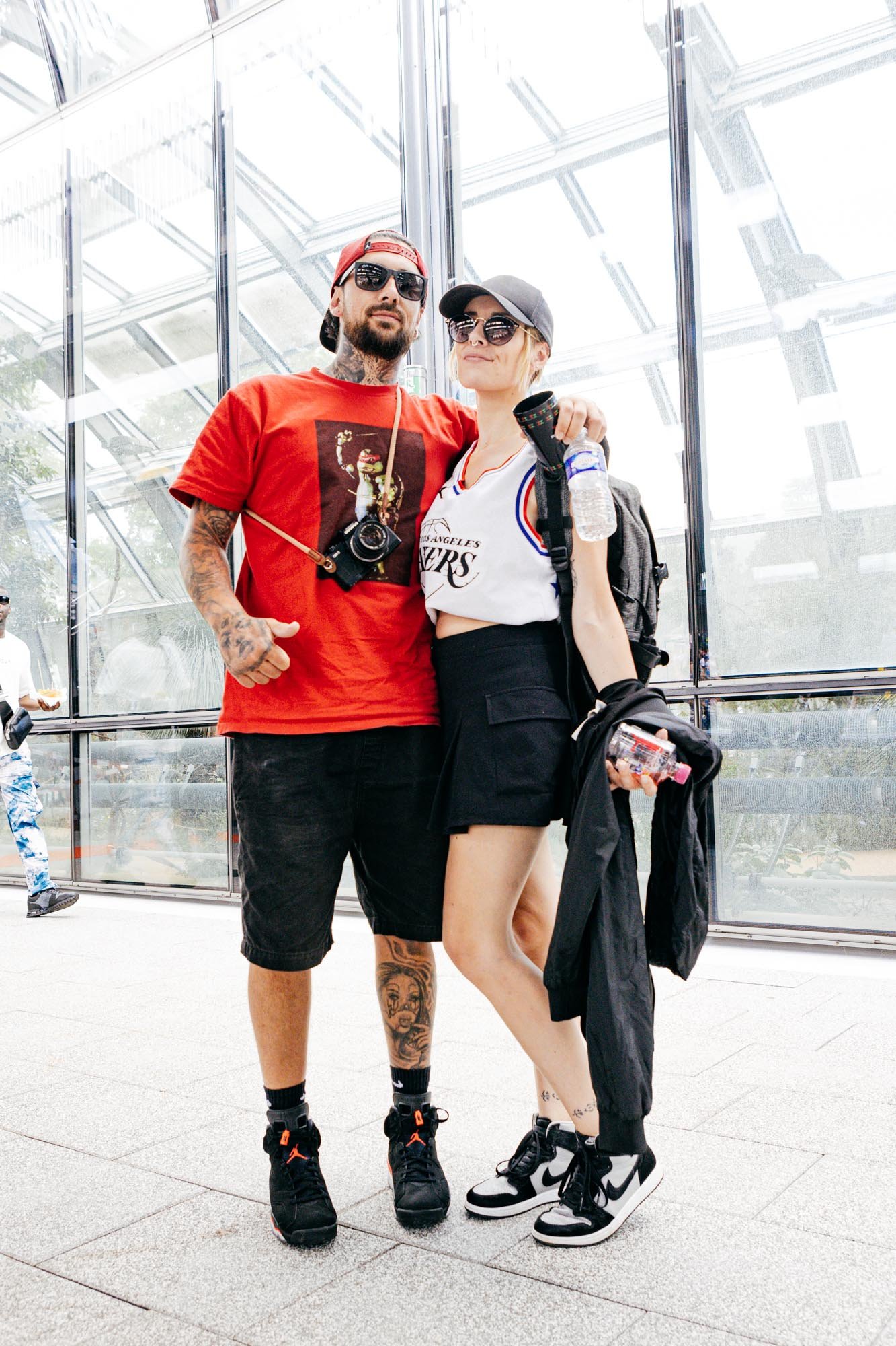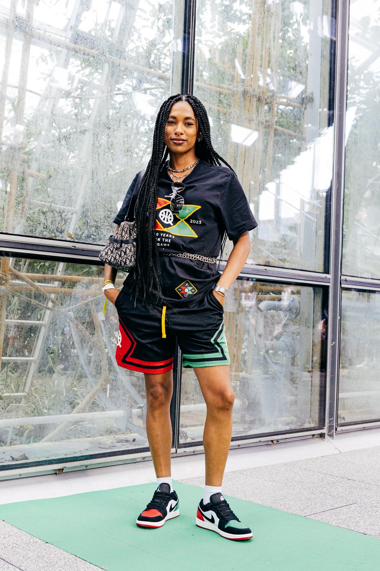 最後に来場者のスナップで、バスケカルチャーが感じられる最新スタイルをチェック。バスケットボールをルーツに持つシューズや、バスケジャージを取り入れたスポーティーな着こなしを楽しんでいました。
