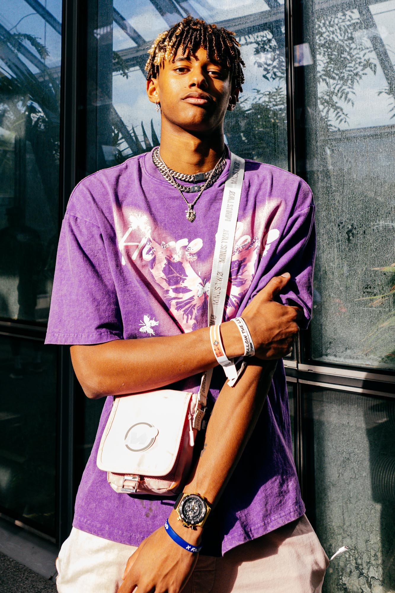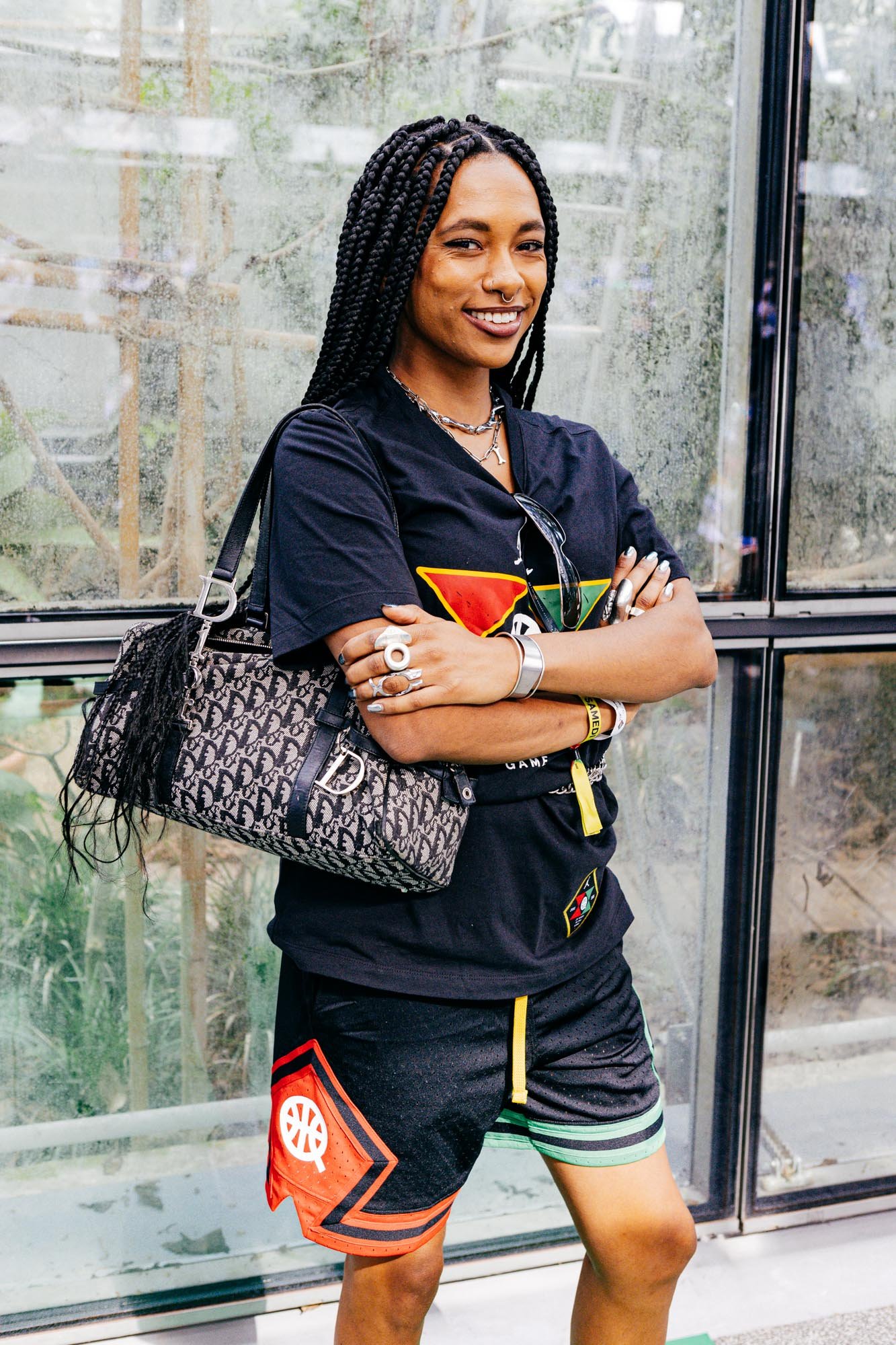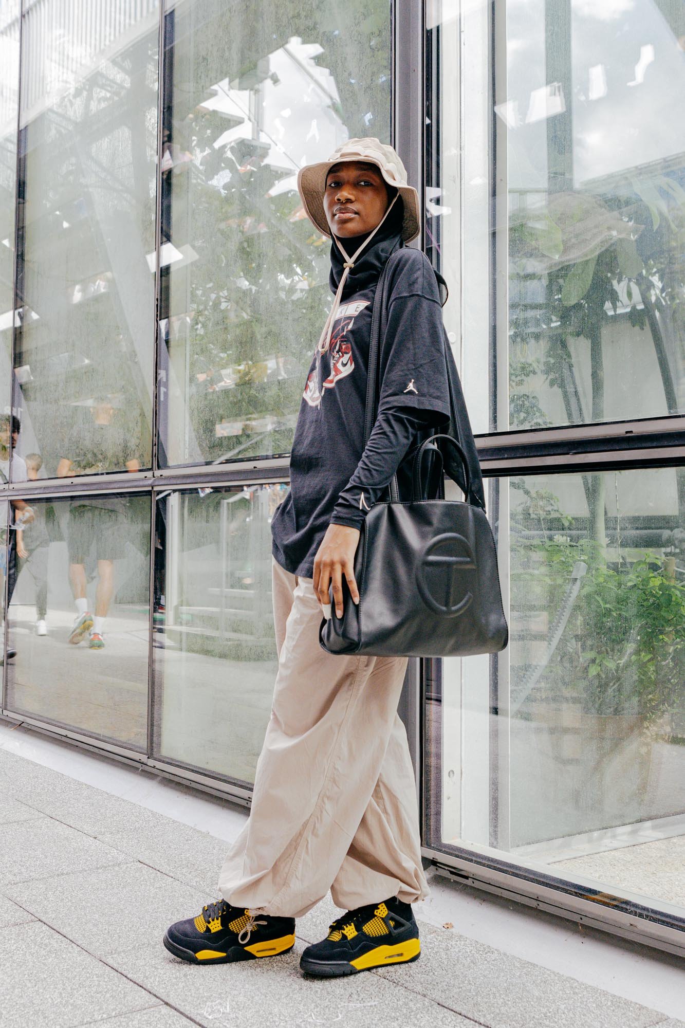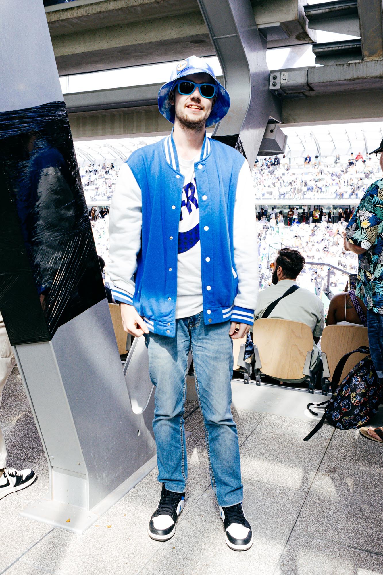 最後に来場者のスナップで、バスケカルチャーが感じられる最新スタイルをチェック。バスケットボールをルーツに持つシューズや、バスケジャージを取り入れたスポーティーな着こなしを楽しんでいました。