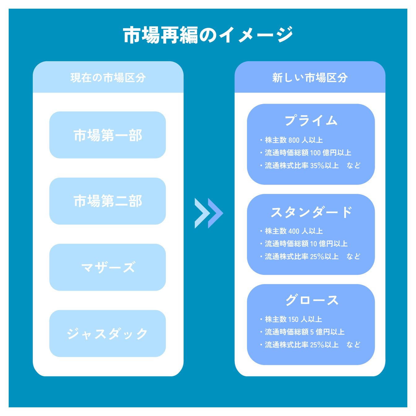 「市場第一部(東証1部)」「市場第二部(東証2部)」「マザーズ」「ジャスダック(スタンダード/グロース)」の4区分に分類。