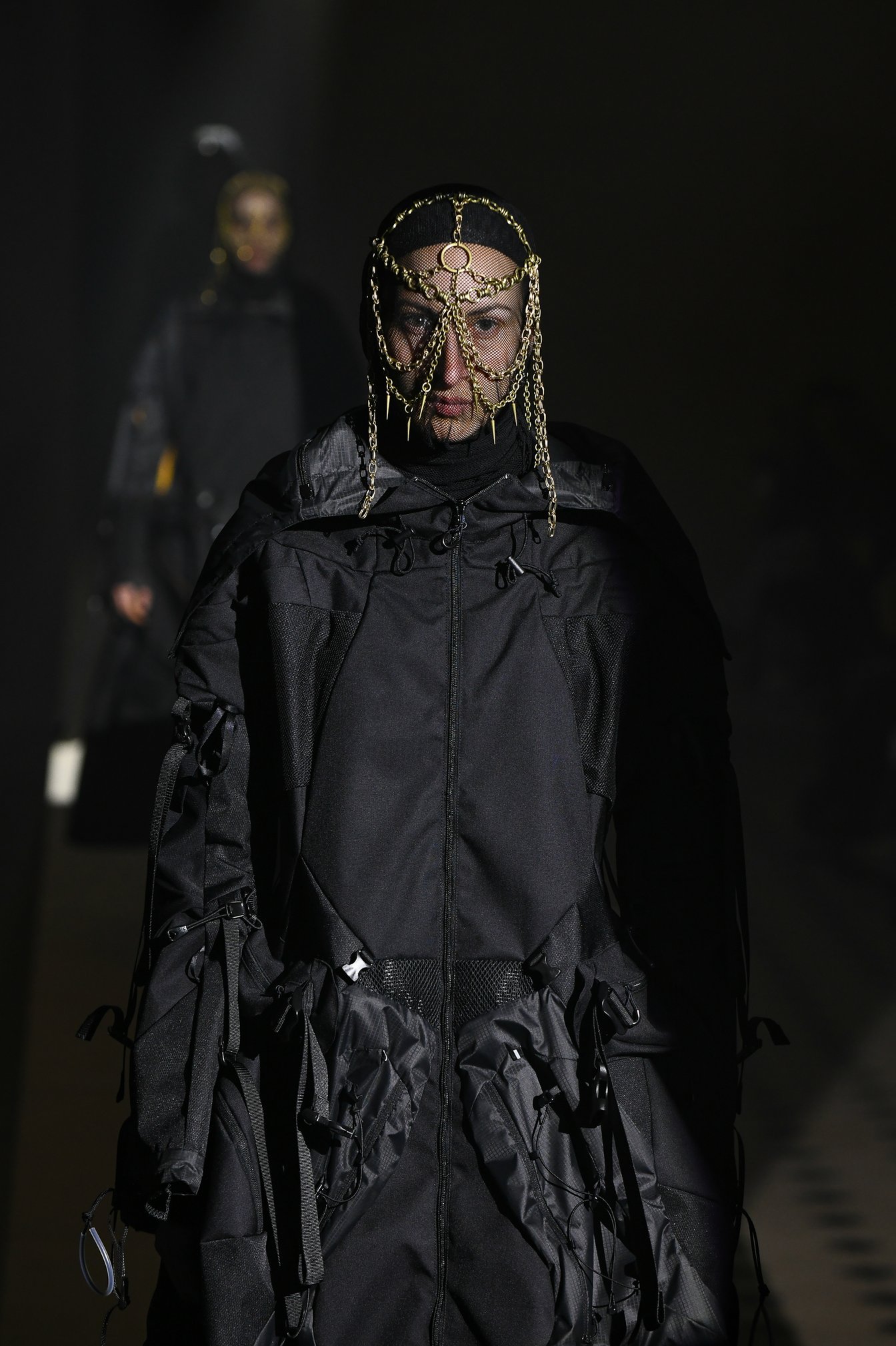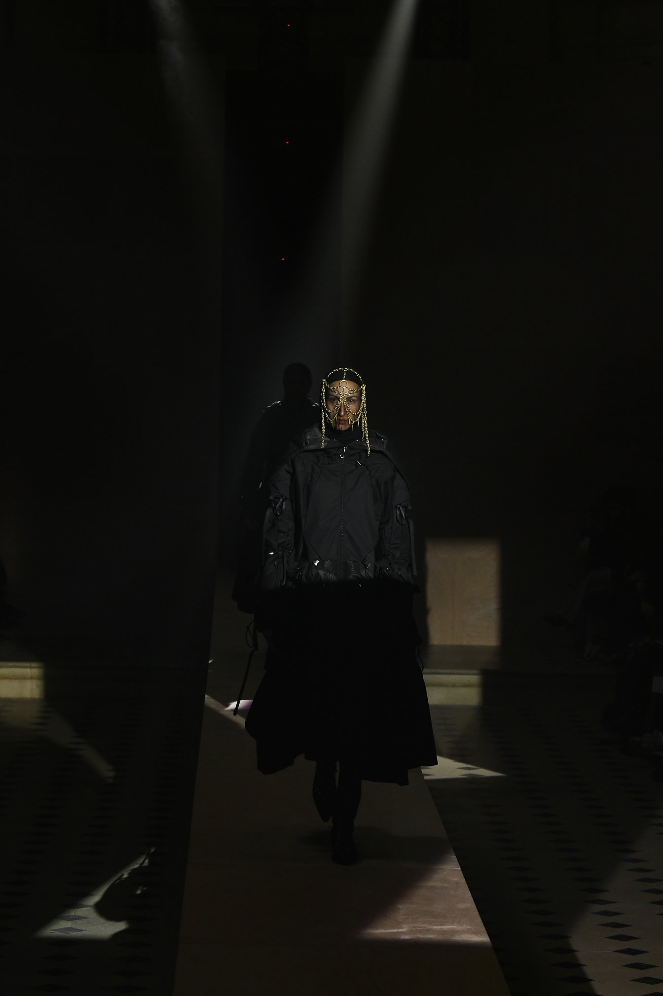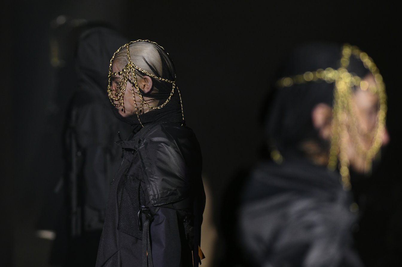 オープニングは、オールブラックの6人のモデルが登場。全身をプロテクトするロングコートをまとい、まるで鎧を身につけた戦士のような佇まい。頭部をベールやゴールドチェーンで覆った姿は、どこかエキゾチックなムードを漂わせる。
